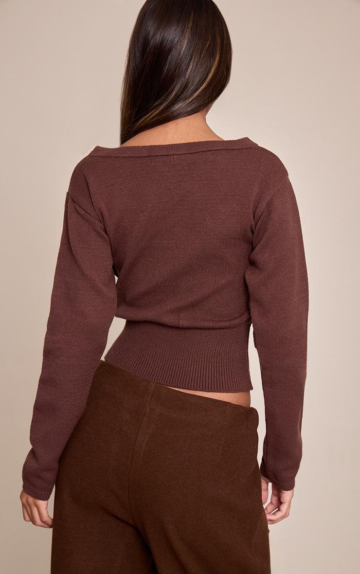 Perfect your everyday rotation with the petite chocolate stud detail knit sweater. Crafted in a rich chocolate knit, this piece features an elegant boat neckline detailing gold studs along with a cropped, fitted silhouette. Perfect for those chic daytime plans, this confident knit promises refined ease. Pair it with sleek wide-leg pants, sharp ankle boots, and delicate gold rings for a polished, on-point finish.Length approx 45.5cm/18inch (Based on sample size XS)Model wears size XSModel Height - 5ft 3inchp]:!mb-4inch>Brand: PrettyLittleThingCategory: KnitwearProduct type: T-ShirtColor: ChocolateMaterial: KnitOccasion: Day