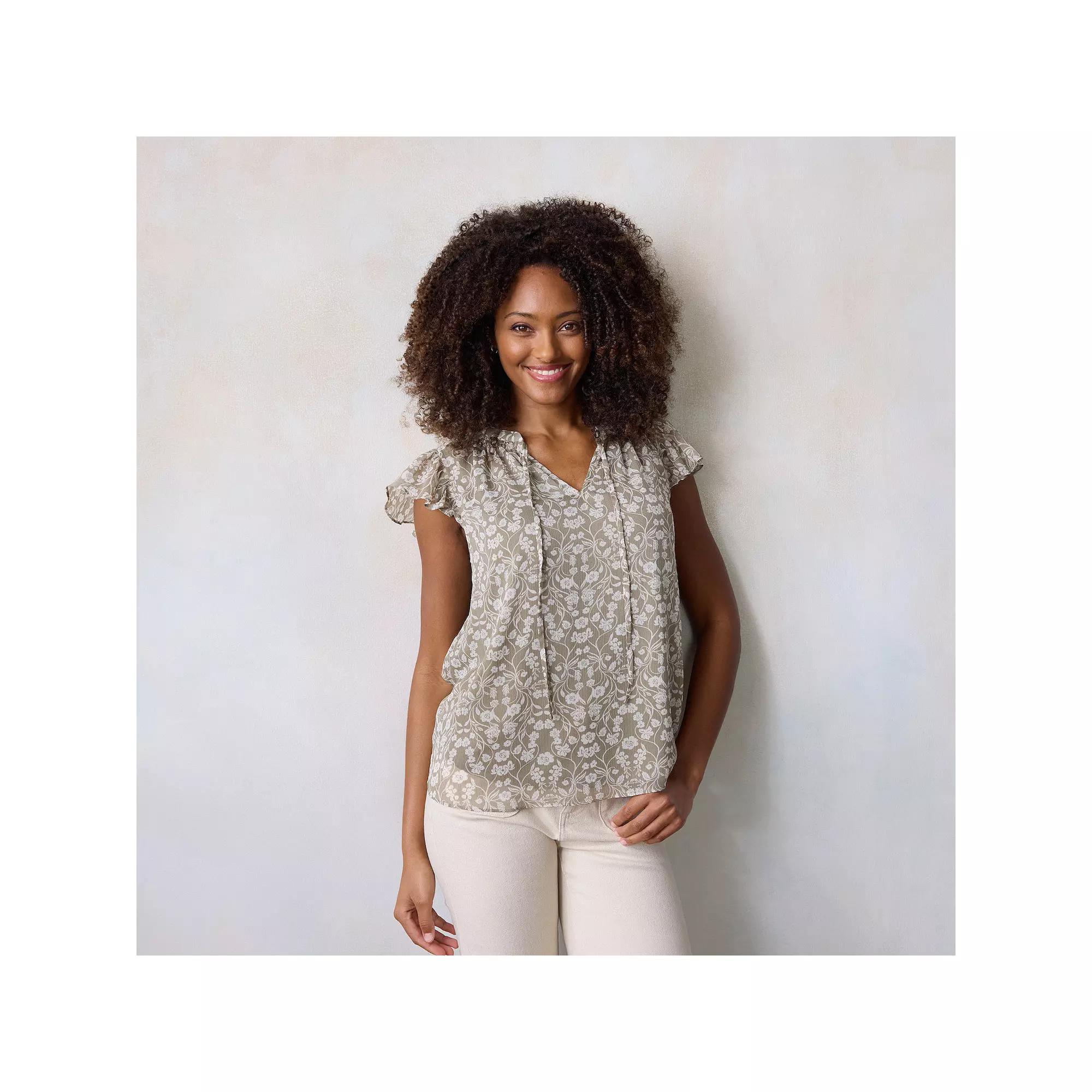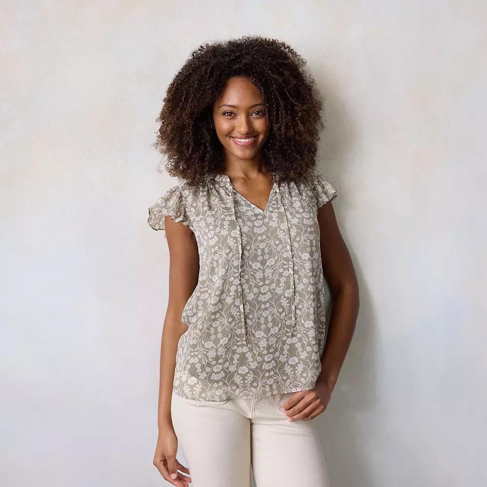 Dressing up your look is effortless with this Petite LC Lauren Conrad Tie Front Ruffle V-Neck Blouse. Click on this WOMEN'S GUIDE to find the perfect fit and more! - https://www.kohls.com/feature/womens-fit-guide.jsp. FIT & SIZE: Relaxed fit, 24.5-in. length from shoulder to hem, Rounded hemline. MATERIAL & CARE: Polyester, Fully lined, Machine wash. DETAILS: V-neck, Short ruffle sleeves, Imported. RESPONSIBLE Tested for harmful substances, STANDARD 100 by OEKO-TEX® CERTIFIED, Certification No. SE020 192725, Testing Institute: SE020 192725, www.oeko-tex.com/standard100 - https://www.oeko-tex.com/en/our-standards/oeko-tex-standard-100. Size: XXL Petite. Color: Sage Nouveau Vines. Gender: female. Age Group: adult. Material: WOVEN.