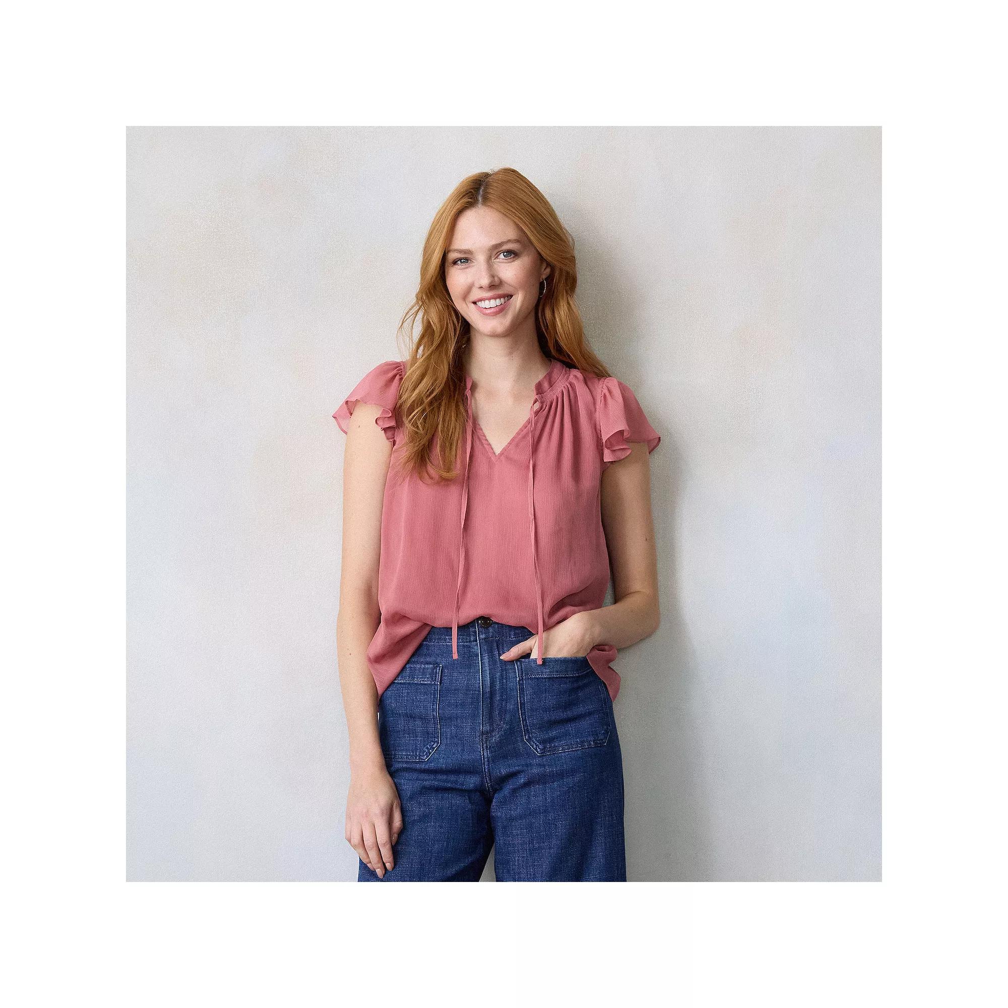 Dressing up your look is effortless with this Petite LC Lauren Conrad Tie Front Ruffle V-Neck Blouse. Click on this WOMEN'S GUIDE to find the perfect fit and more! - https://www.kohls.com/feature/womens-fit-guide.jsp. FIT & SIZE: Relaxed fit, 24.5-in. length from shoulder to hem, Rounded hemline. MATERIAL & CARE: Polyester, Fully lined, Machine wash. DETAILS: V-neck, Short ruffle sleeves, Imported. RESPONSIBLE Tested for harmful substances, STANDARD 100 by OEKO-TEX® CERTIFIED, Certification No. SE020 192725, Testing Institute: SE020 192725, www.oeko-tex.com/standard100 - https://www.oeko-tex.com/en/our-standards/oeko-tex-standard-100. Size: XS Petite. Color: Century Pink. Gender: female. Age Group: adult. Material: WOVEN.