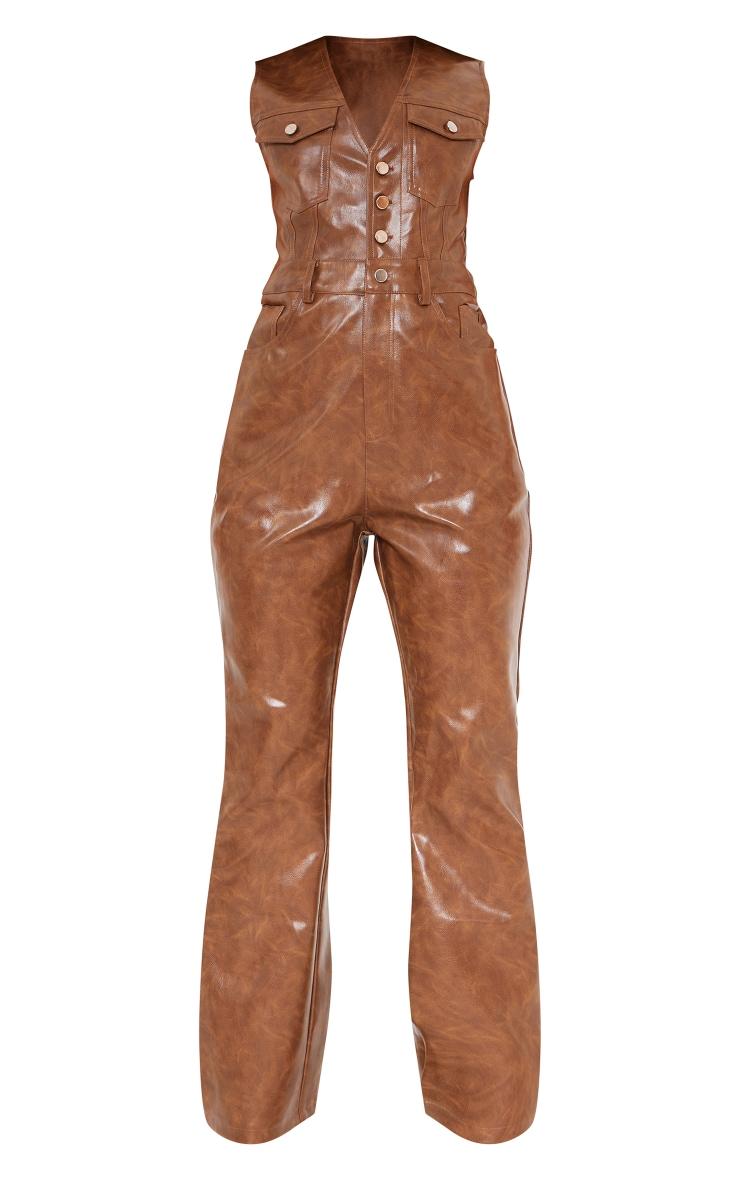 Be prepared to make everyone stop and stare this weekend with this petite washed brown faux leather jumpsuit. Its washed brown faux leather material is super flattering and so on trend right now. This jumpsuit also features button detailing which adds an instant touch of luxe to any look. Team this petite jumpsuit with clear heels and a shoulder bag for a flawless finish. Length approx 138.5cm/54.5inch (Based on a sample size UK 6) Model wears size UK 6/ EU 34/ AUS 6/ US 2Model Height - 5ft 2inchp]:!mb-4inch>Category: DressesProduct type: Wide Leg JumpsuitColor: Washed BrownNeckline: PlungeSleeves: SleevelessOccasion: Evening