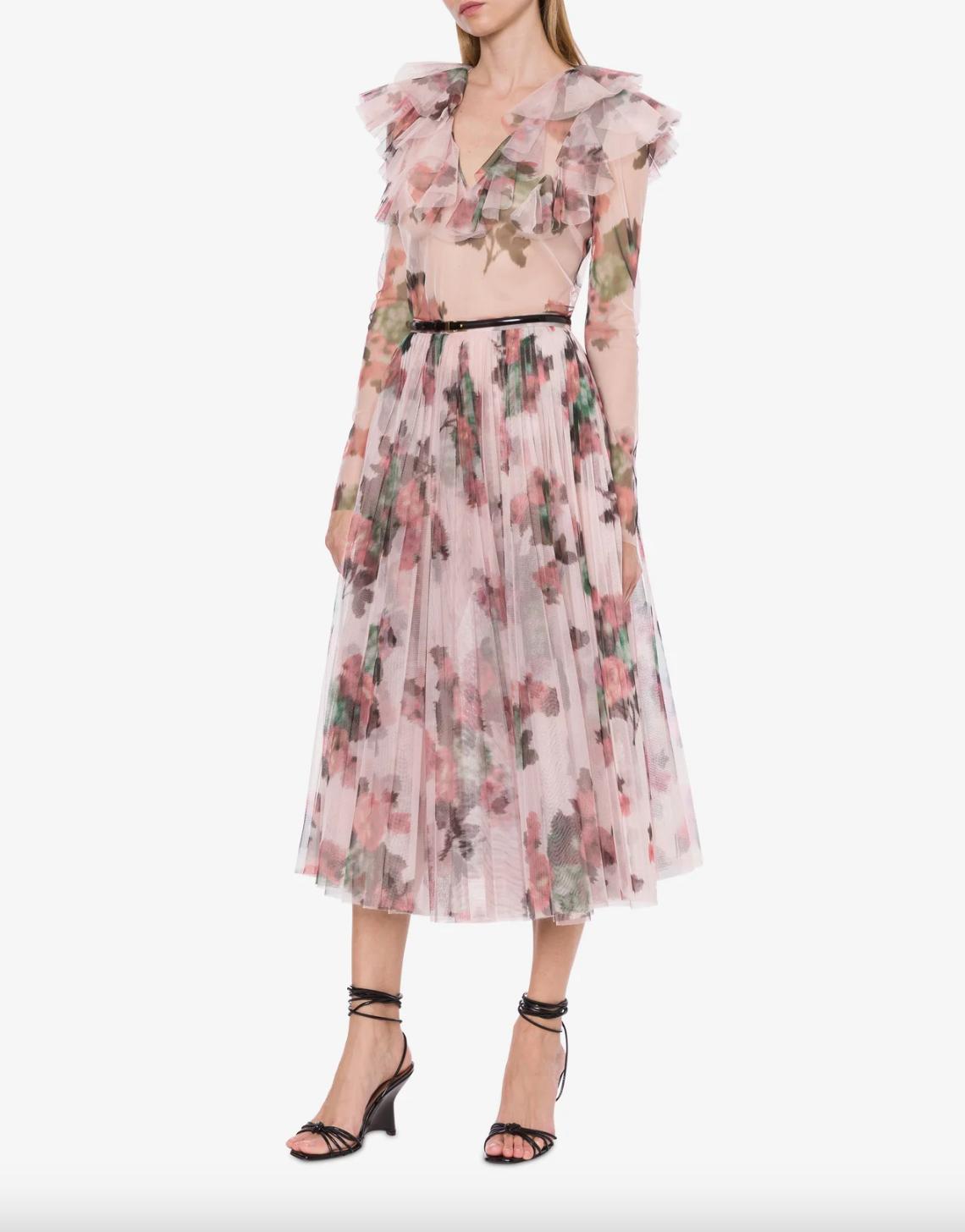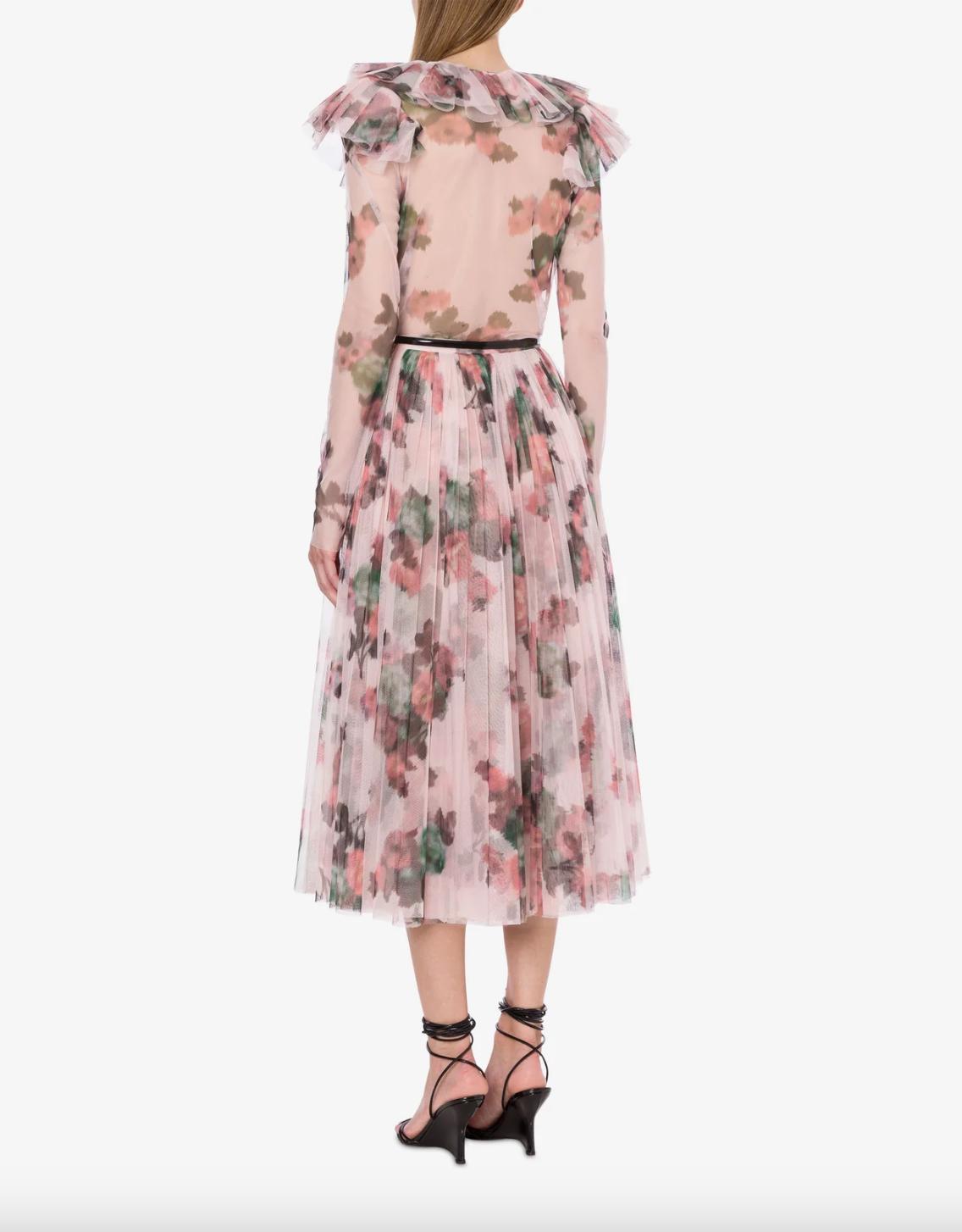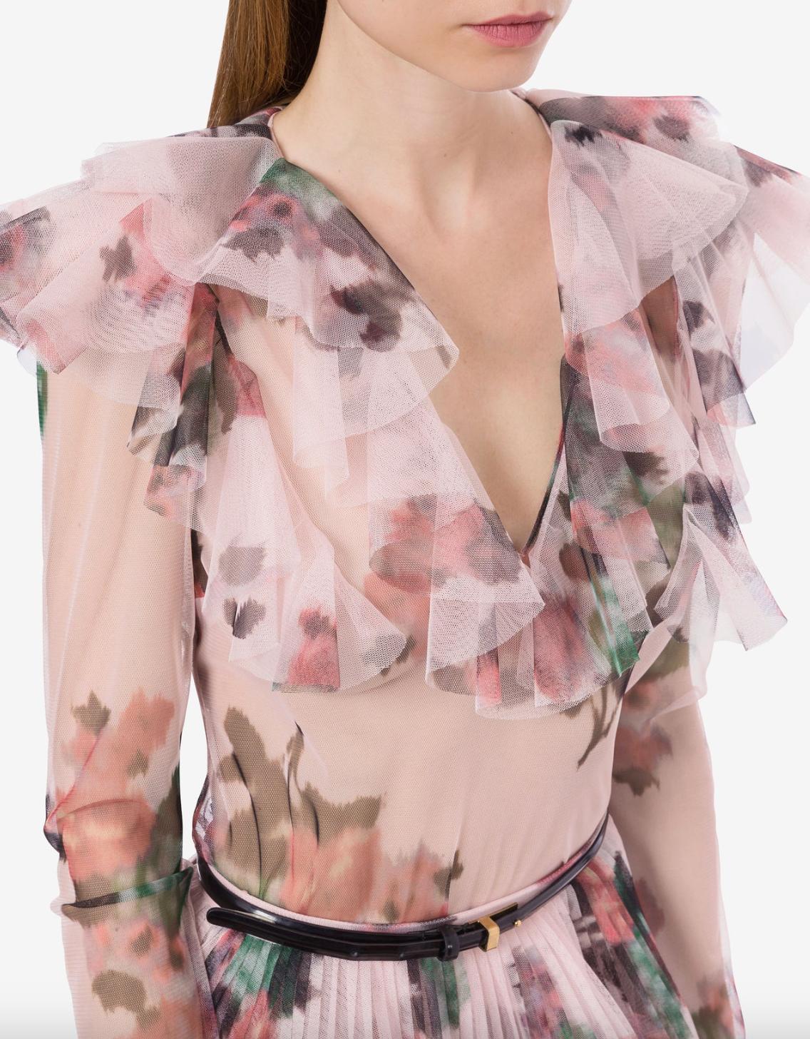 Tulle shirt with floral print on a pink background by Philosophy di Lorenzo Serafini. Ruffles on the top add a romantic vibe to the garment.