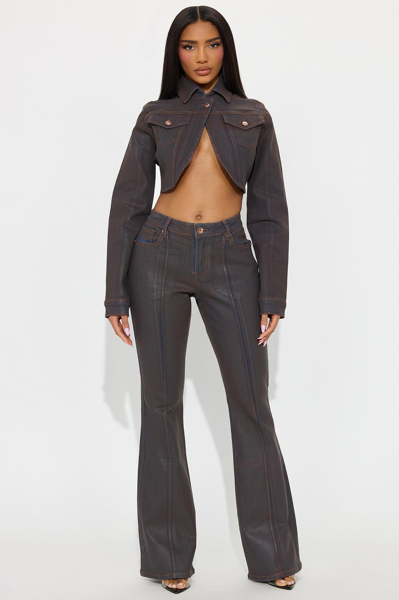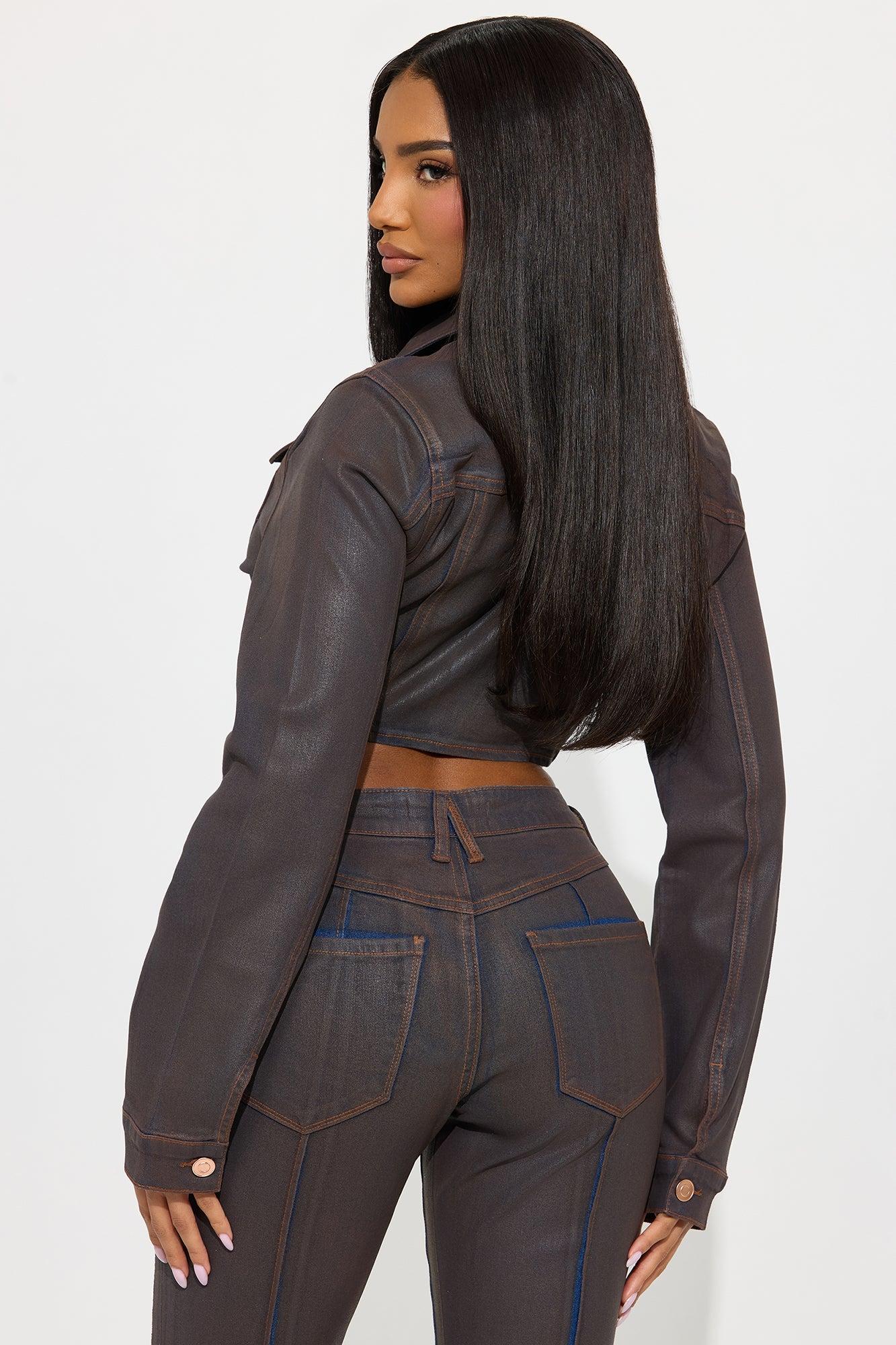 Available In Brown. Pair With Pinegrove Coated Stretch Flare Jeans Denim Bolero Jacket Low Stretch Front Flap Pockets Button Closure Long Sleeve Collar Cropped 60% Cotton 39% Polyester 1% Spandex Imported California Proposition 65WARNING: Cancer and Reproductive Harm - www.P65Warnings.ca.gov.