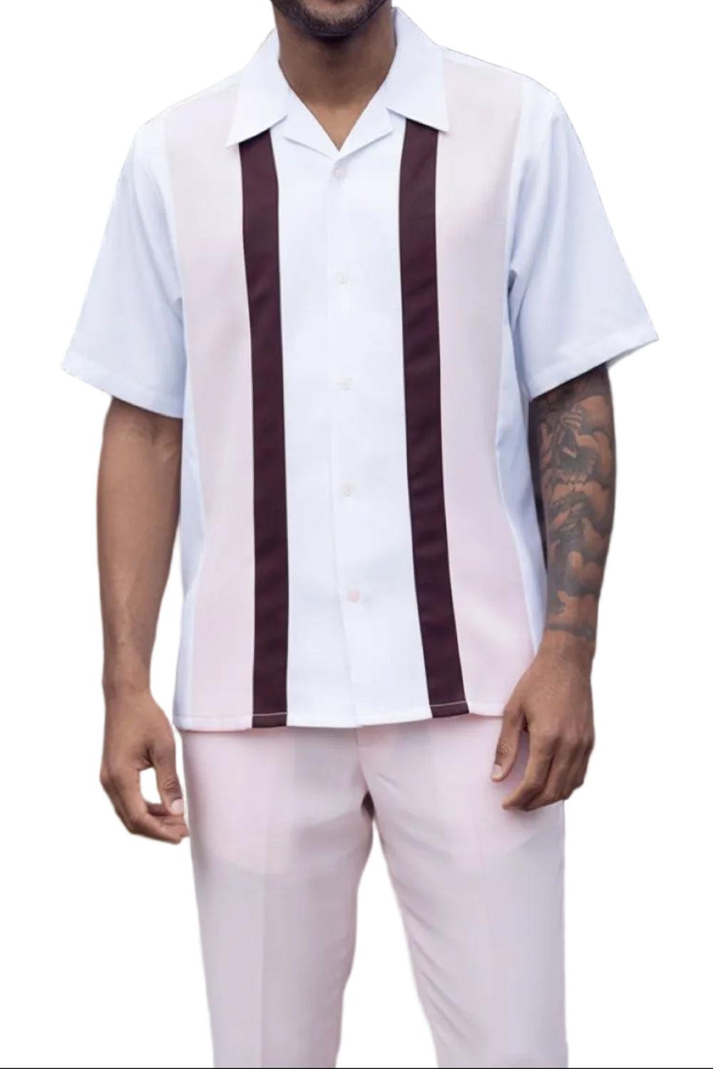 Pink/Brown Vertical Color Block Walking Suit 2 Piece Short Sleeve Set