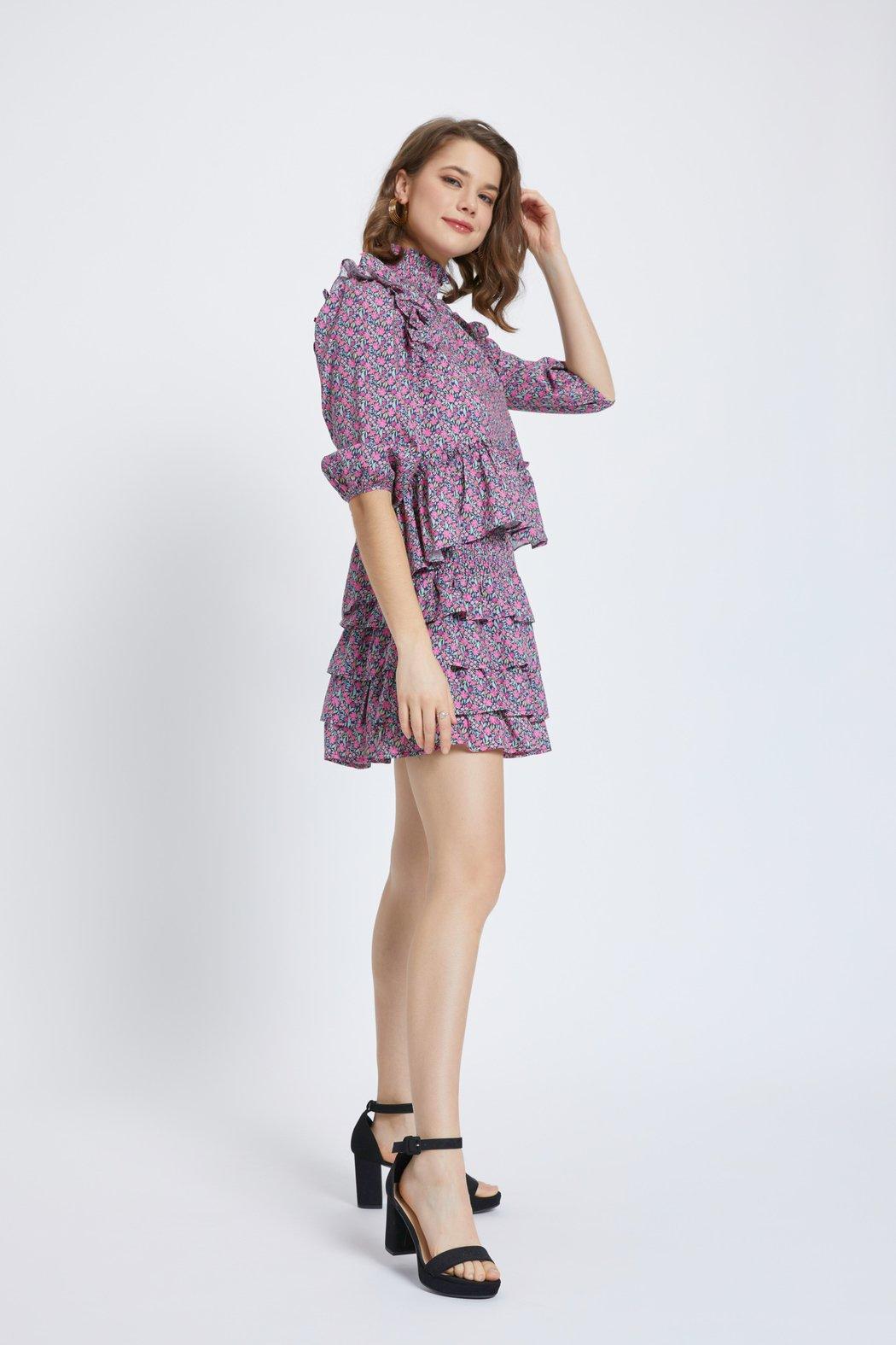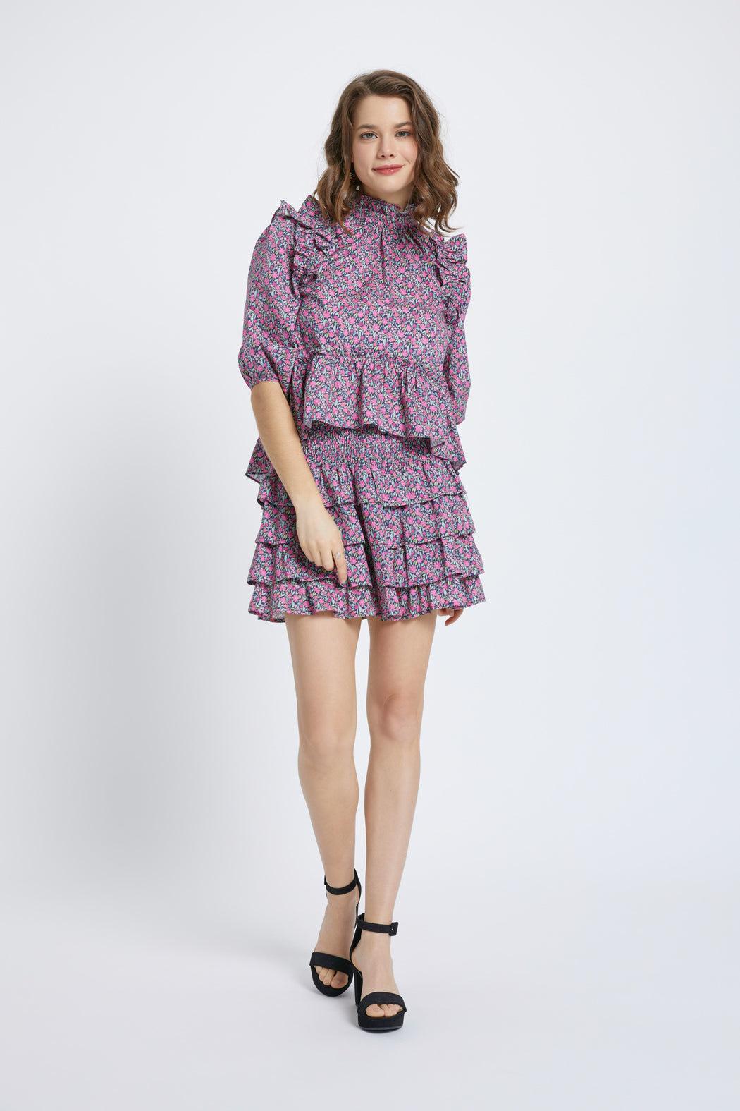 Adorned with a charming floral print, this set includes a ruffled high-neck top and a tiered mini skirt. The smocked waist and voluminous peplum add feminine touches, making it a playful and elegant choice for both daytime outings and casual events.