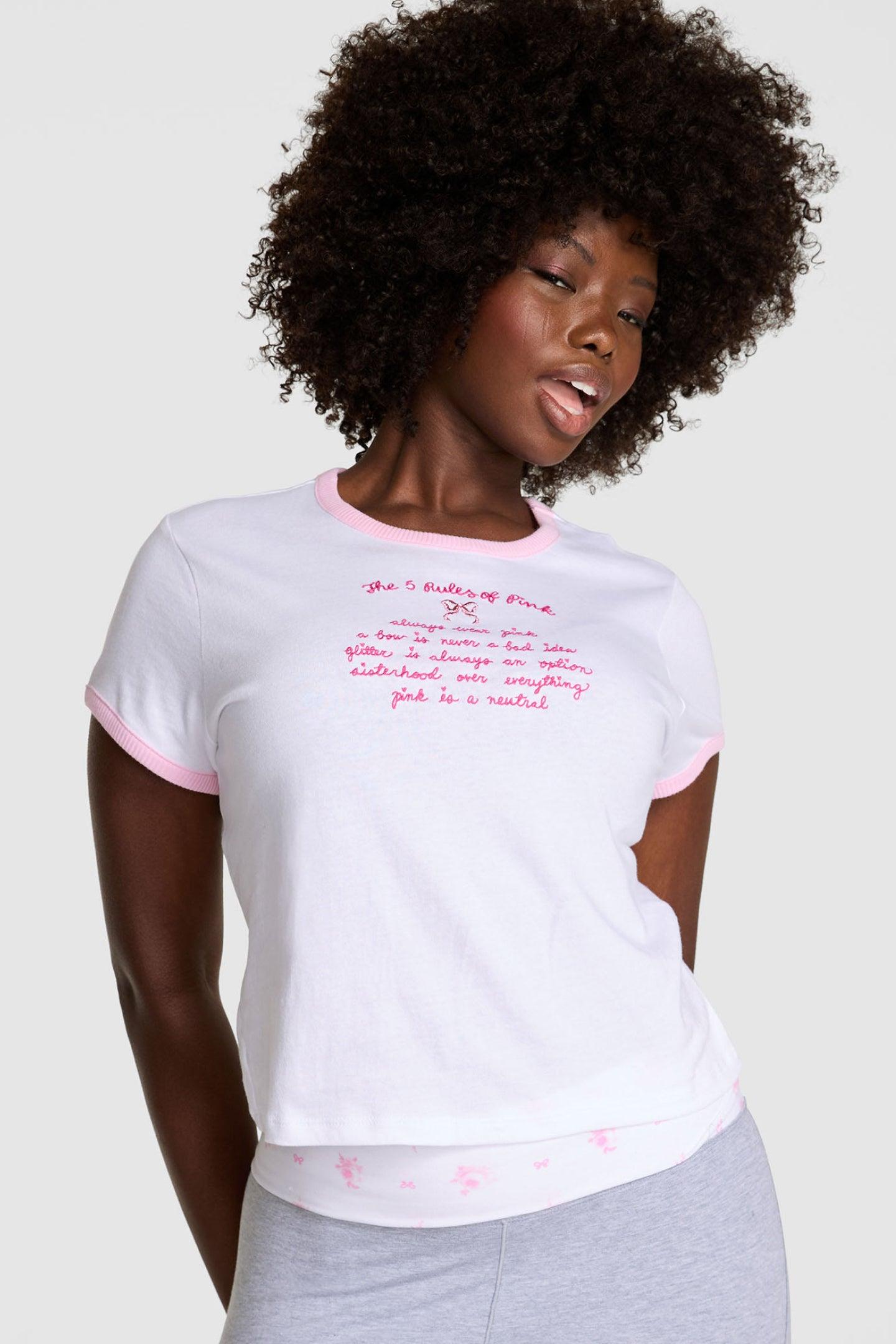 Introducing the Retro Cotton Tee from the exclusive, limited-edition PINK x LoveShackFancy collaboration. Big news: Your fave retro-style Tee got an extra girly update with cute PINK x LoveShackFancy deets. You've now got two new options to choose from—a sweet blingy dog design and the iconic "5 rules of pink" style. But honestly, why pick just one? We love this with the PINK x LoveShackFancy Sweatpants. Ummm, match made in heaven, much? Soft 100% cotton Crewneck Short sleeves Contrasting trim detail at neck and sleeves PINK x LoveShackFancy details Patch logo detail at lower hem Fitted silhouette Imported