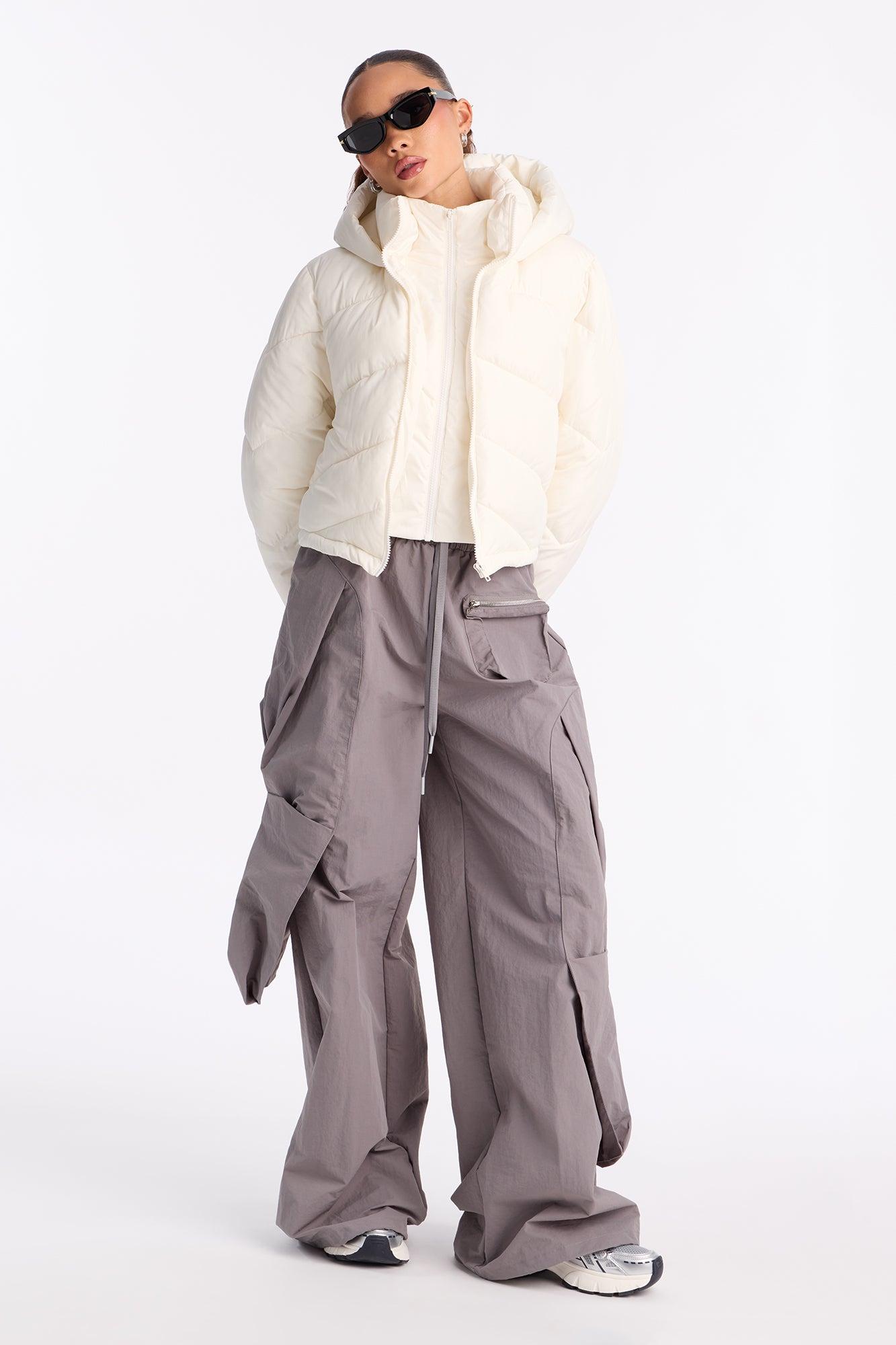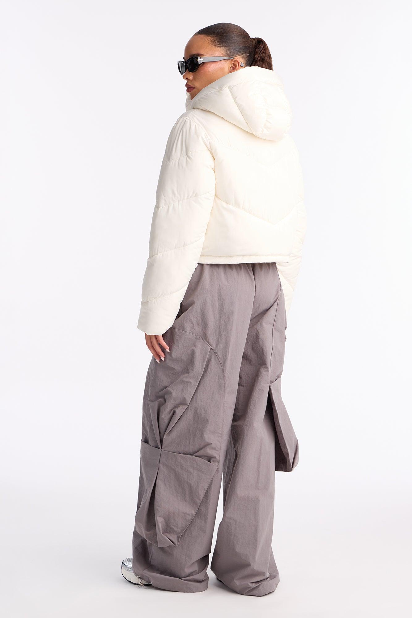 Available In Brown, Ivory And Red. Nylon Blend Puffer Jacket Hooded Long Sleeves Double Zipper Closure Layered Fully Lined Cropped Self/Lining/Filling: 100% Polyester Imported California Proposition 65WARNING: Cancer and Reproductive Harm - www.P65Warnings.ca.gov.