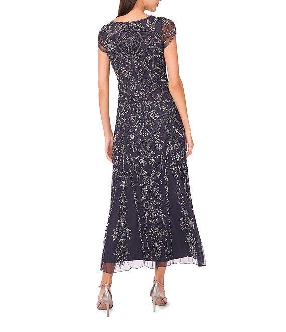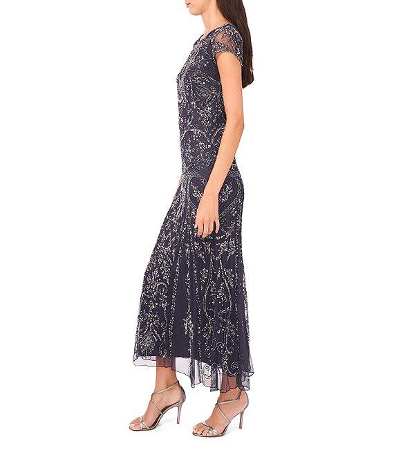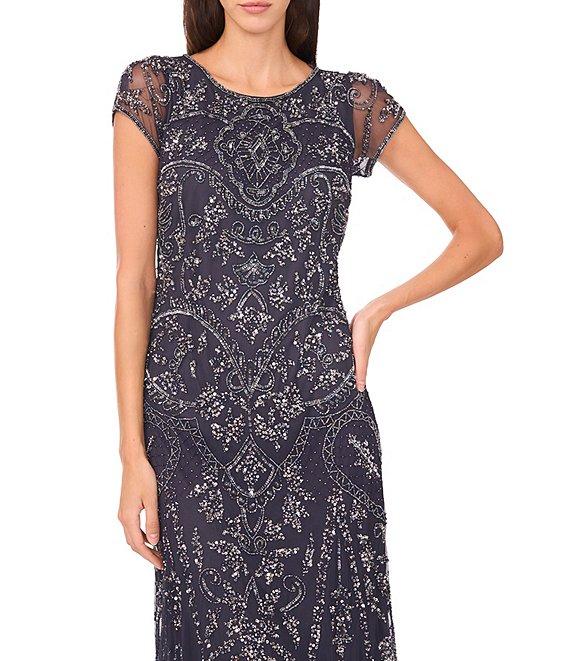 From Pisarro Nights, this dress features: Beaded mesh fabrication Sheath silhouette Boat neckline short illusion sleeves Fully lined Flutter hemline Center back zip closure Approx. 56" length Rayon Spot clean Imported.