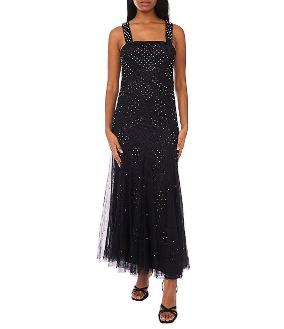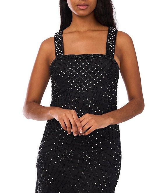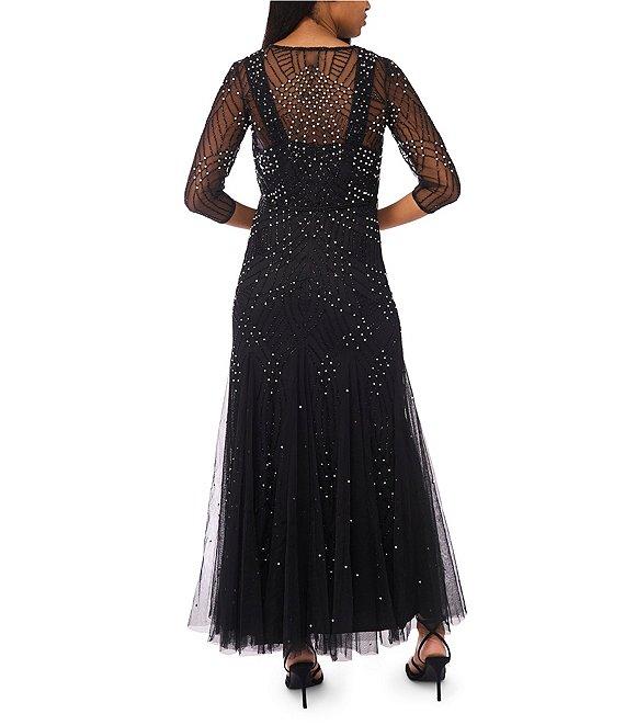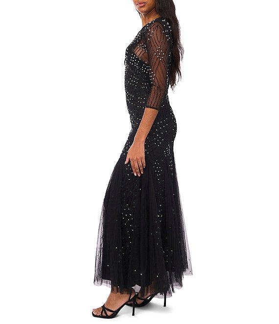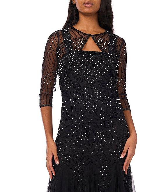 Pisarro Nights Pearl Beaded Mesh Crew Neck 3/4 Sleeve Sheath Jacket Dress