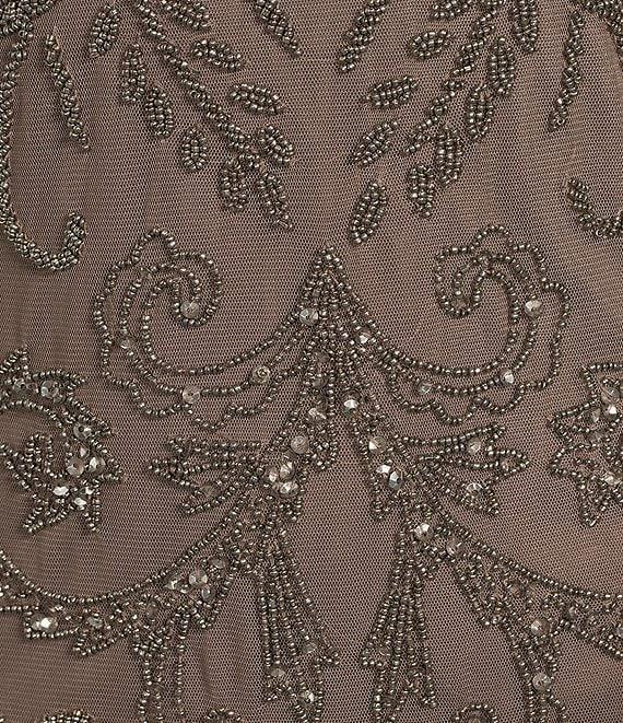 From Pisarro Nights Petite, this dress features: Beaded mesh fabrication Illusion neckline Short sleeves Lined Midi length Center back zipper closure Approx. 47" in length Polyester Spot clean Imported.