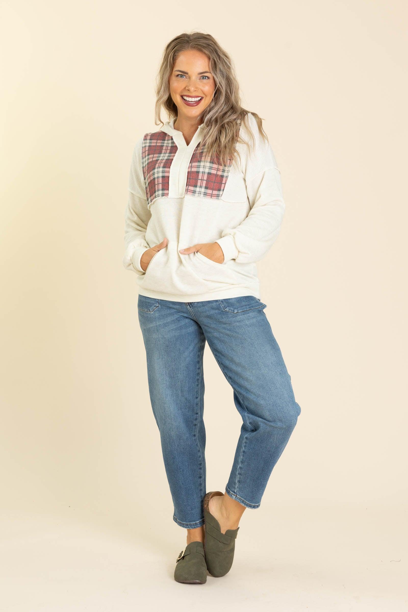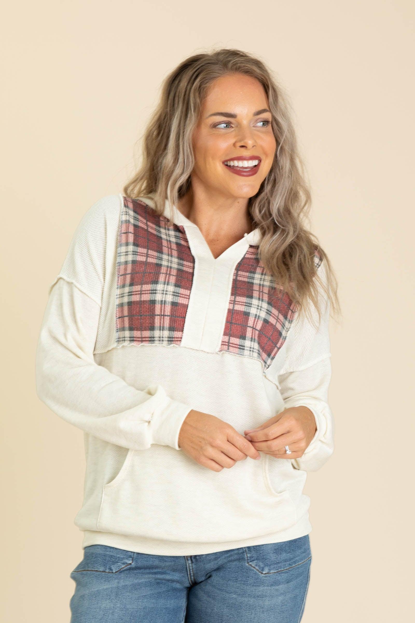 Product Details Colors: Ivory, Wine, Hunter Green, Beige/ Olive, Rust, Sage, Beige Print: Plaid Neckline: V-Neck With Hood Sleeve: Long Sleeve Hemline: Straight Brand: Lovely Melody Material and Care 83% Polyester 12% Rayon 5% Spandex Machine Wash Cold Tumble Dry Low Made In The USA Size and Fit Small: Bust 38" Waist 36" Length 26.5" Medium: Bust 40" Waist 38" Length 27" Large: Bust 42" Waist 40" Length 27.5" X Large: Bust 44" Waist 42" Length 28" Erica is 5’7” and wearing her true size small