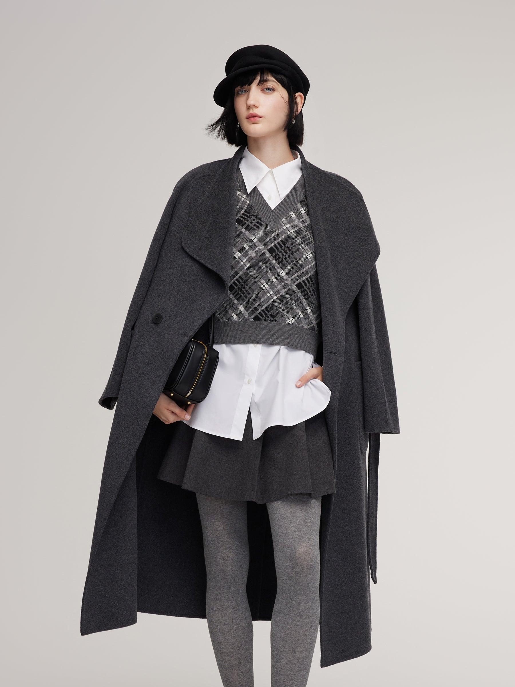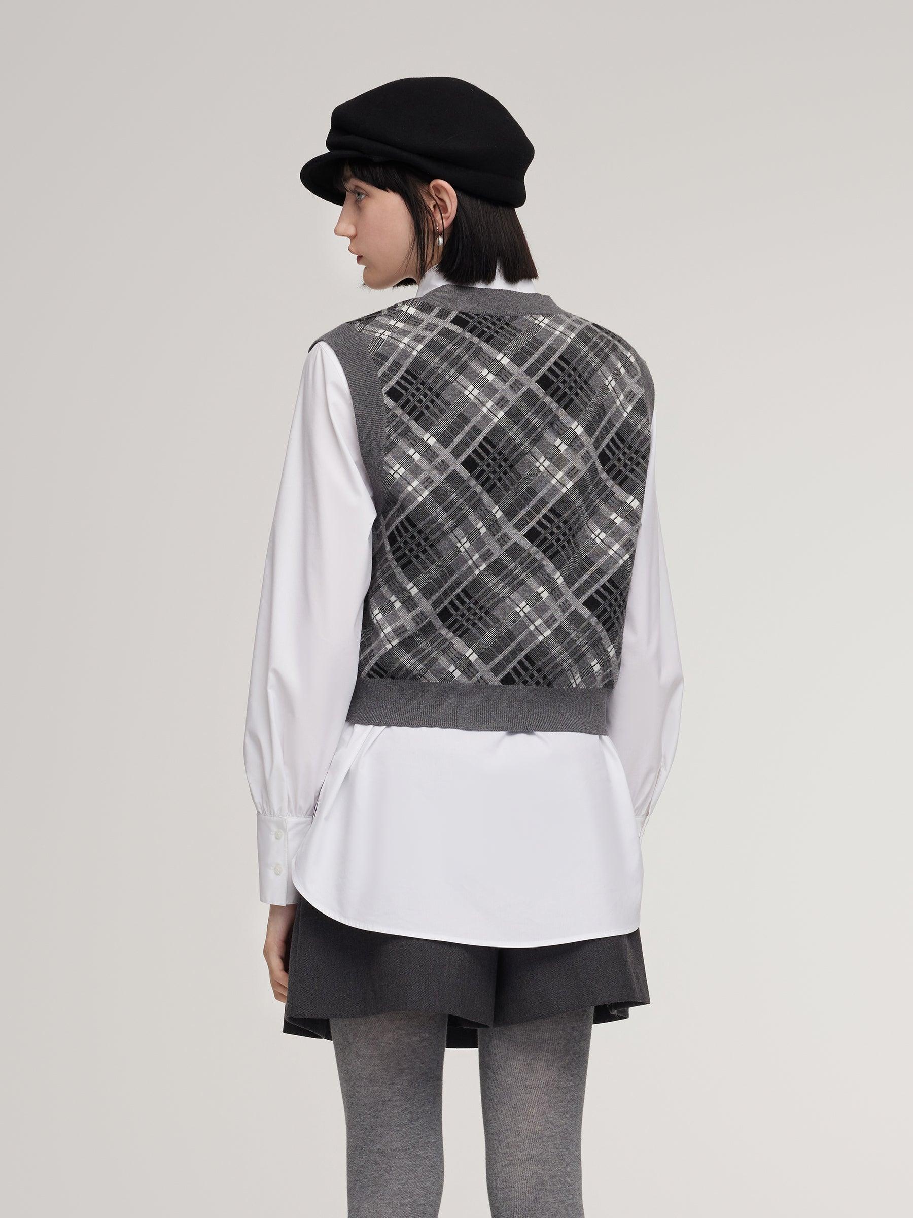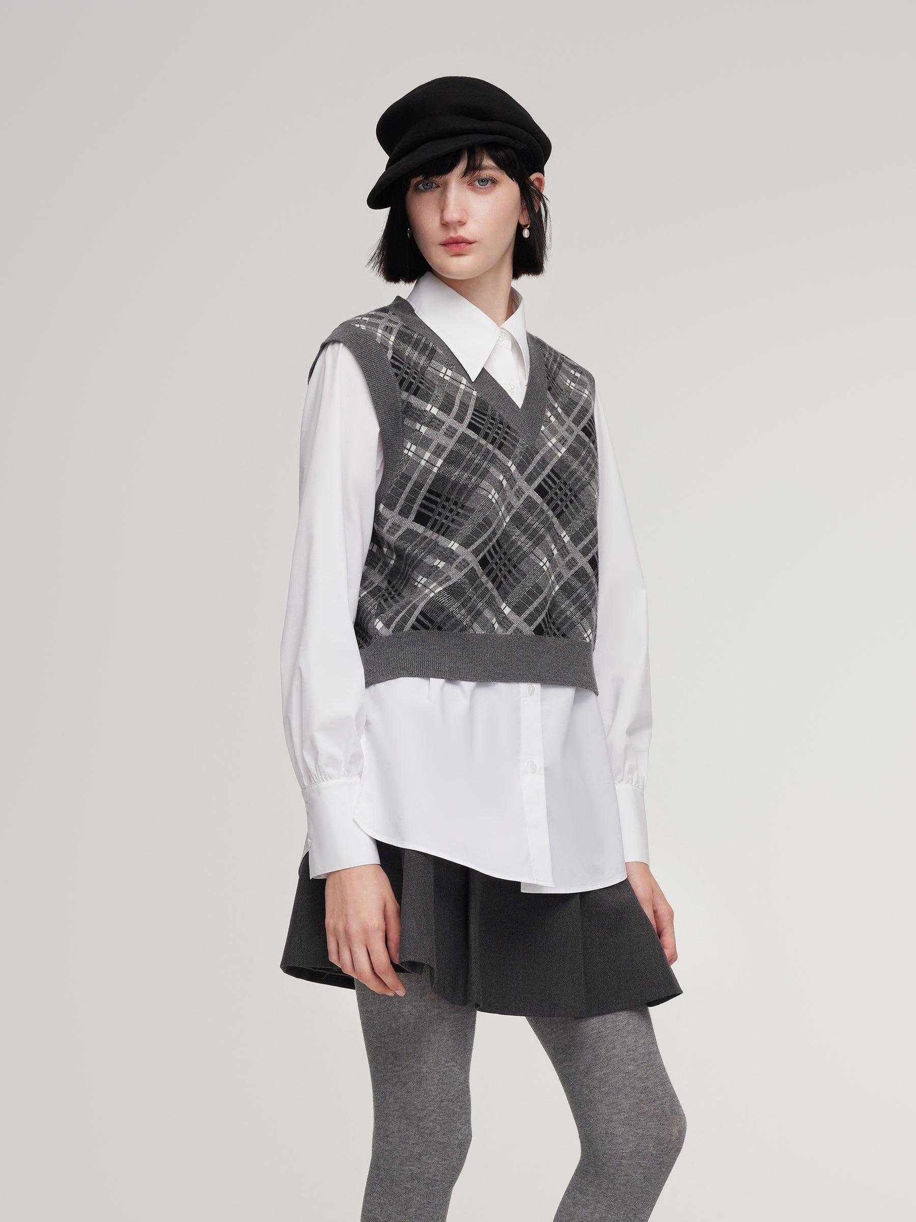-V-Neck vest and shirt two-piece set -Soft and comfortable -Straight fit This two-piece set comes with a plaid vest and a long, relaxed-fit shirt for effortless layering. The vest is cropped and fitted, enhancing waist proportions, while the plaid pattern adds classic, collegiate-inspired sophistication. The shirt's lo