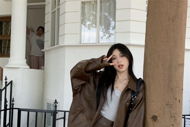 Buy Moon City Plain Faux Leather Zip Jacket / High Rise Pleated Mini A-Line Skirt at YesStyle.com! Quality products at remarkable prices. FREE Worldwide Shipping available!