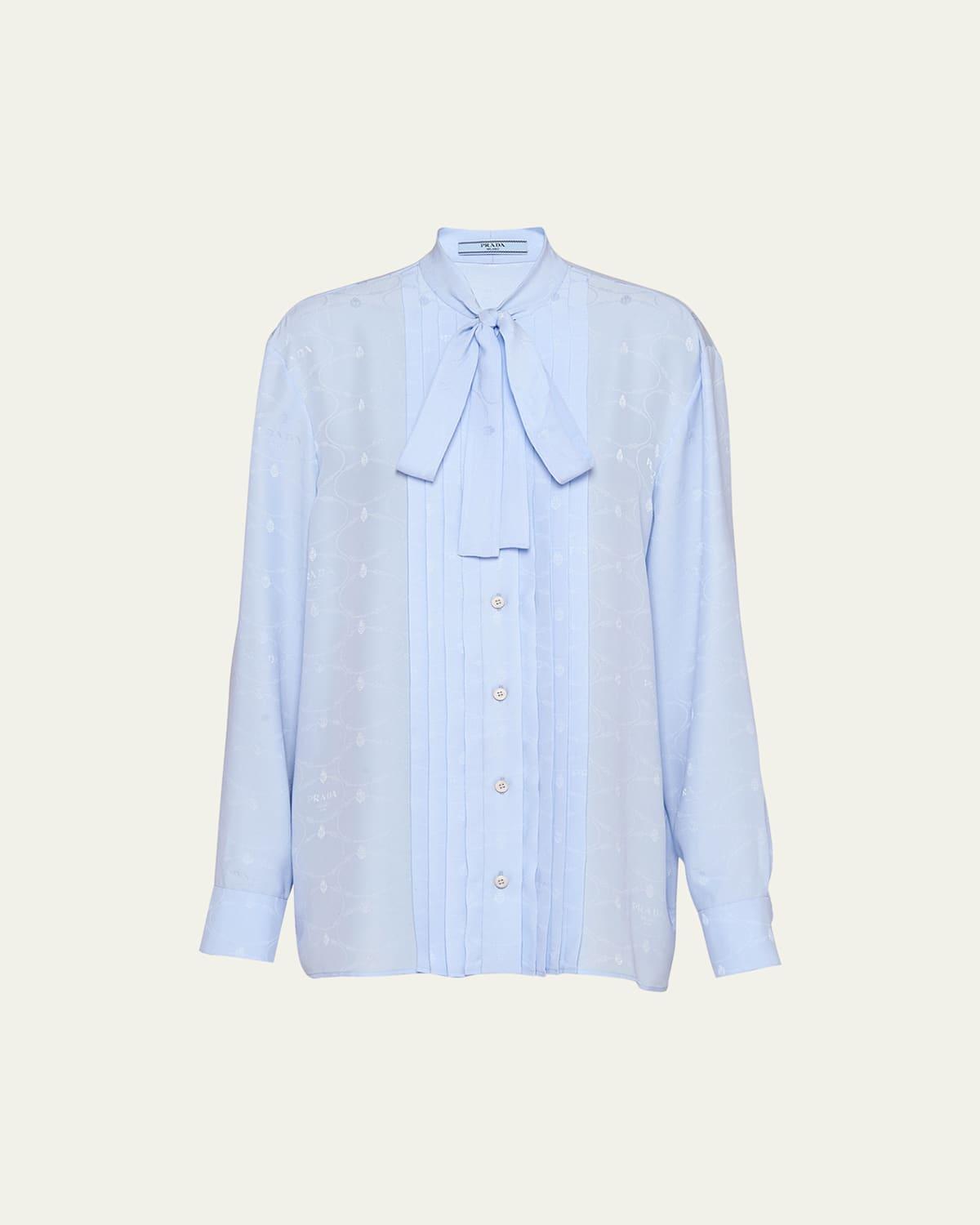 This soft crepe de chine blouse enhanced by the jacquard Savoy knot logo repeated in a delicate all-over pattern expresses sophisticated, feminine allure. The classic silhouette is reinterpreted with a loose fit, while the scarf neck adds a touch of timeless elegance. Straight fit Scarf neck Front button closure Long sleeves with small buttons All-over Savoy knot logo detail Flat pleats on the front Scarf on the front Made in Italy This product is not eligible for extended holiday returns. Lsd Rtw - Prada Rtw > Prada > Saks Fifth Avenue > Barneys. Prada. Color: Blue. Size: 4.