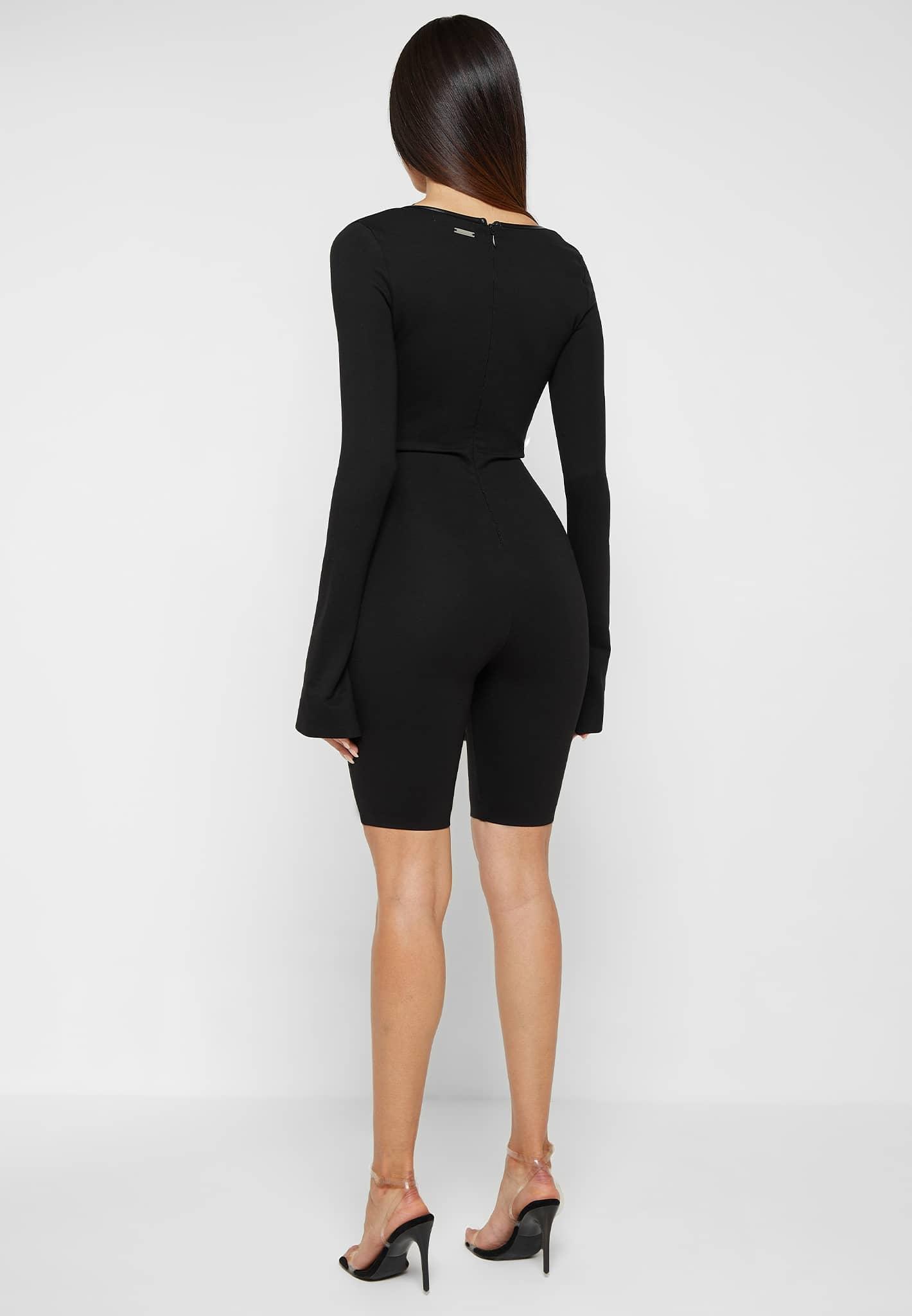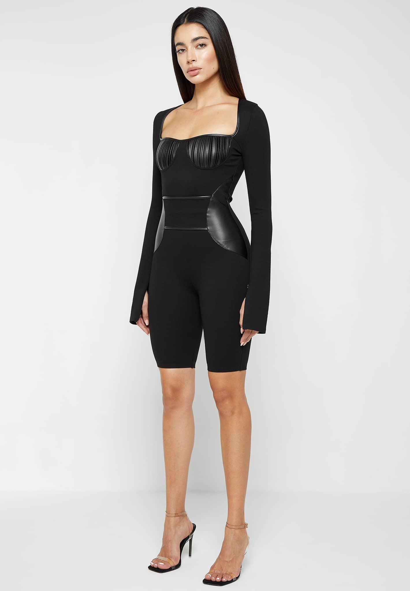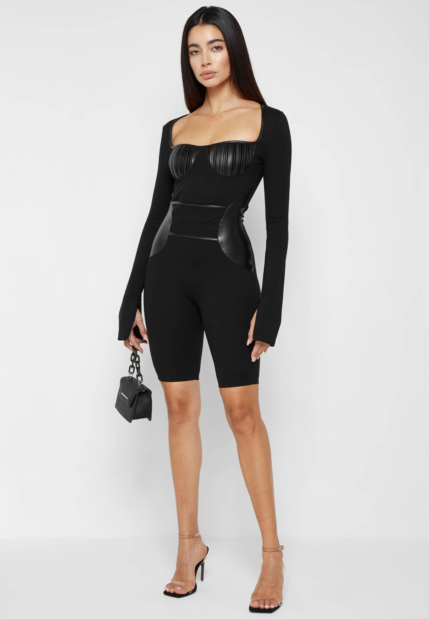 Featuring vegan leather contouring, this figure cinching bandage playsuit will accentuate your silhouette. The sweetheart neckline combined with the pleated bust cups is a complimentary feature of this playsuit. Playsuit Silhouette Signature Cinching Bandage Fabric Square Neckline Pleated Vegan Leather Bust Cups Bandage Belt with Vegan Leather Piping Vegan Leather Side Contour Panelling Concealed Zips on Sleeves Concealed Zip at Centre Back Silver Manière De Voir Branded Plaque 61% Viscose, 39% Nylon / 55% Polyester, 45% PUAlways check the care label for wash instructions.