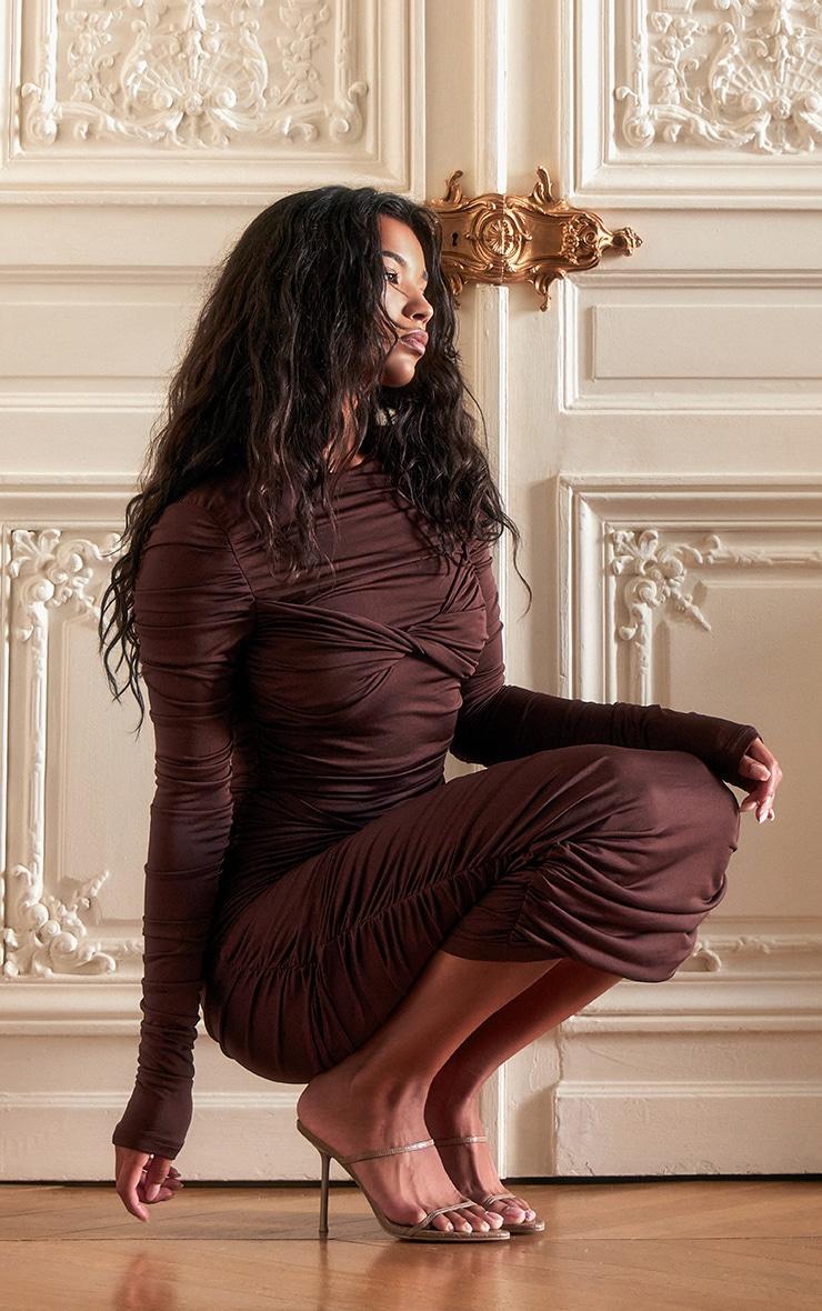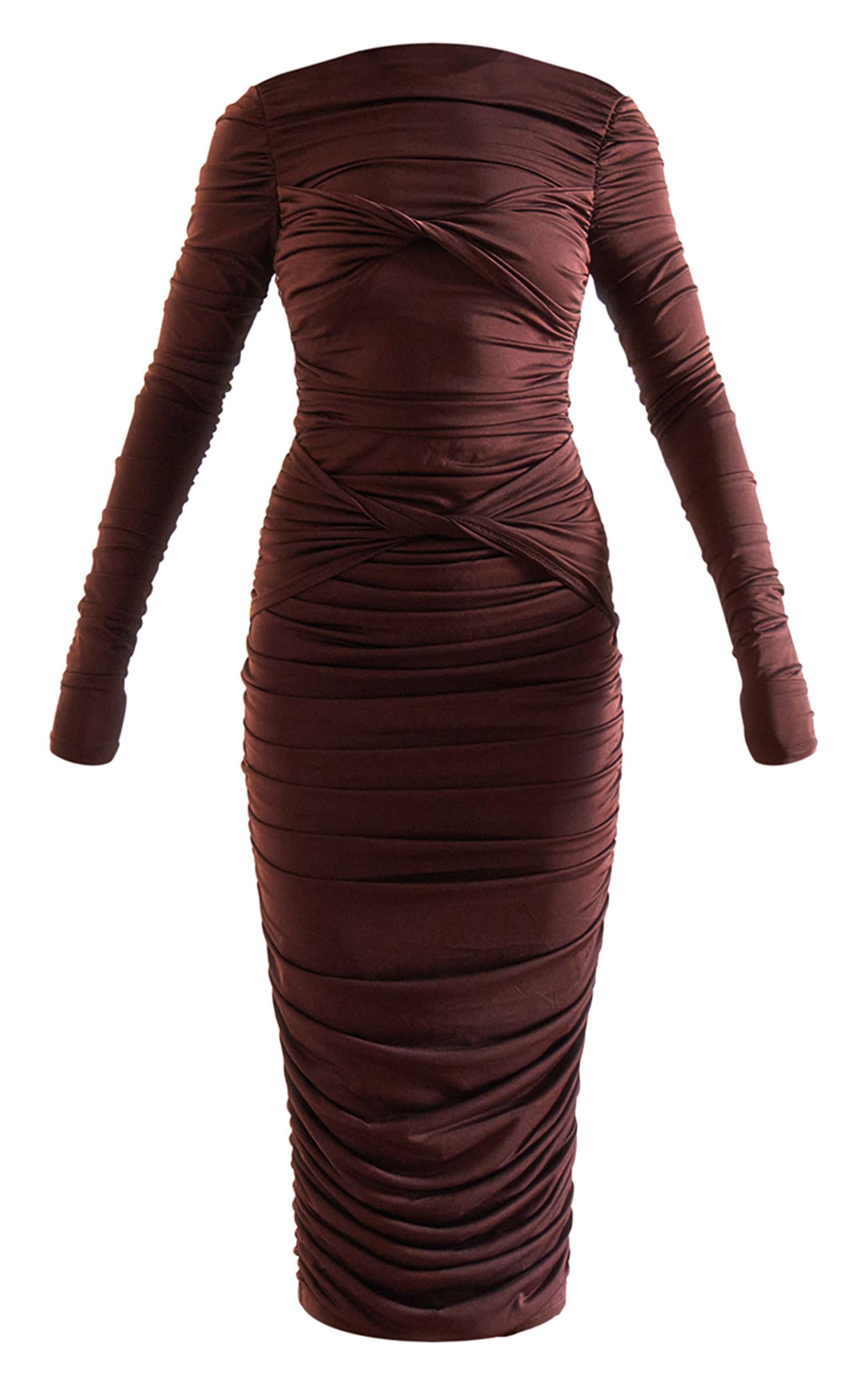 The modern wardrobe calls for pieces that command attention through considered design. This dark brown midaxi dress features a double-layer slinky material that drapes elegantly, while the asymmetrical panel adds a touch of architectural intrigue. Its rich, earthy tone offers a grounding element to your look. Elevate this piece with delicate gold jewelry from our accessories collection for an evening ensemble that exudes understated sophistication. Length approx 135cm/53inch (Based on a sample size UK 8) Model wears size UK 8/ EU 36/ AUS 8/ US 4Model Height - 5ft 6inchp]:!mb-4inch>Brand: PrettyLittleThingCategory: DressesProduct type: Bodycon DressColor: Dark BrownMaterial: Slinky JerseyDesign: PlainNeckline: CrewSleeves: LongOccasion: Evening