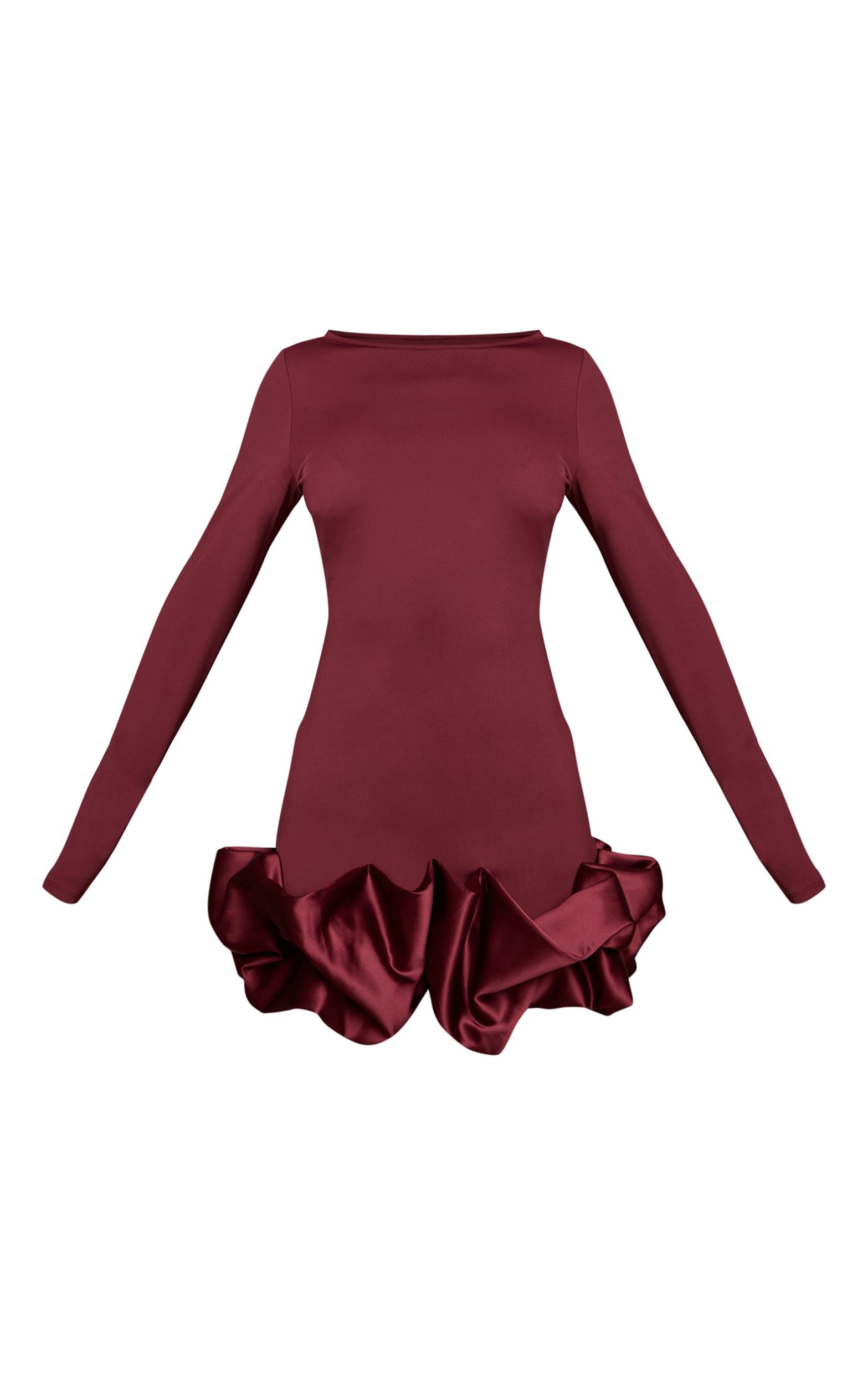 Let your evening look speak volumes with the plum satin puffball bodycon dress. This plum piece features a sleek bodycon silhouette, long sleeves, a high boat neckline, and a statement satin puffball hem. Perfect for making a memorable entrance at your next exclusive event or sophisticated dinner. Pair with sharp gold heels and elegant hoops to complete a confident, elevated ensemble.Length approx 81.5cm/32inch (Based on sample size US 4)Model wears size UK 8/ EU 36/ AUS 8/ US 4Model Height - 5ft 6inchp]:!mb-4inch>Brand: PrettyLittleThingCategory: DressesProduct type: Bodycon DressColor: PlumMaterial: Slinky JerseyNeckline: Boat NeckSleeves: LongOccasion: Occasion