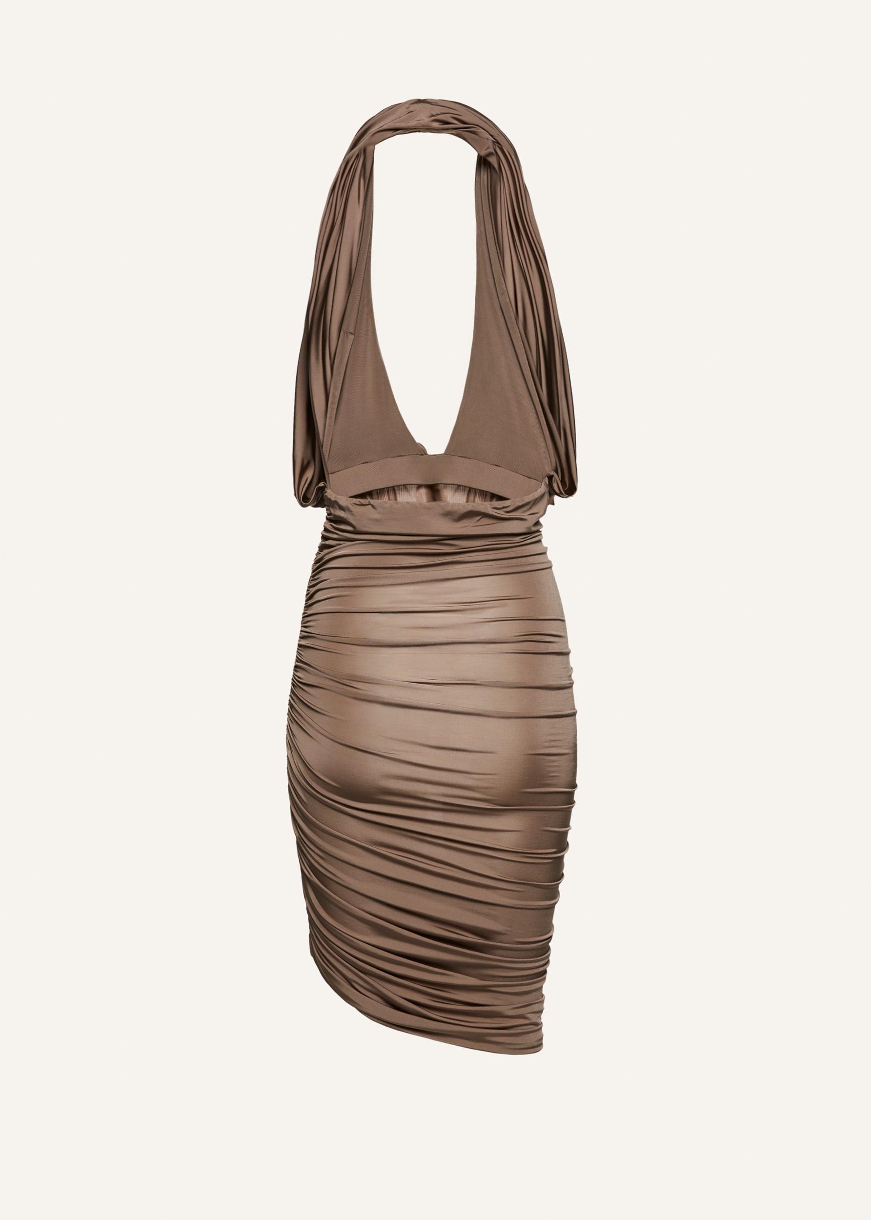 A 90's style cowl neck halter dress uses swaths of gathered jersey to shape a deep plunging neckline and open back, while a gathered effect down the side of the fitted midi skirt creates a flattering and feminine silhouette.