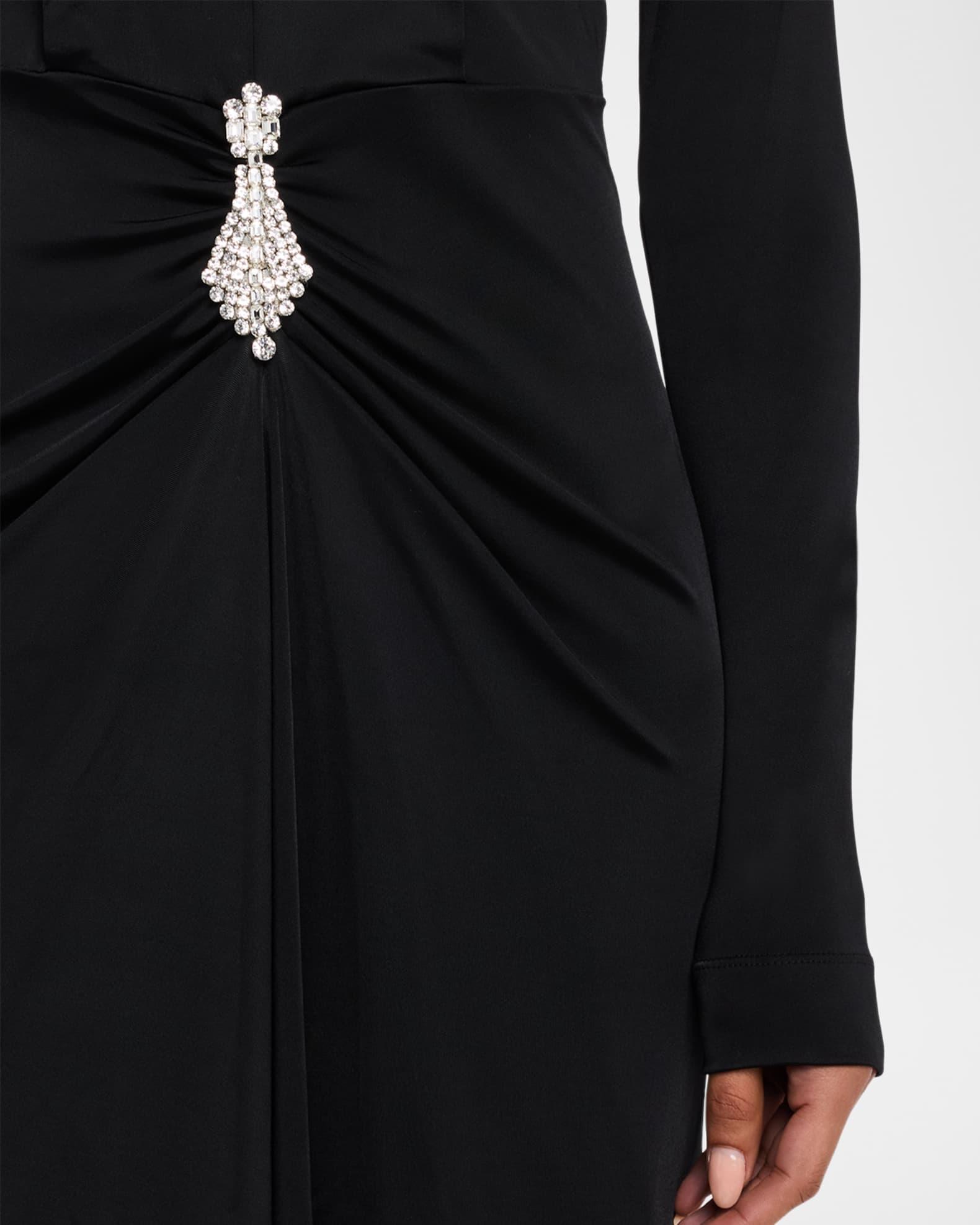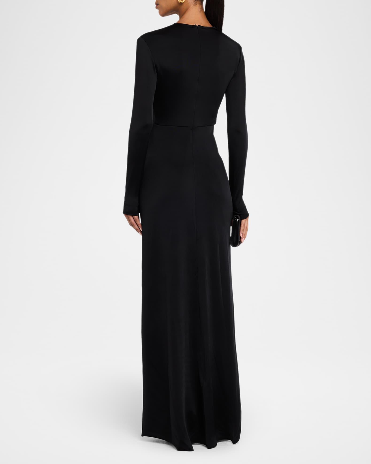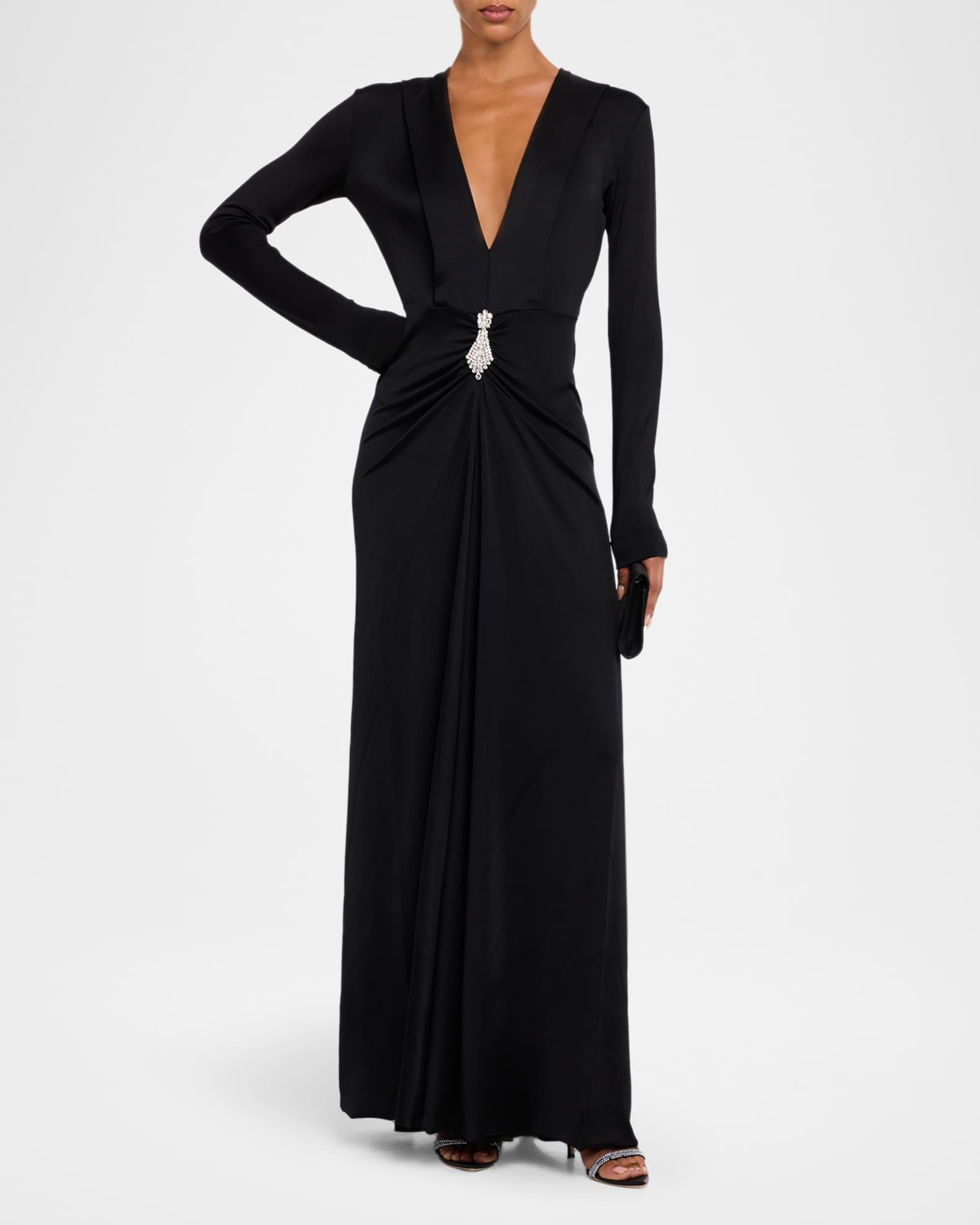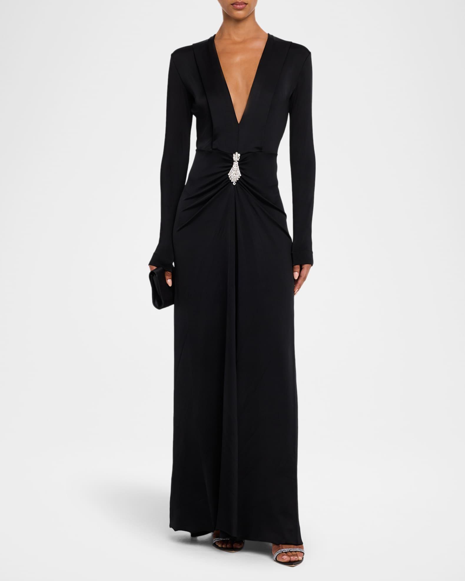Plunging Gathered Crystal Long-Sleeve Gown