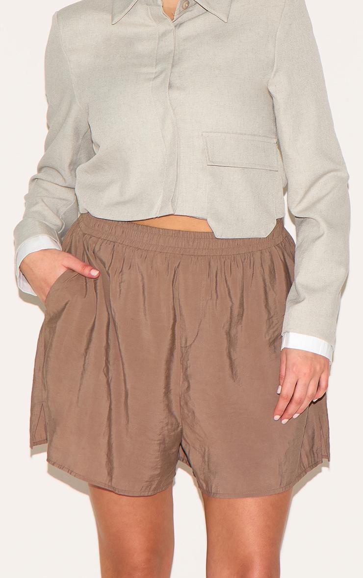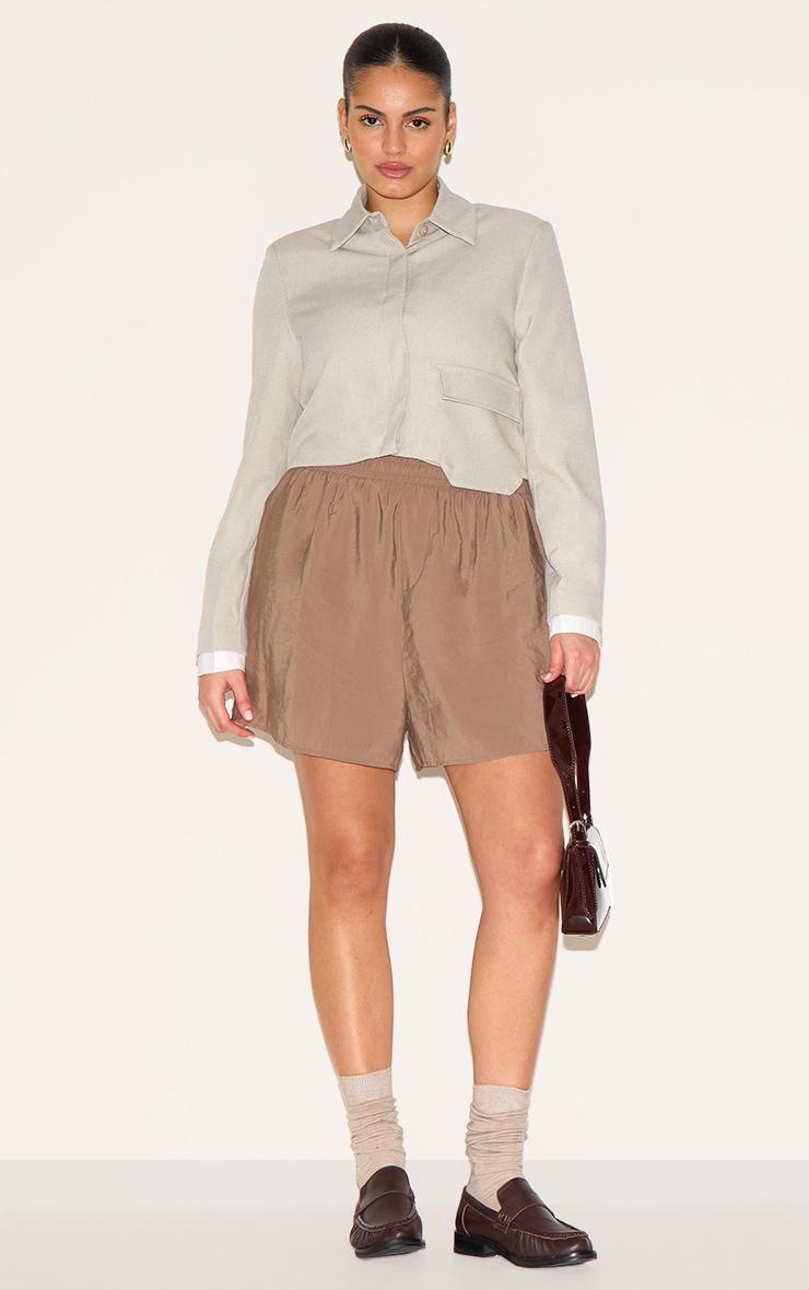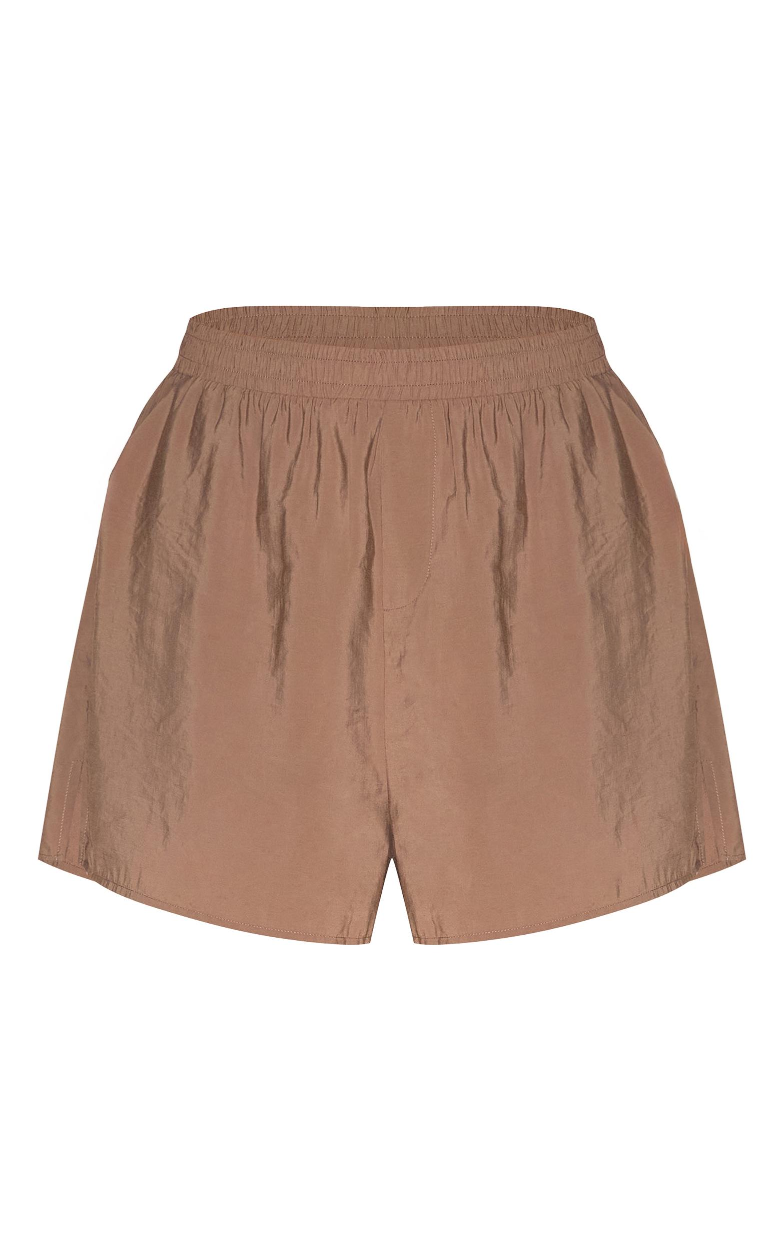 Crafted from brown peached woven material with a flattering elasticated waist detail. For an effortlessly chic look, team these plus brown peached woven elasticated waist shorts with a cosy cardigan, sleek flats and a statement bag.Length approx 57cm/22.5inch (Based on sample size US 12)Model wears size UK 16/ EU 44/ AUS 16/ US 12Model Height - 5ft 7inchp]:!mb-4inch>Brand: PrettyLittleThingCategory: BottomsProduct type: FloatyColor: BrownMaterial: Woven CrepeOccasion: Day