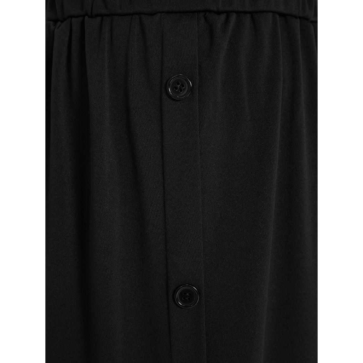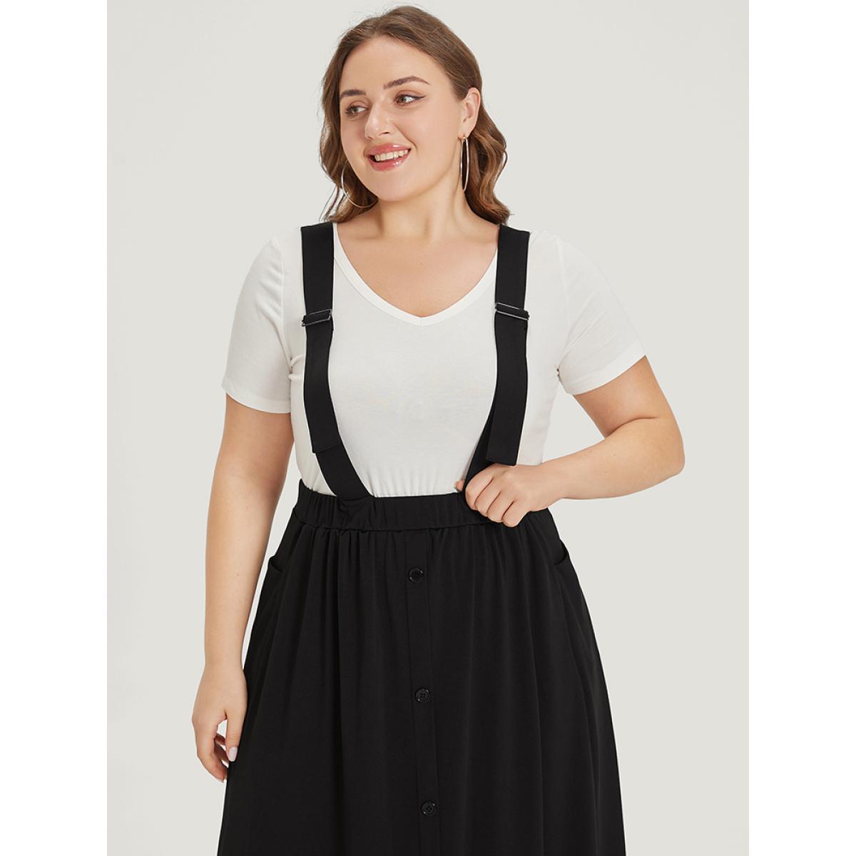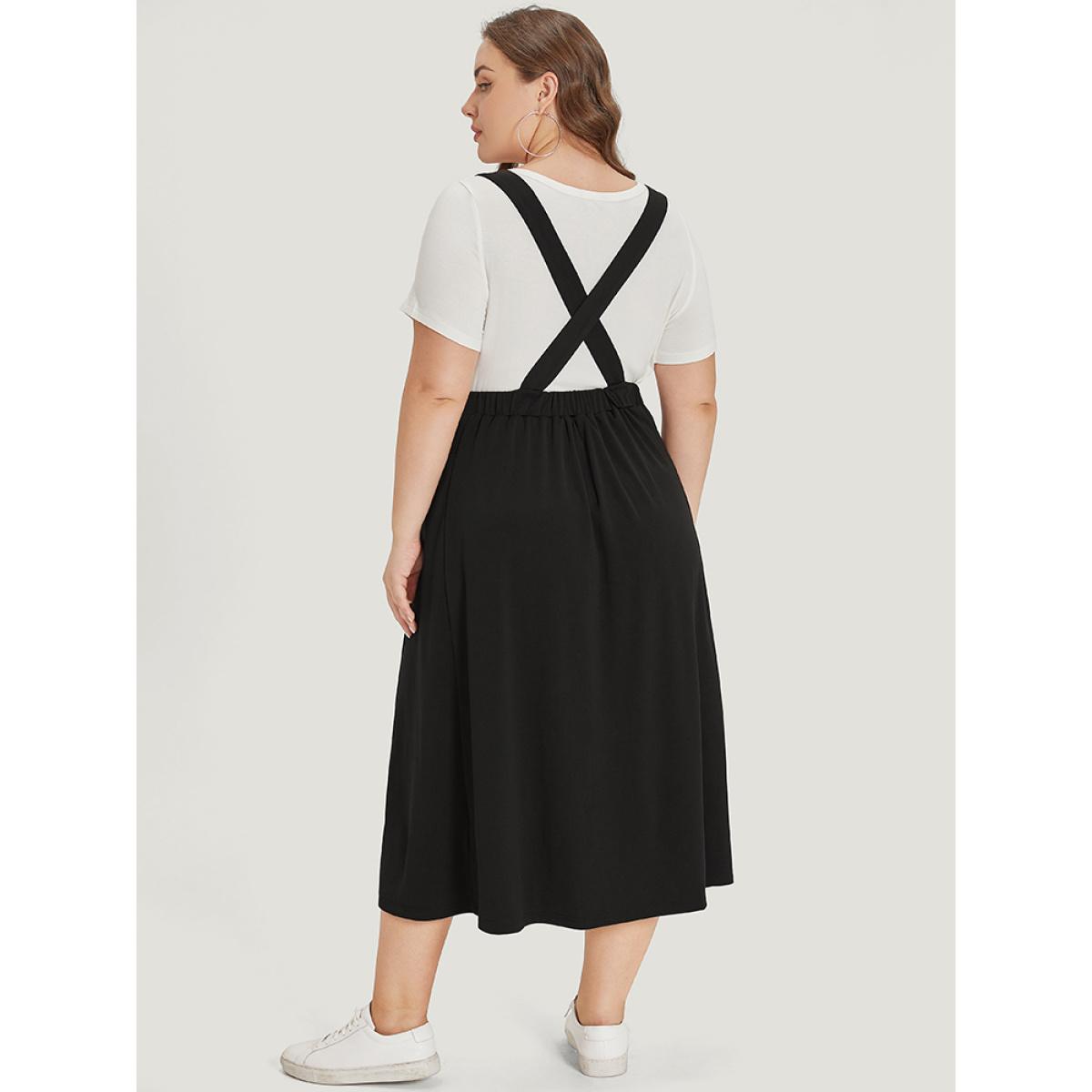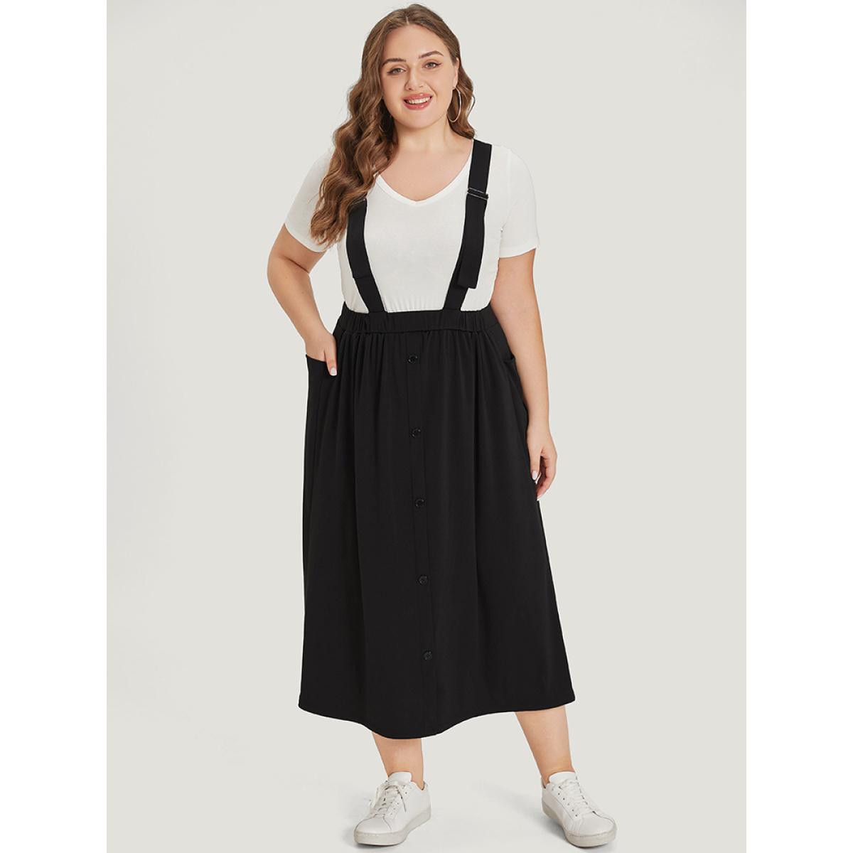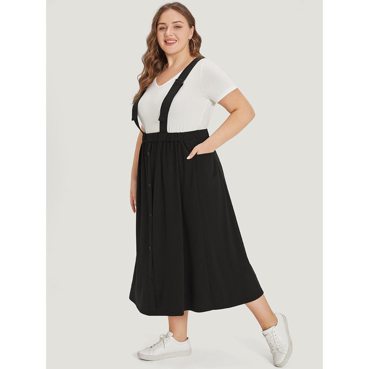 Plus Size Adjustable Straps Button Detail Elastic Waist Suspender Skirt Women Black Casual Adjustable Straps Loose Medium stretch Pocket Dailywear Skirts BloomChic 12/L