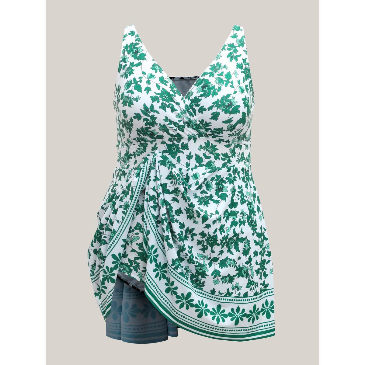 Plus Size Anti-Float Tie Floral Swim Dress Women's Swimwear DarkGreen Resort Bodycon Overlap Collar High stretch Curve Swim Dresses BloomChic 26/4X