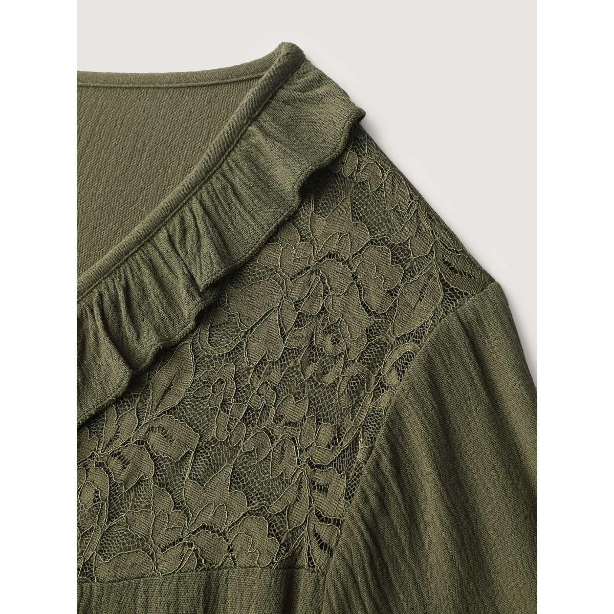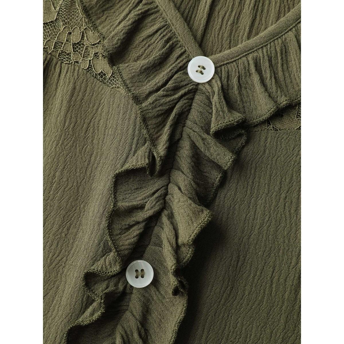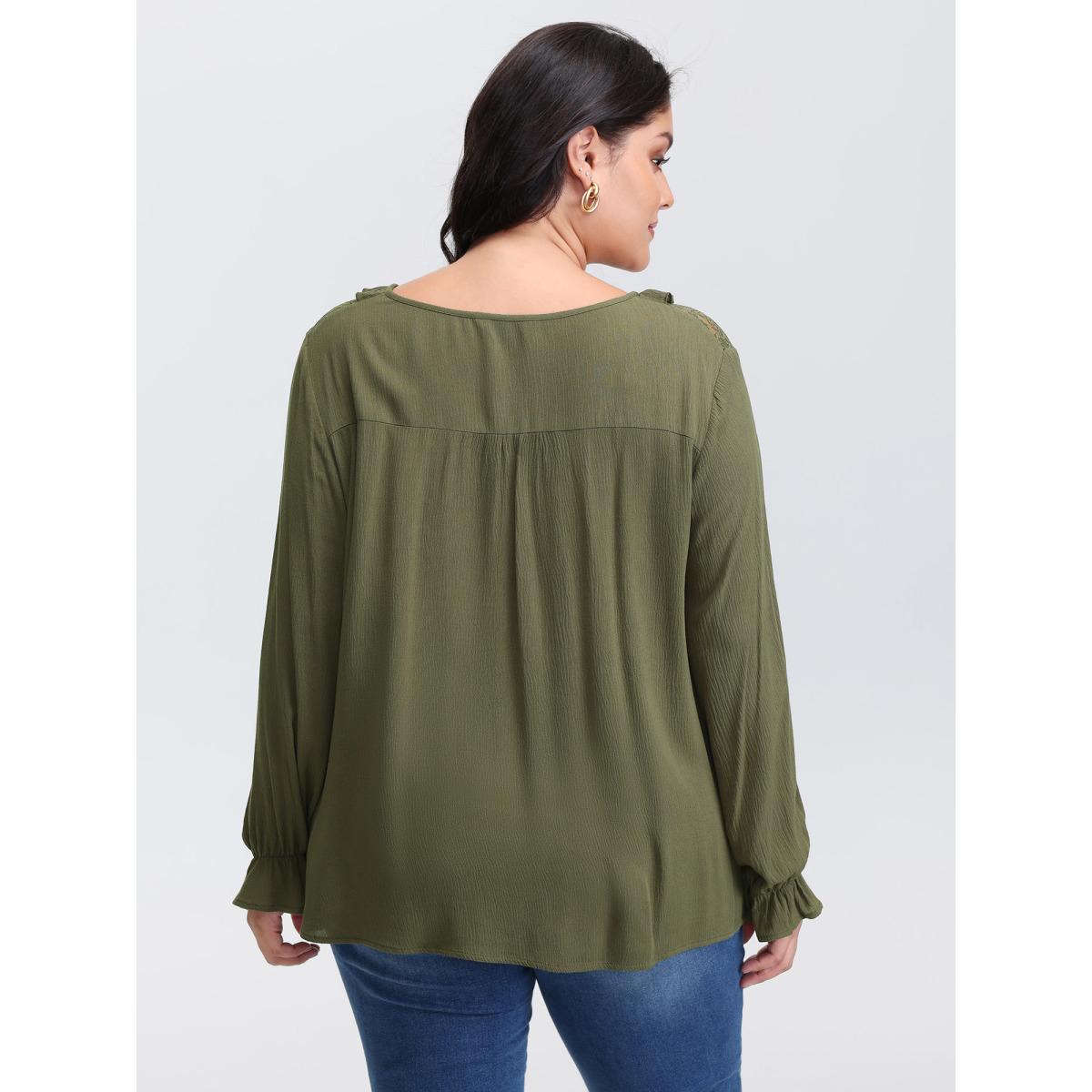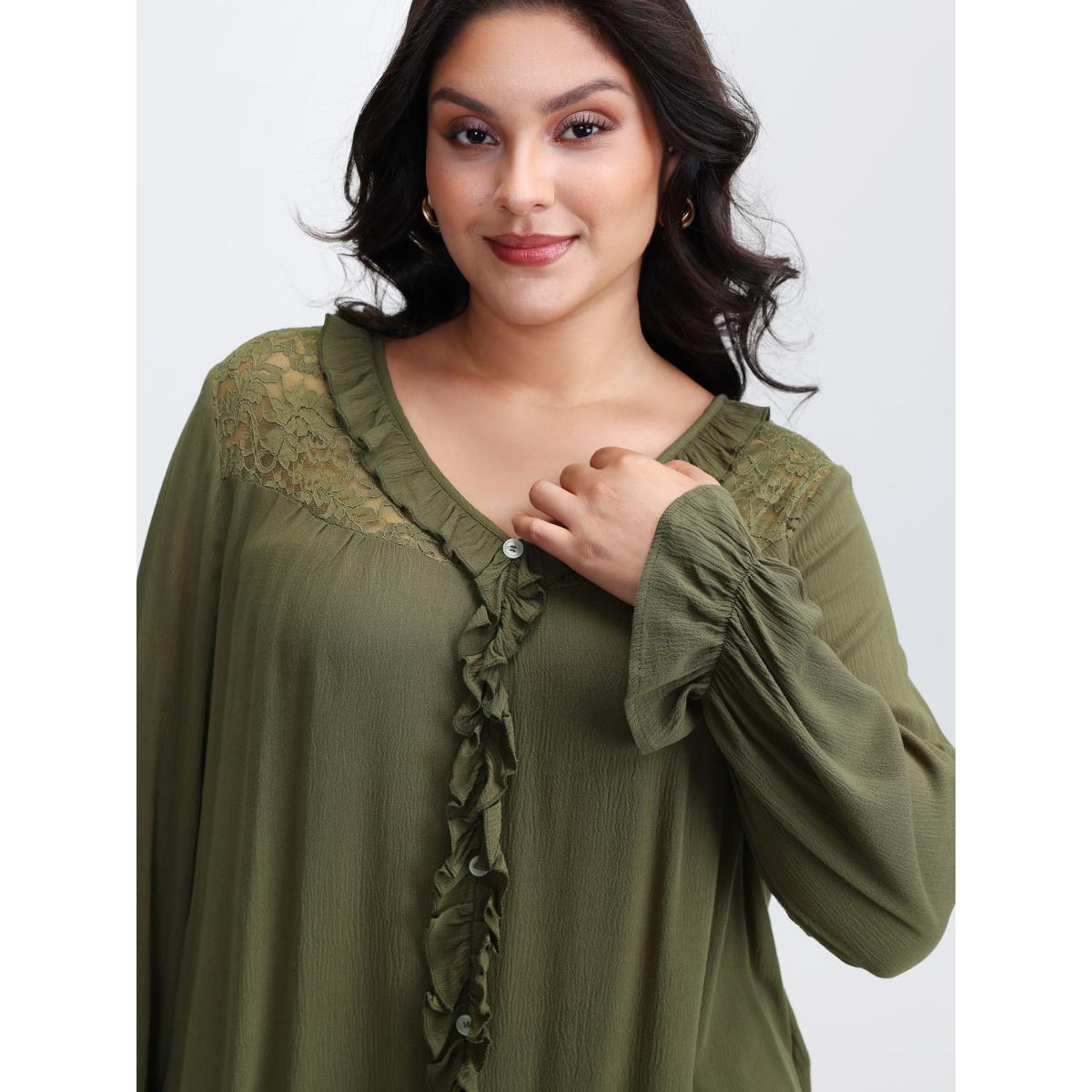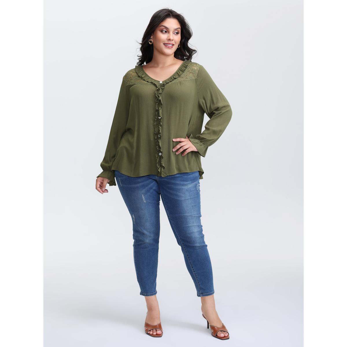 Plus Size ArmyGreen Lace Trim Ruffled Edge Button Blouse Women Timeless Extra Long Sleeve V-neck Elegant Blouses BloomChic 30/6X