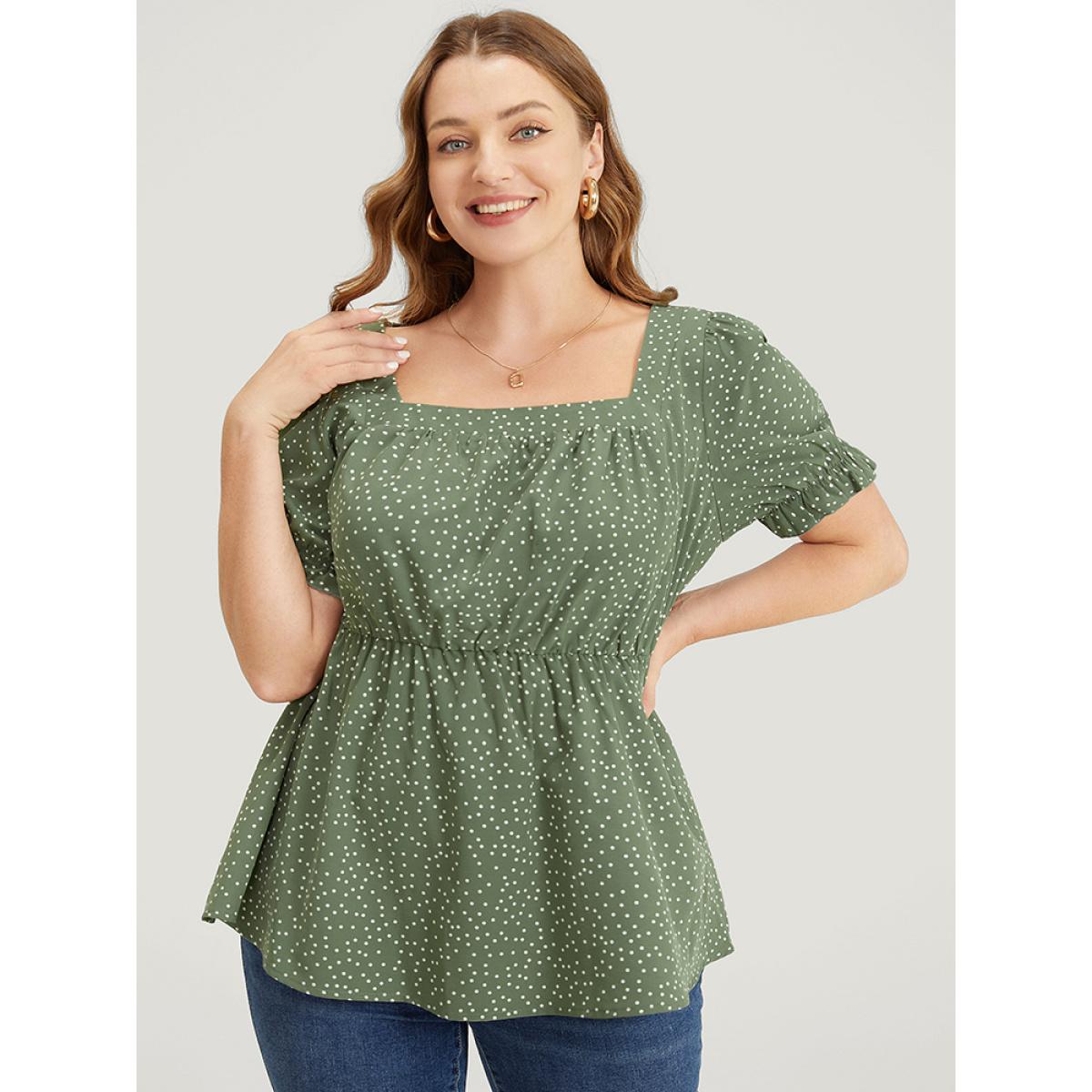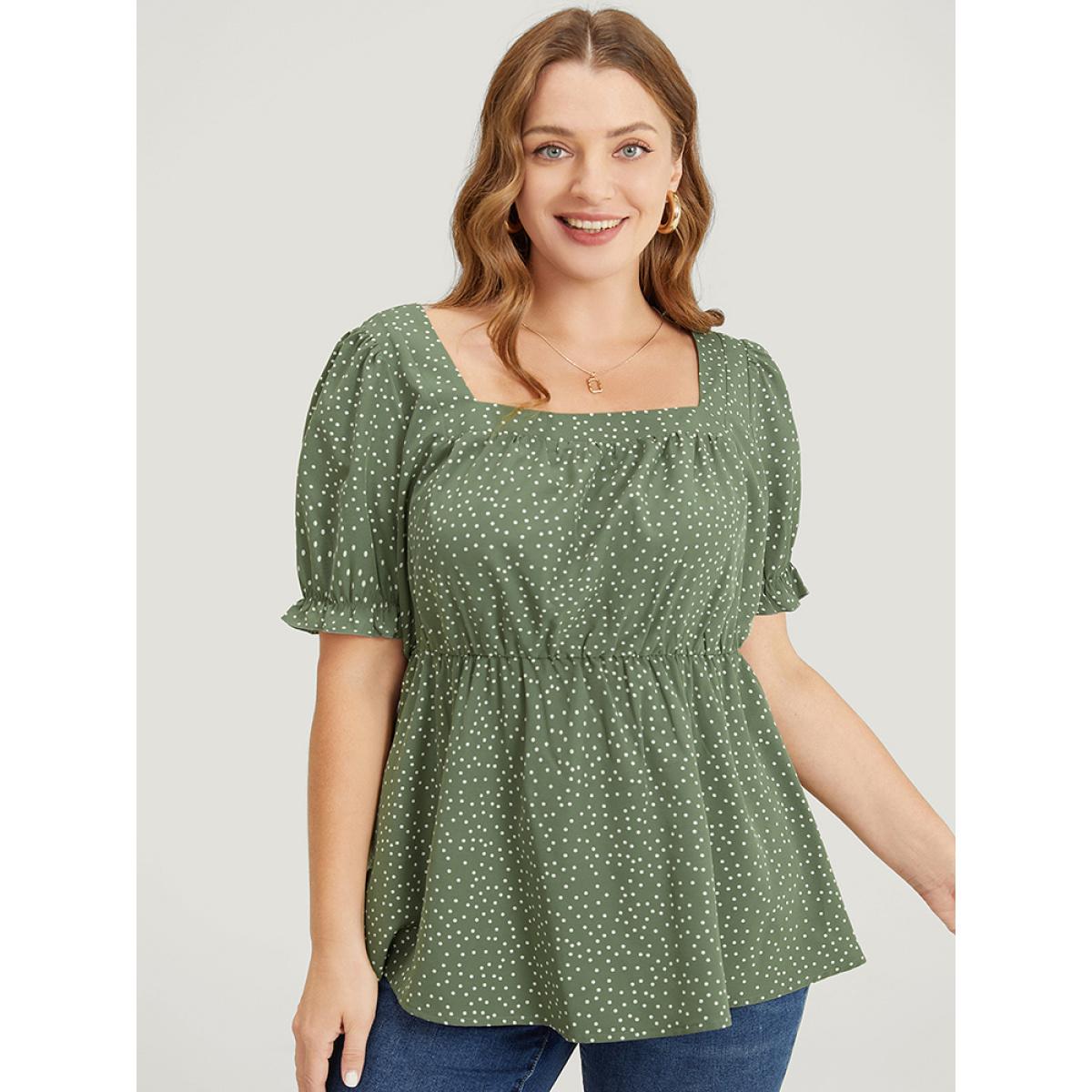 Plus Size ArmyGreen Polka Dot Square Neck Ruffles Puff Sleeve Blouse Women Elegant Short sleeve Square Neck Dailywear Blouses BloomChic 22-24/3X