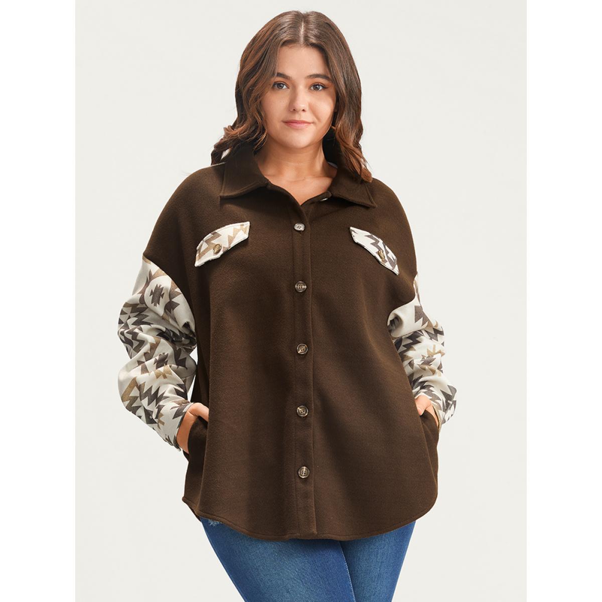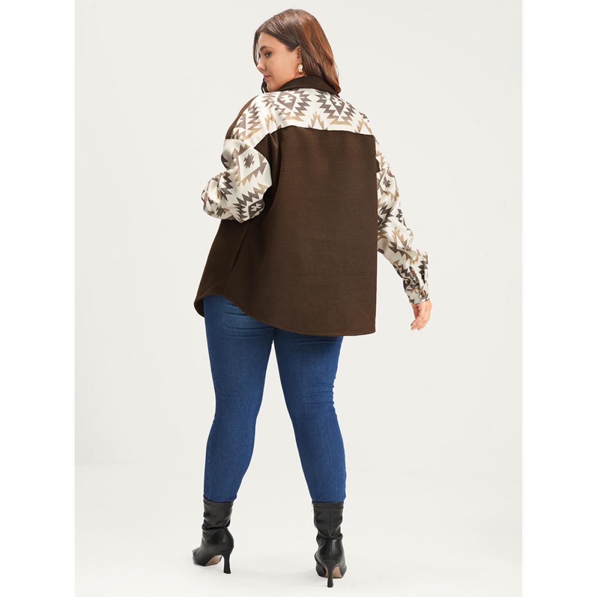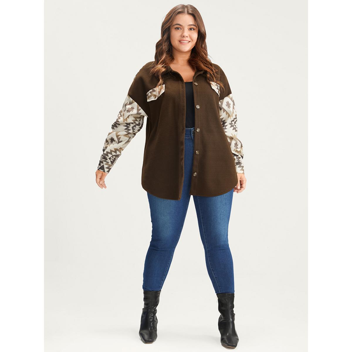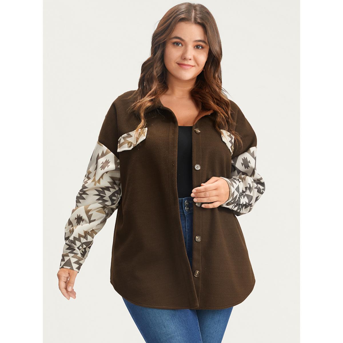 Plus Size Bandana Button Up Pocket Shirt Women DarkBrown Casual Patchwork Ladies Dailywear Winter Coats BloomChic 30/6X