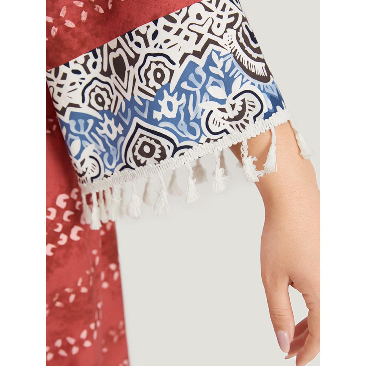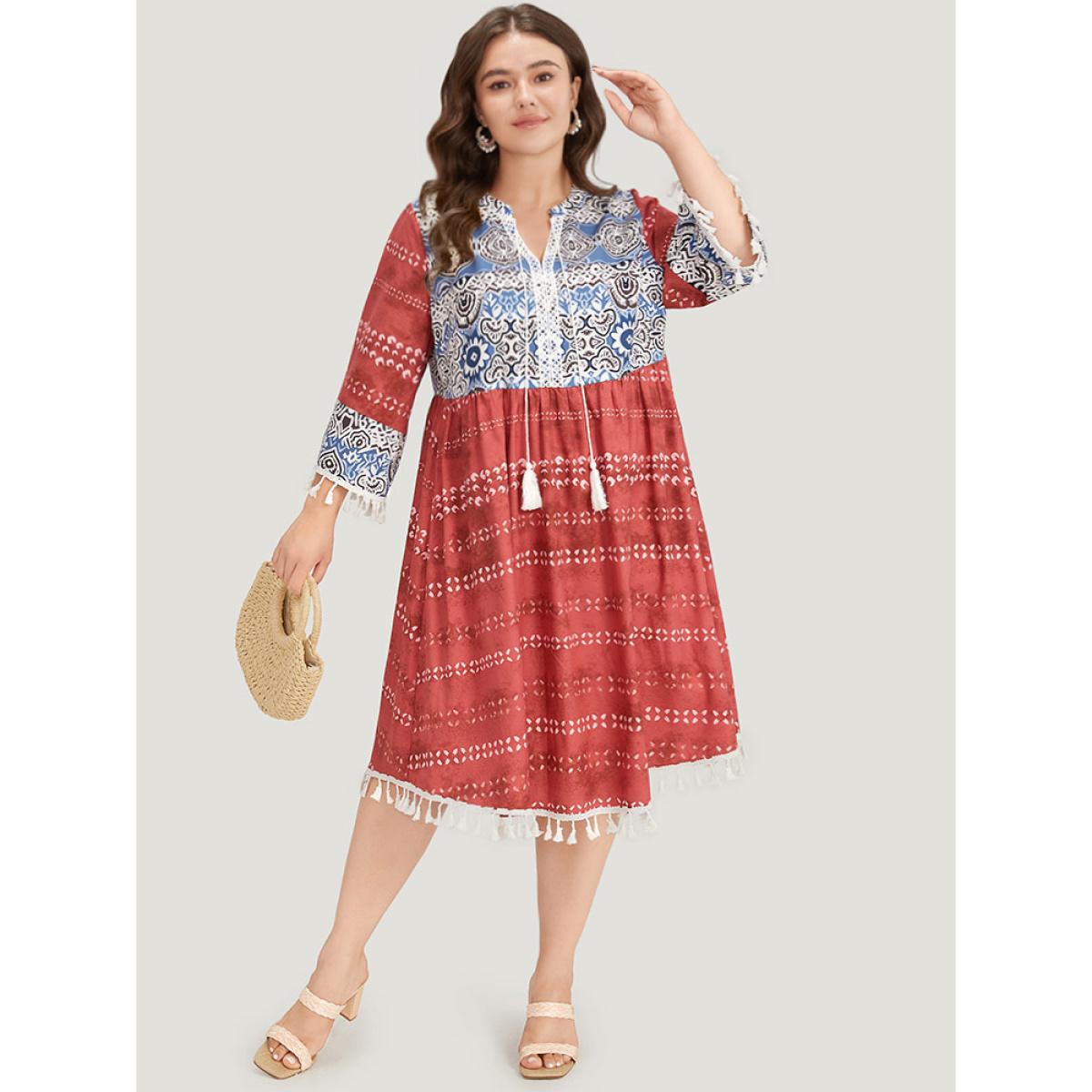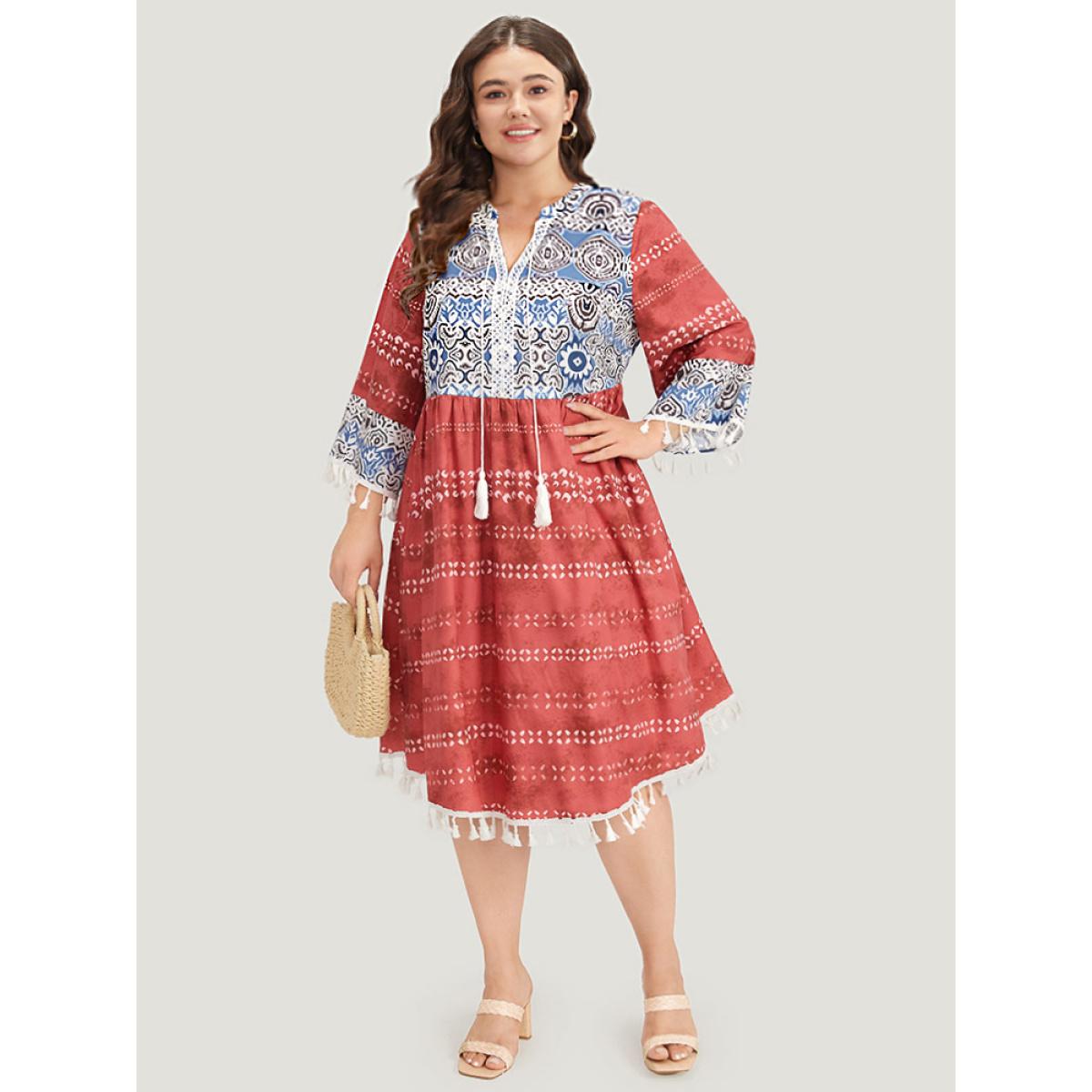 Plus Size Bandana Print Contrast Tassels Trim Ties Notched Dress Red Women Vacation Tassels Notched collar Elbow-length sleeve Curvy Midi Dress BloomChic 18-20/2X