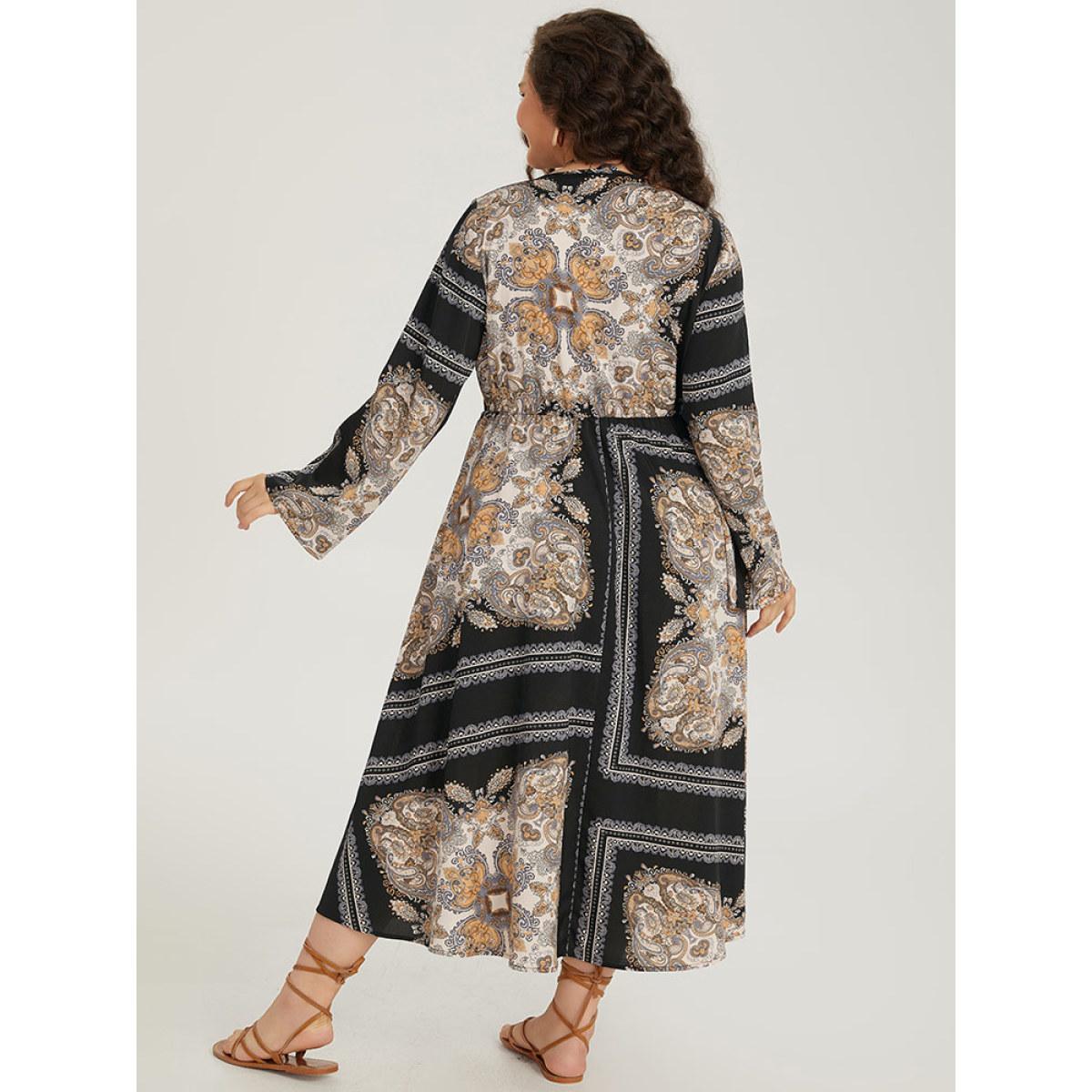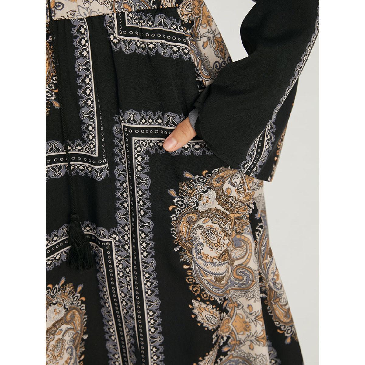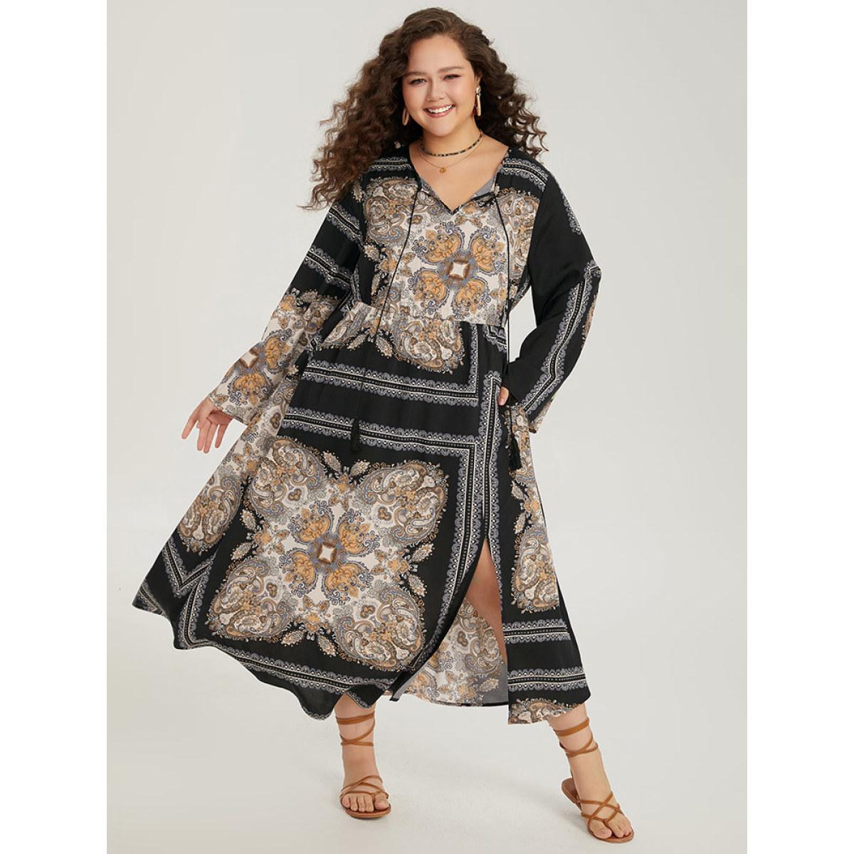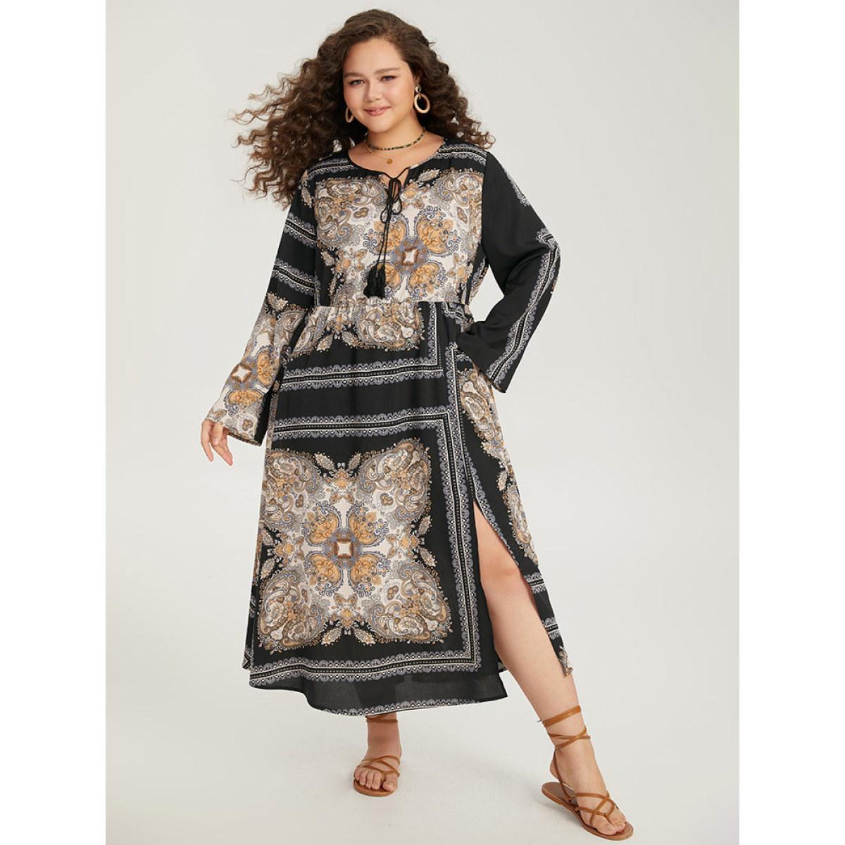 Plus Size Bandana Print Split Side Tassels Ties Dress Black Women Vacation Tassels Tie Neck Long Sleeve Curvy Midi Dress BloomChic 22-24/3X
