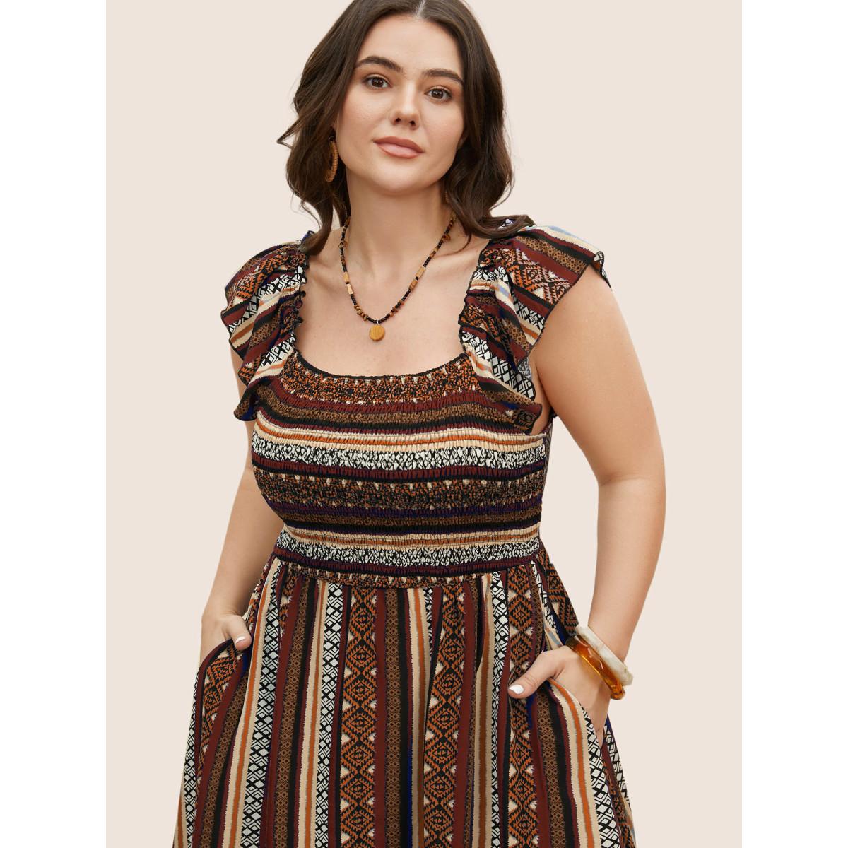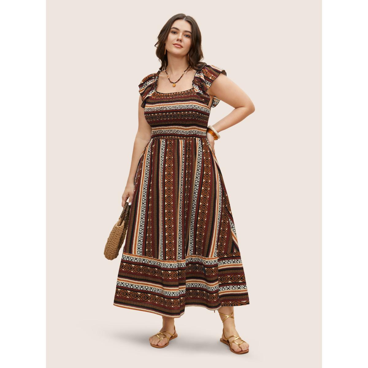 Plus Size Bandana Striped Shirred Ruffle Trim Dress Russet Women Resort Shirred Square Neck Cap Sleeve Curvy BloomChic 18-20/2X