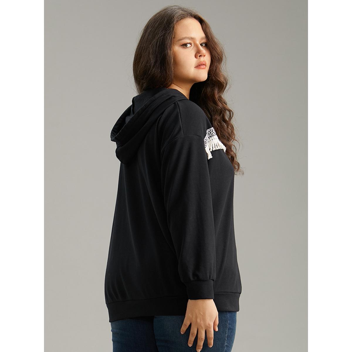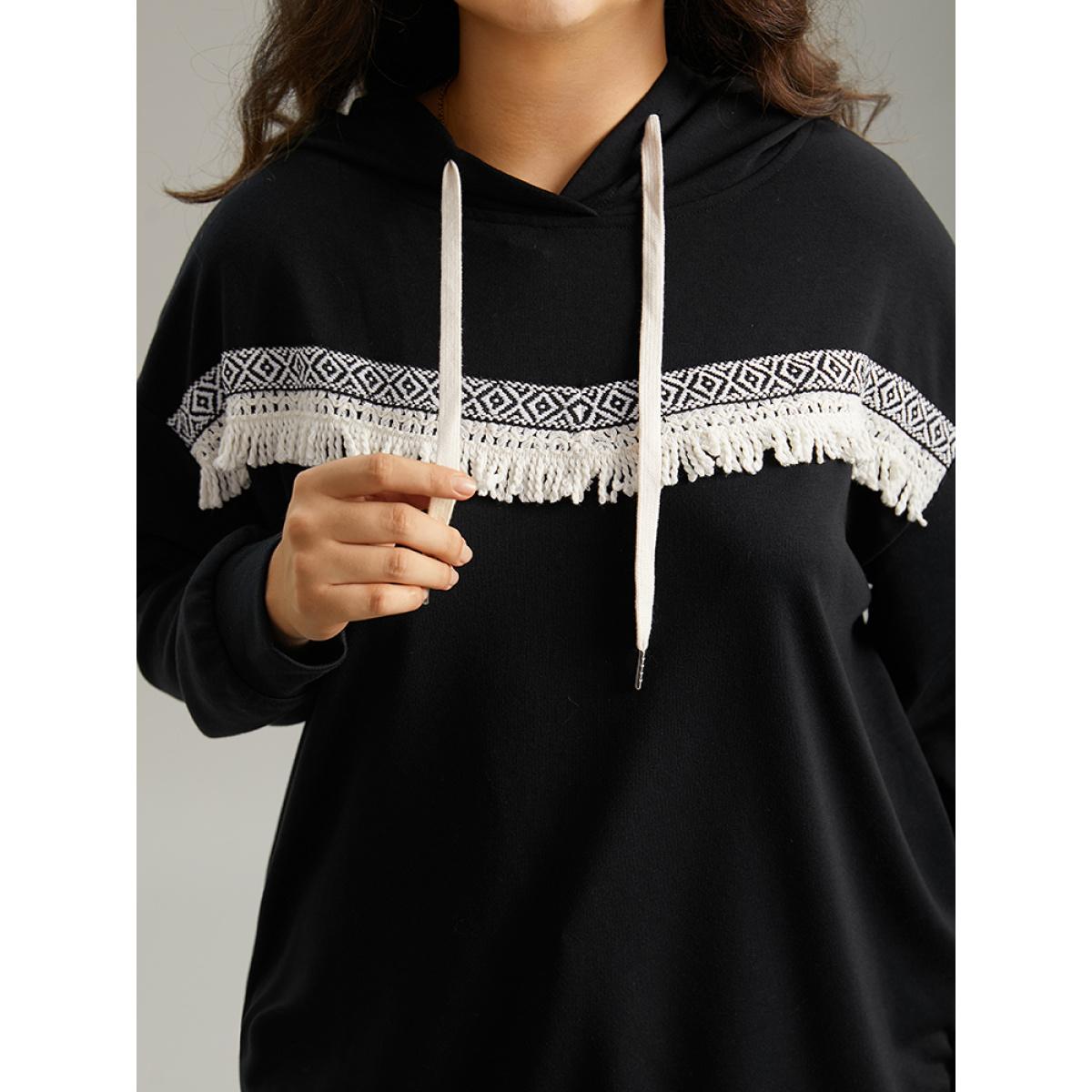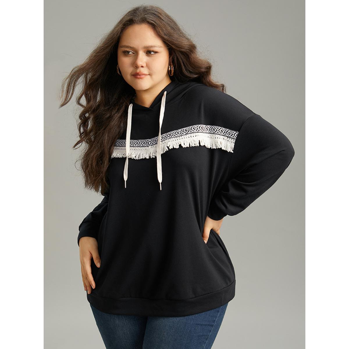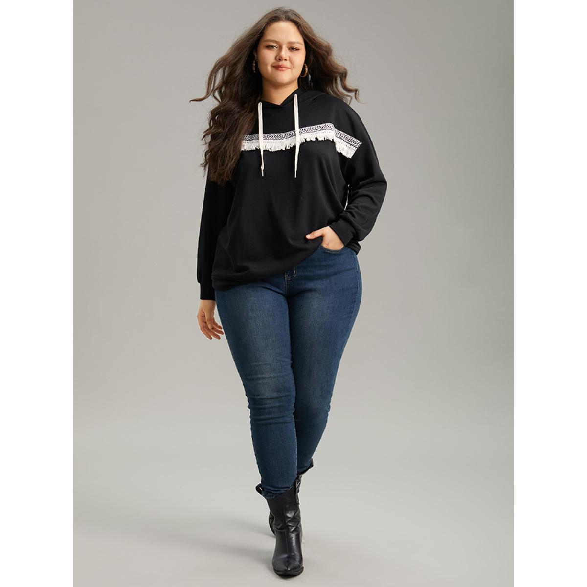Plus Size Bandana Tassel Trim Hooded Drawstring Sweatshirt Women Black Elegant Elastic cuffs Hooded Dailywear Sweatshirts BloomChic 14-16/1X