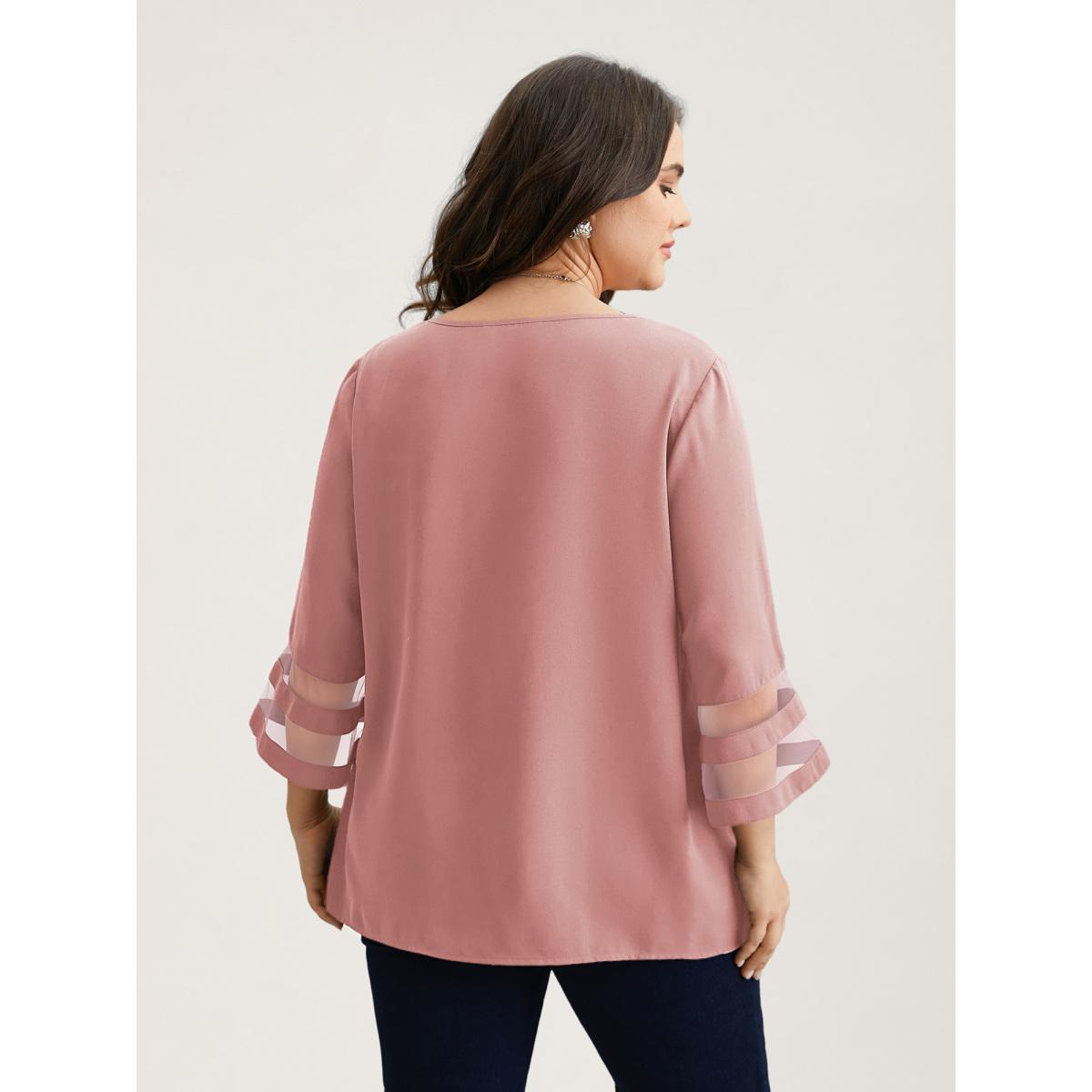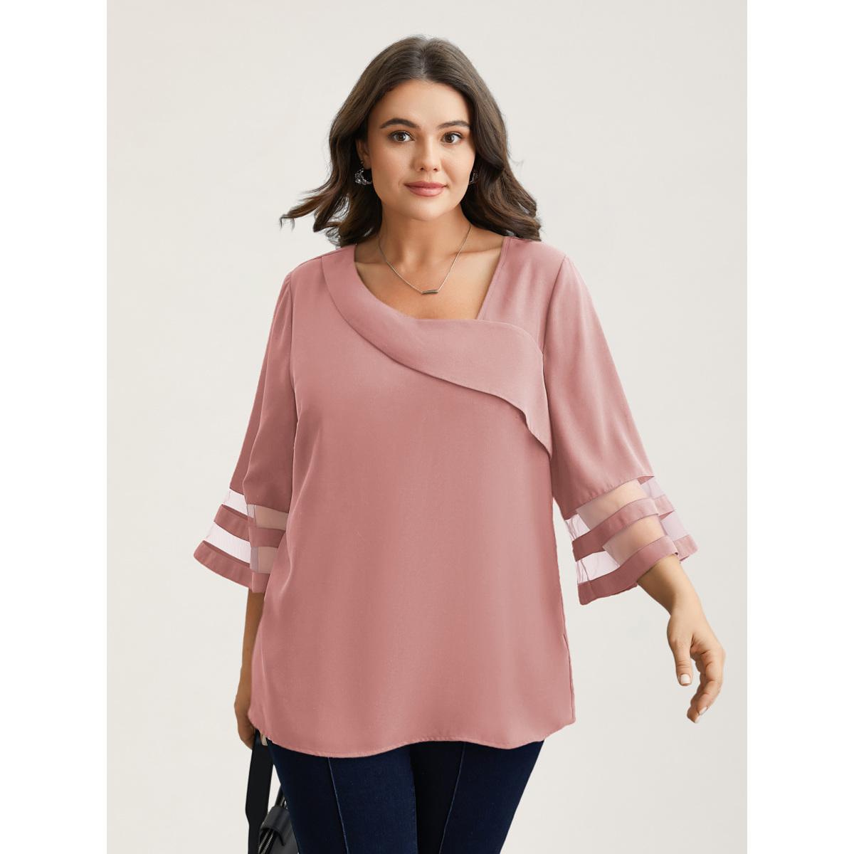 Plus Size Beanpastepowder Sheer Sleeve Patchwork Asymmetrical Neckline Blouse Women Office Elbow-length sleeve Asymmetrical Neck Office Blouses BloomChic 30/6X