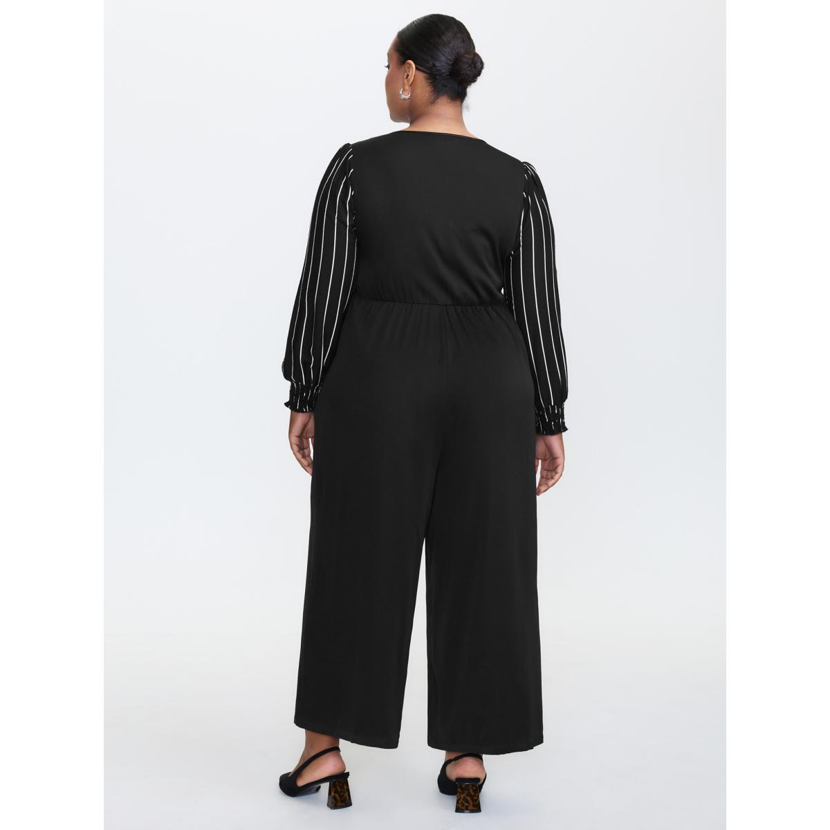 Plus Size Black Sheer Stretchy Waist Belted Solid Jumpsuit Women Office Half Sleeve Overlap Collar Office Loose Jumpsuits BloomChic 28/5X