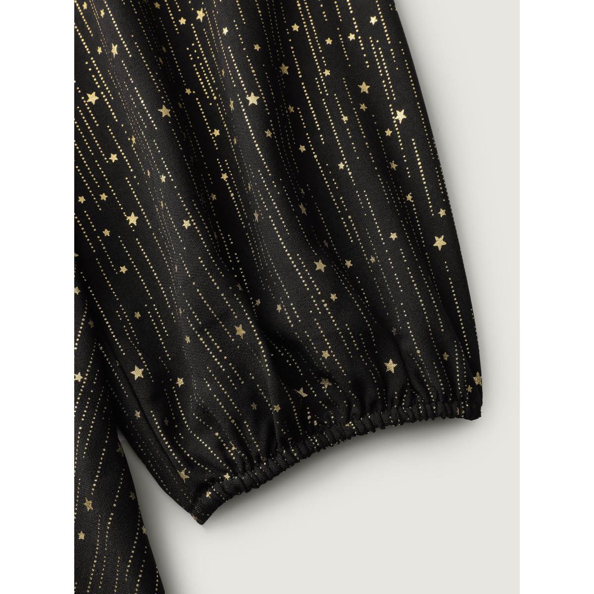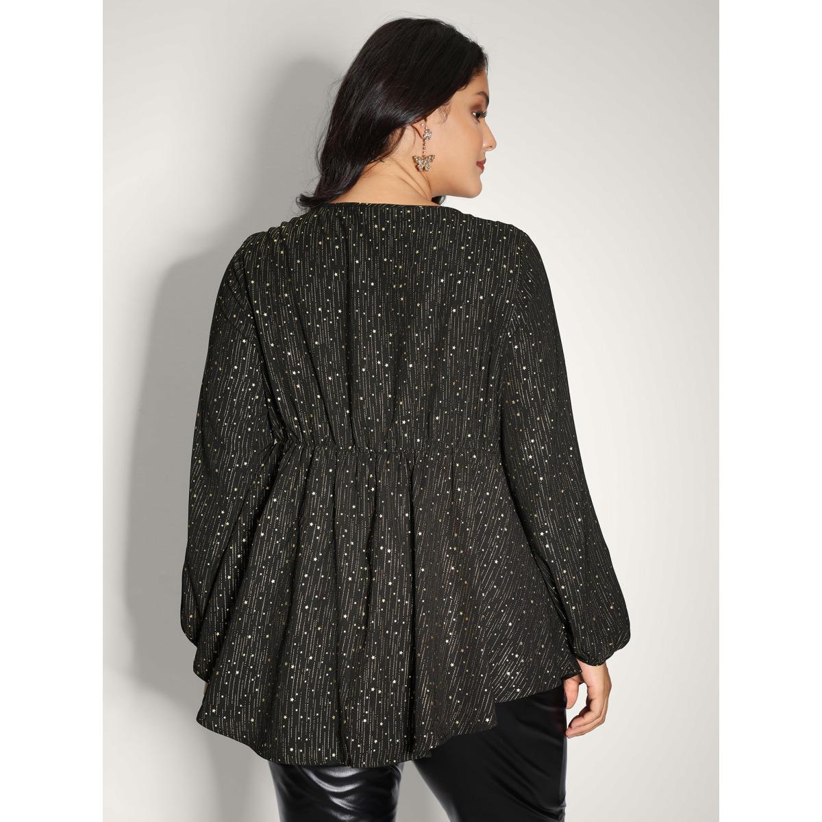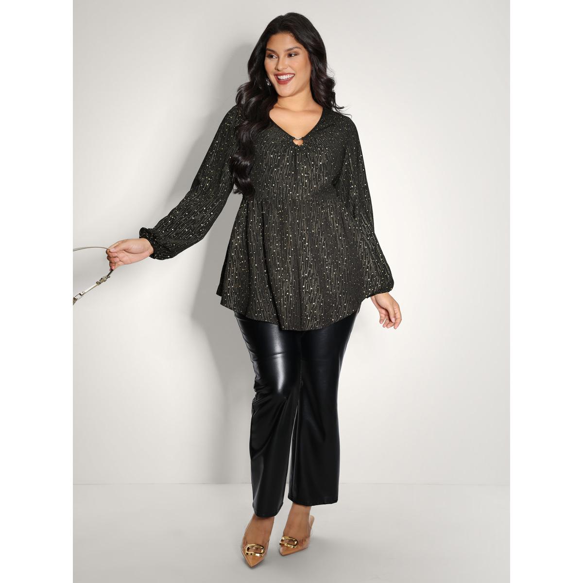 Plus Size Black Gold Stamp Ruched Neckline Flowy Blouse Women Party&Cocktail Extra Long Sleeve V-neck Party Blouses BloomChic 12/L