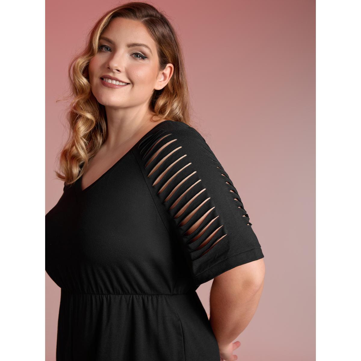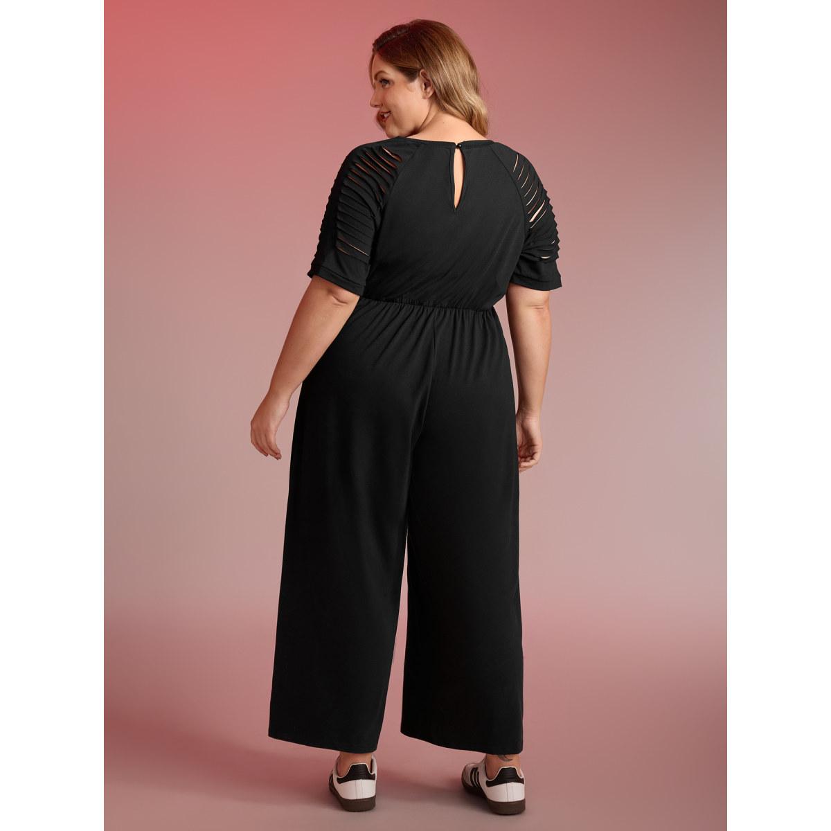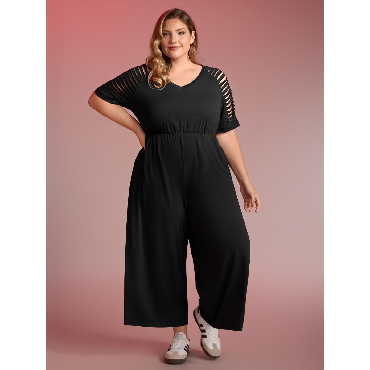 Plus Size Black Laser Cut-Out Stretchy Sheer Jumpsuit Women Leisure Short sleeve V-neck Casual Loose Jumpsuits BloomChic 22-24/3X