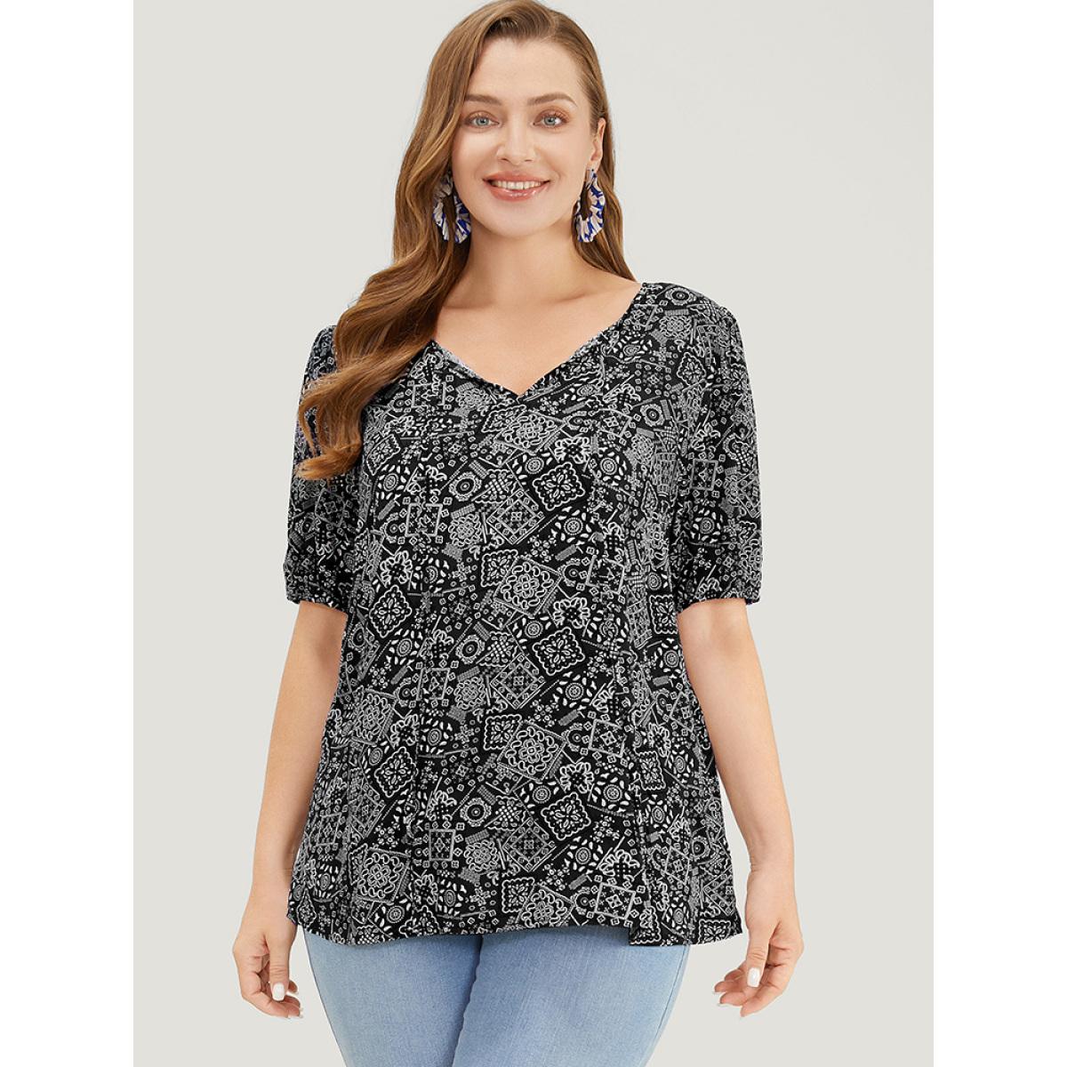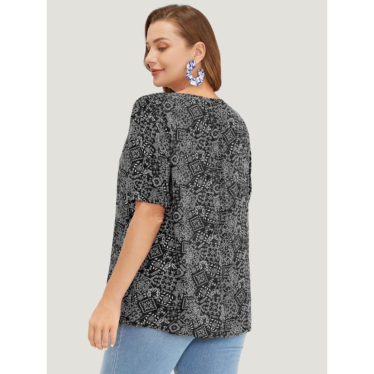 Plus Size Black Moroccan Print Keyhole Tie Neck Blouse Women Vacation Short sleeve V-neck Office Blouses BloomChic 18-20/2X