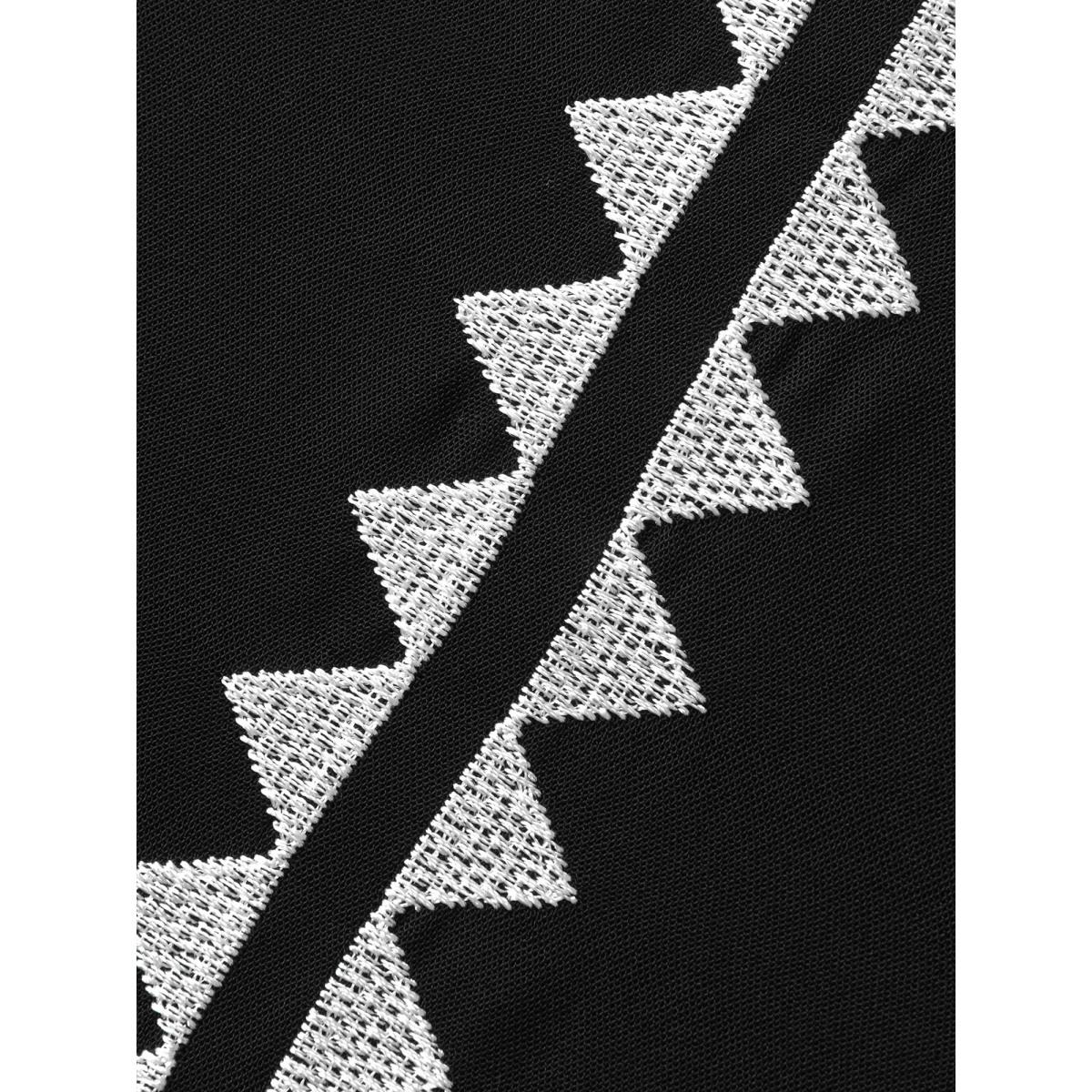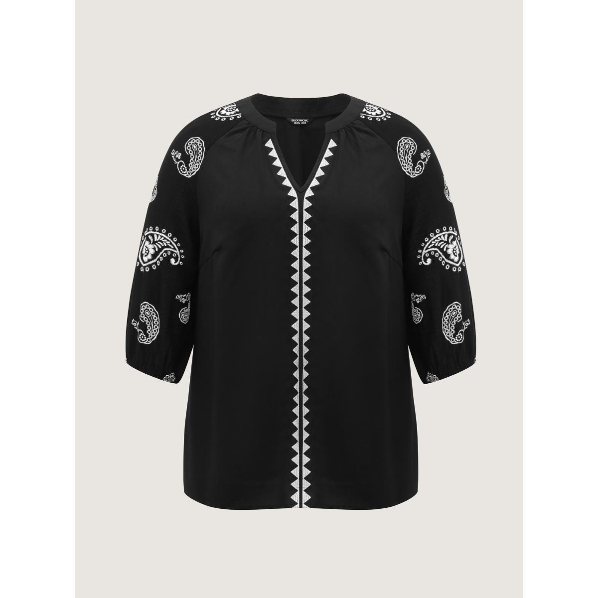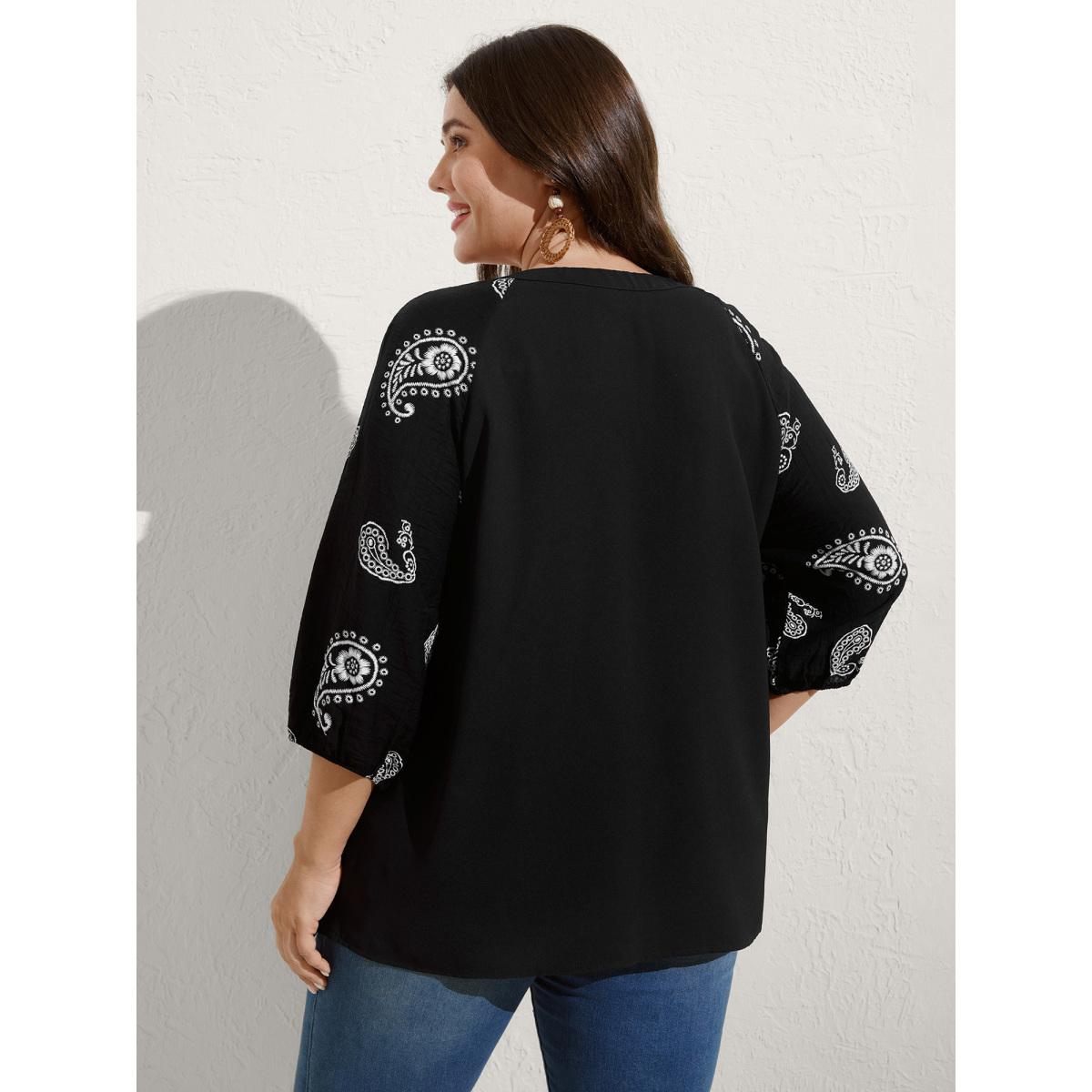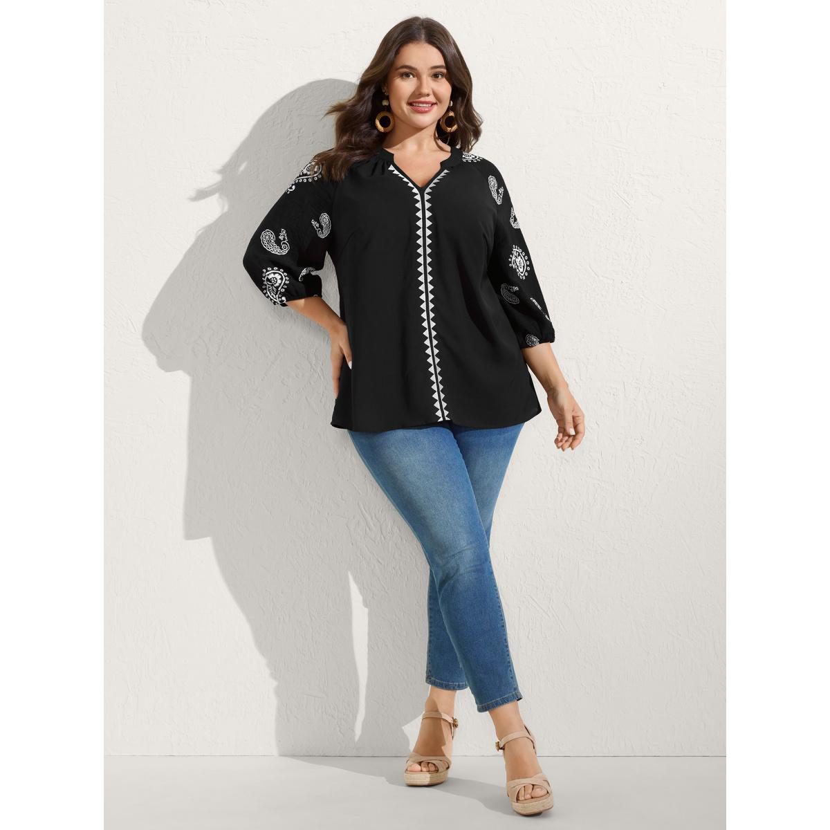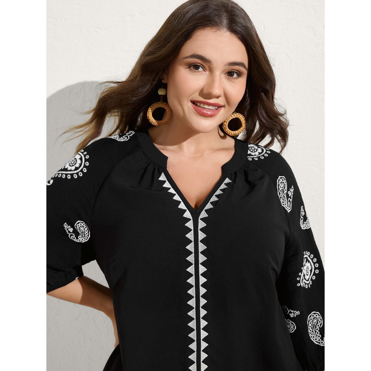 Plus Size Black Paisley Embroidered Sleeve Spliced Blouse Women Boho Elbow-length sleeve Flat collar with V-notch Vacation Blouses BloomChic 12/L