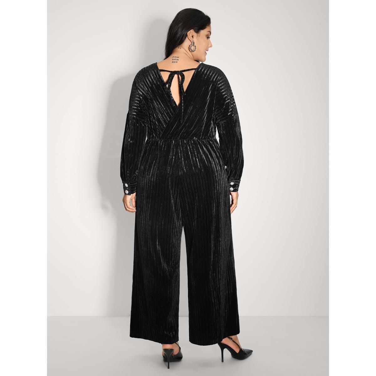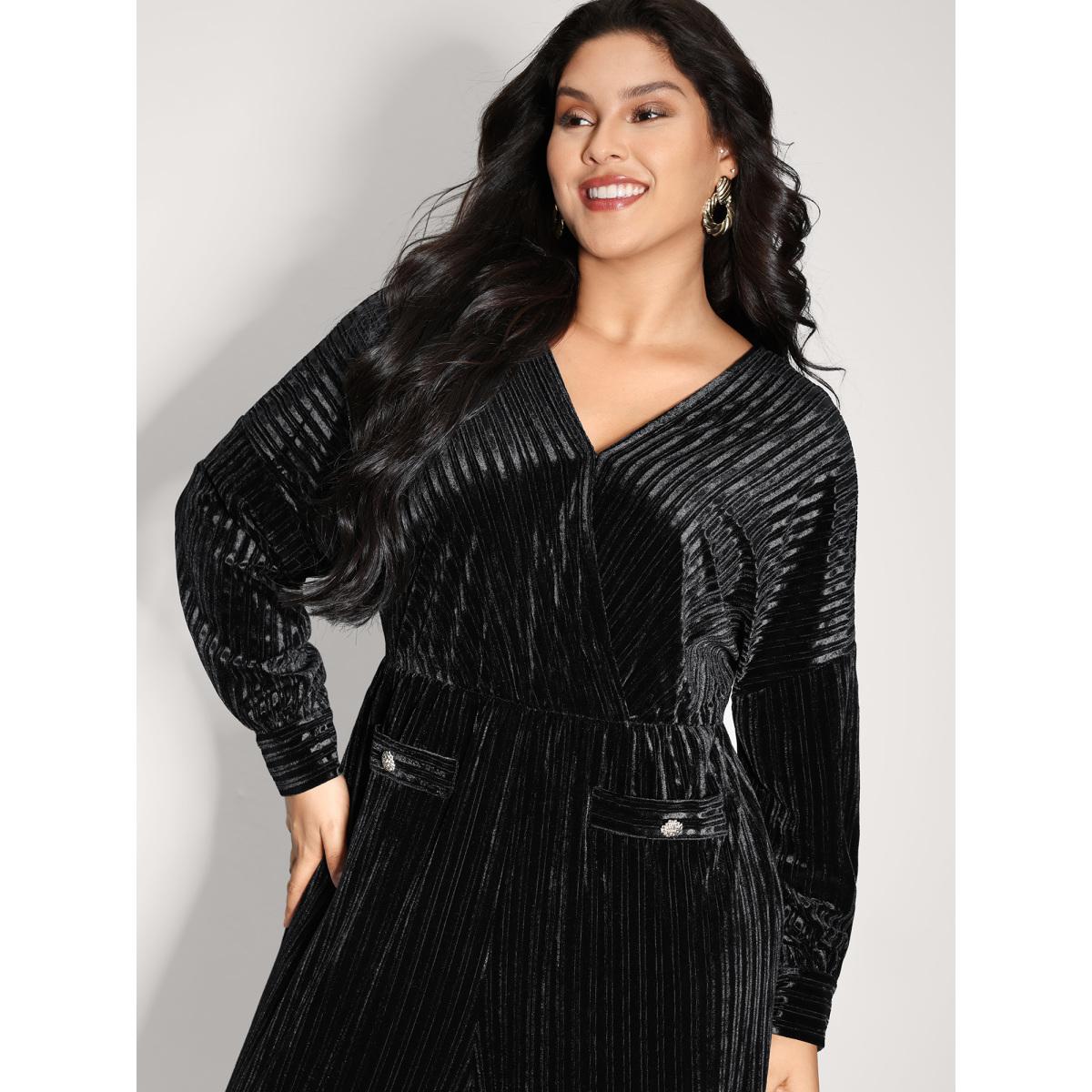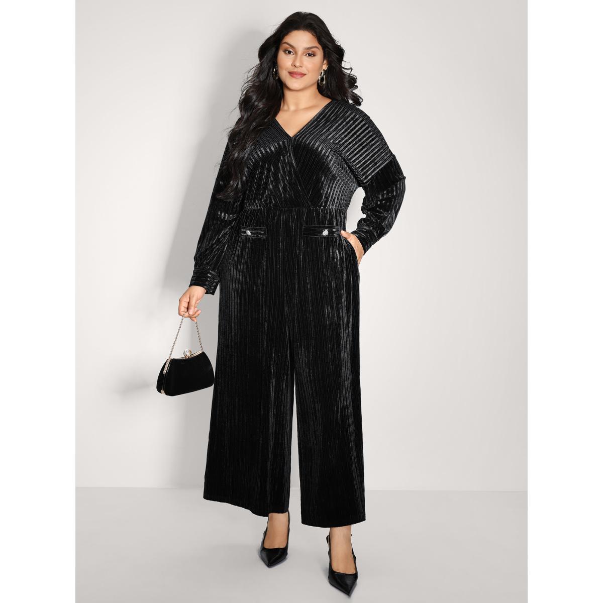 Plus Size Black Textured Velvet Sheer Back Pockets Jumpsuit Women Formal Long Sleeve Overlap Collar Party Loose Jumpsuits BloomChic 18-20/2X