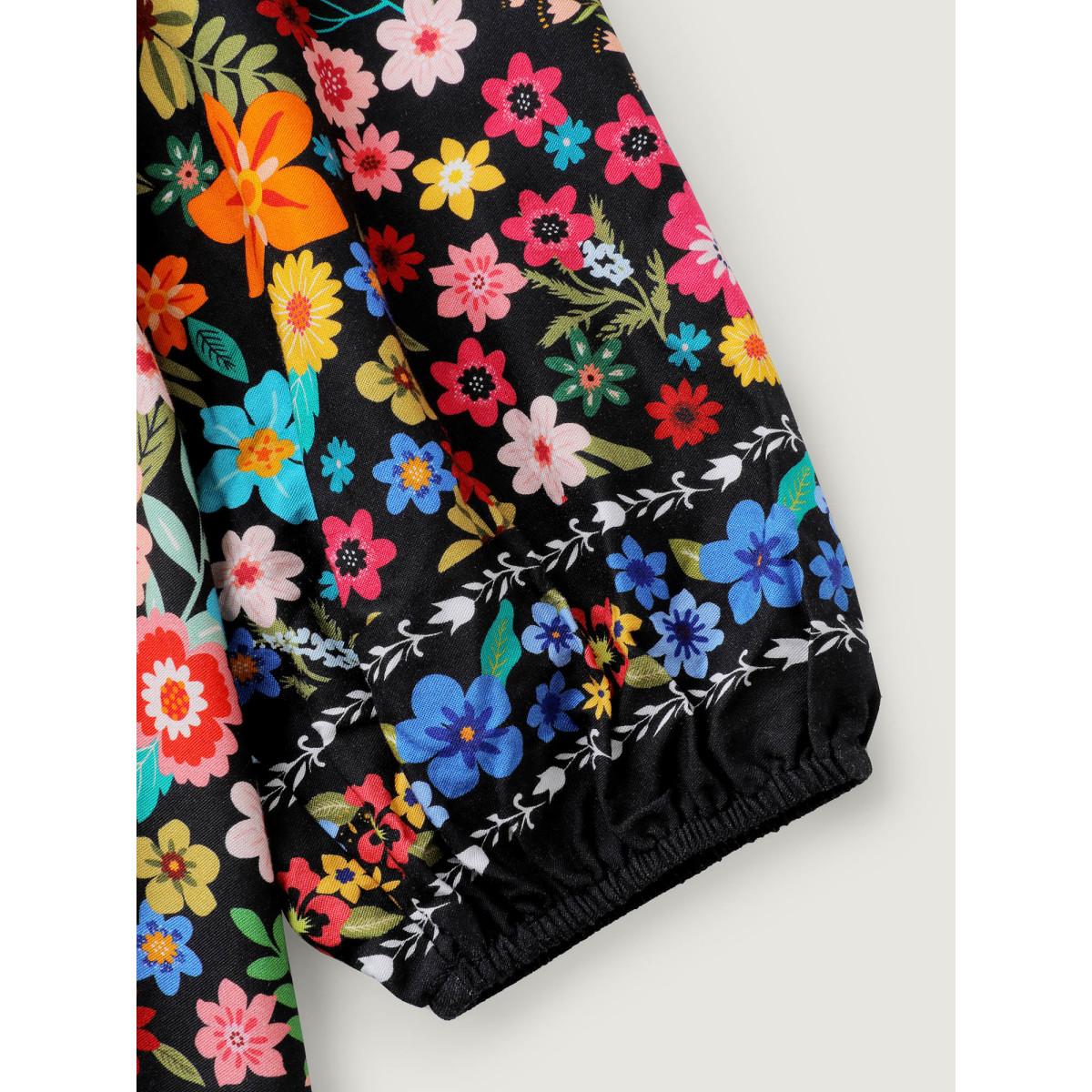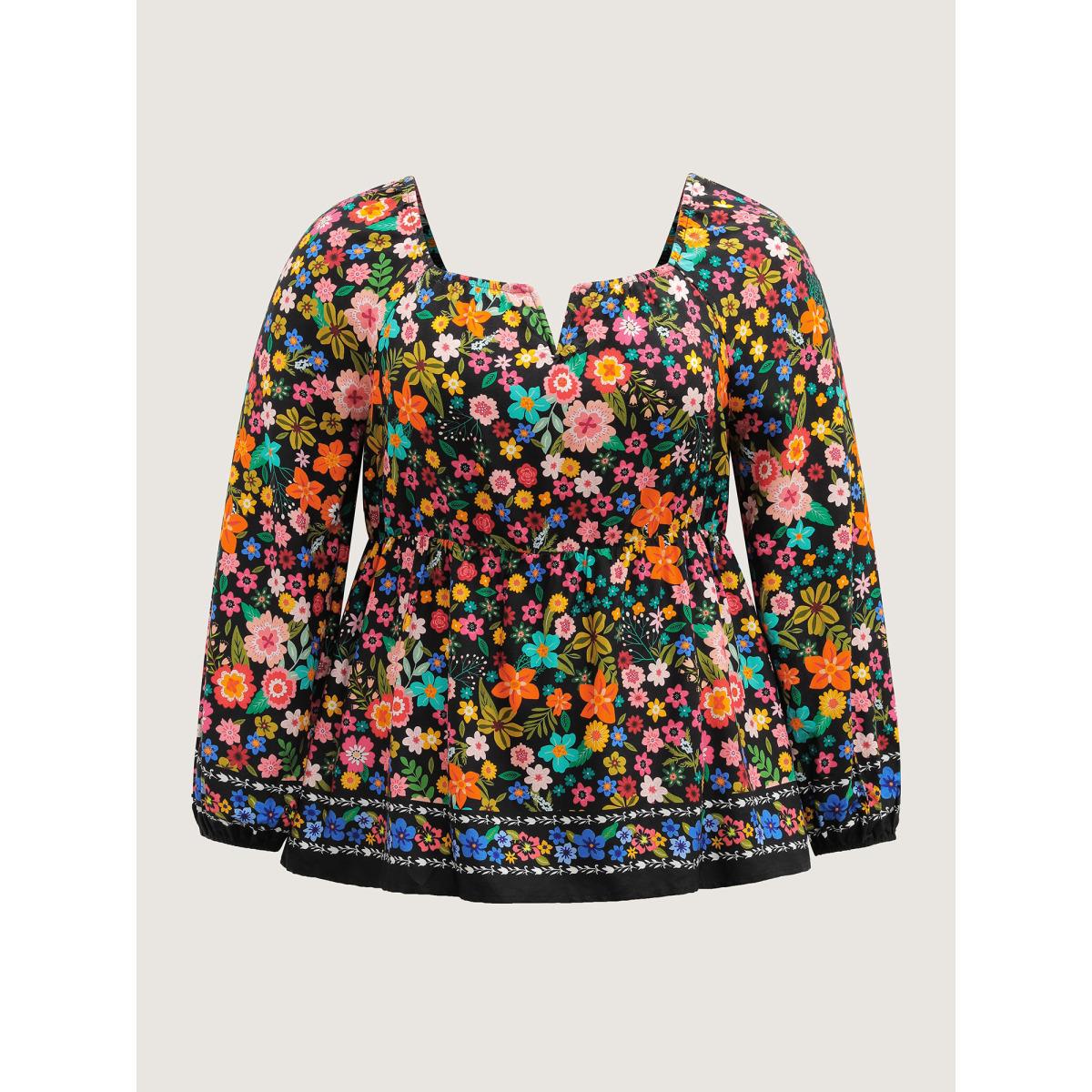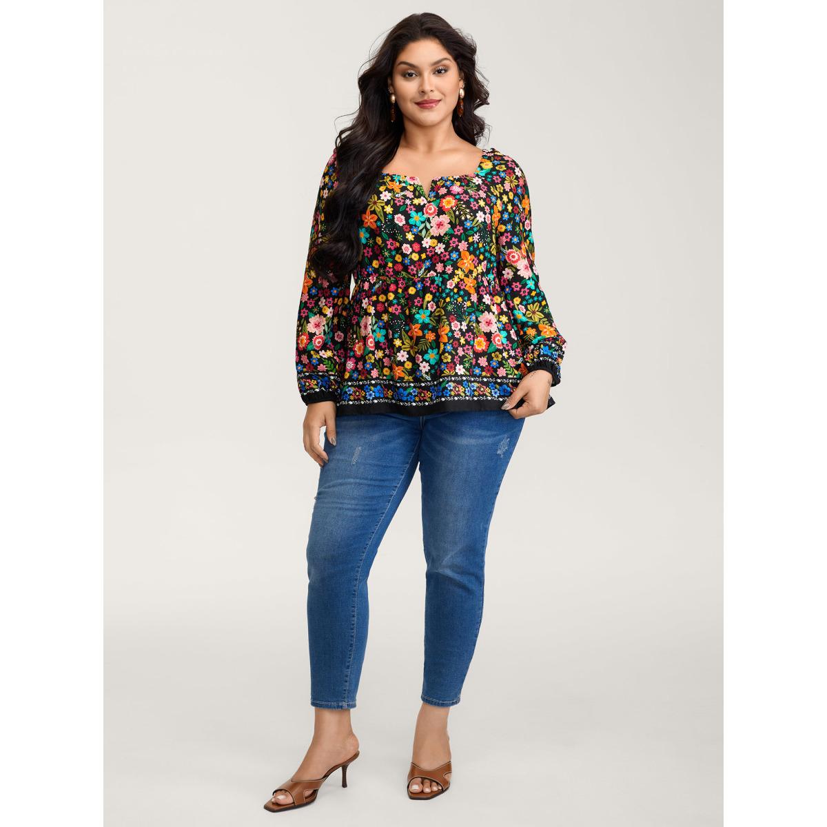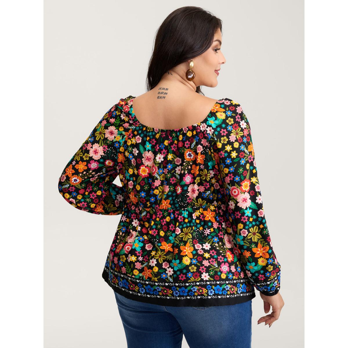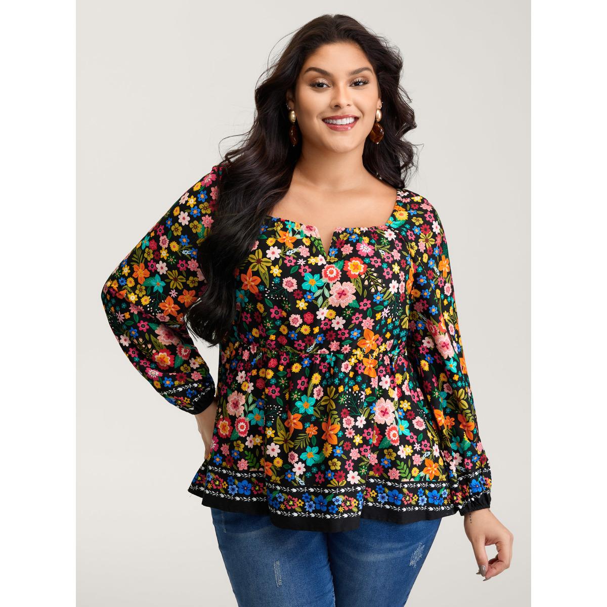 Plus Size BlackFlower Colorful Floral Print Cinched-Flared Blouse Women Playful Extra Long Sleeve Notched collar Casual Blouses BloomChic 28/5X