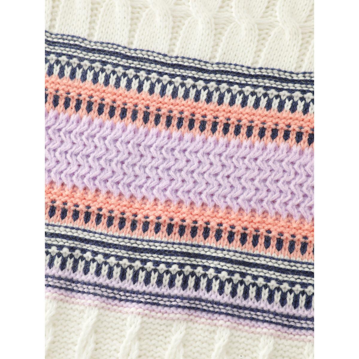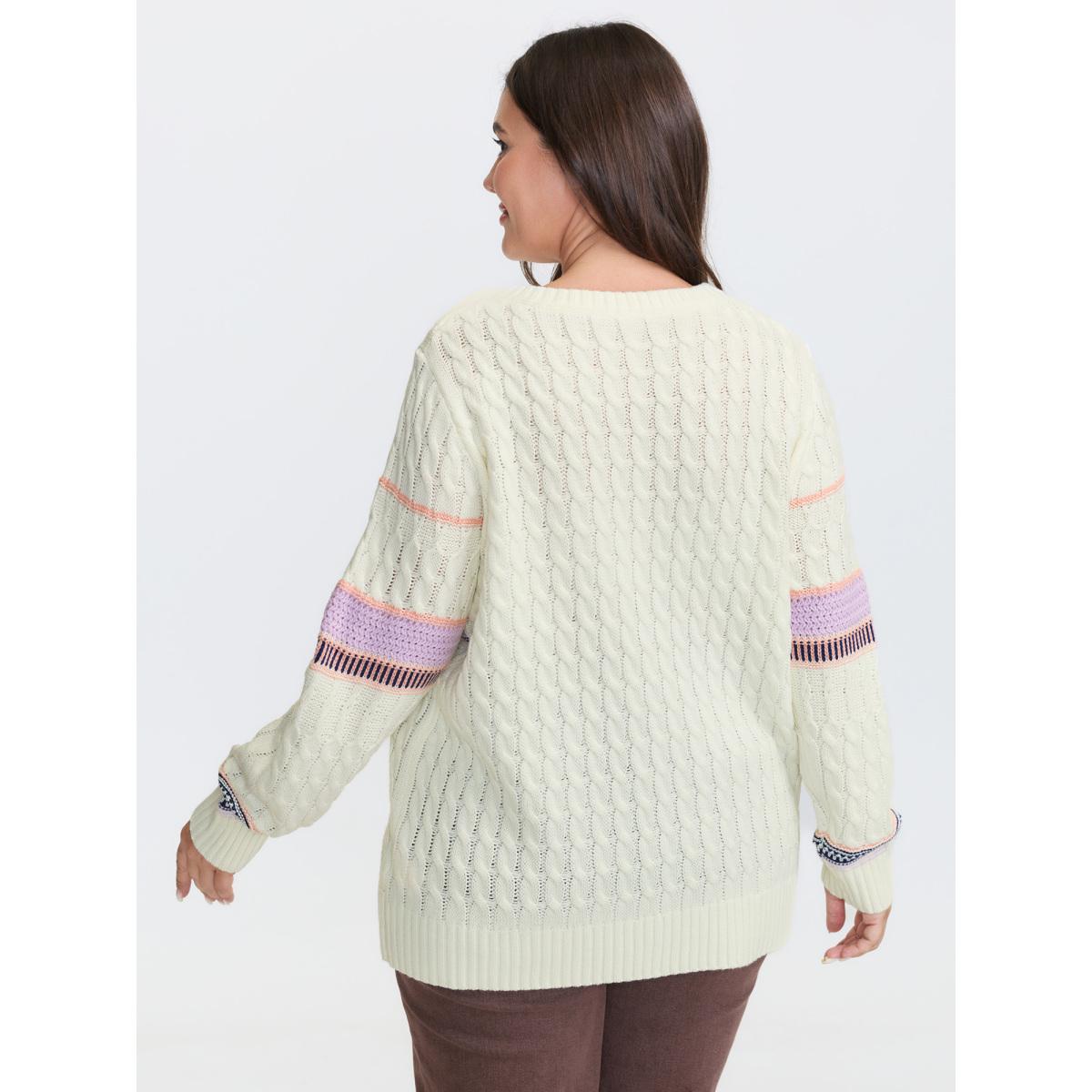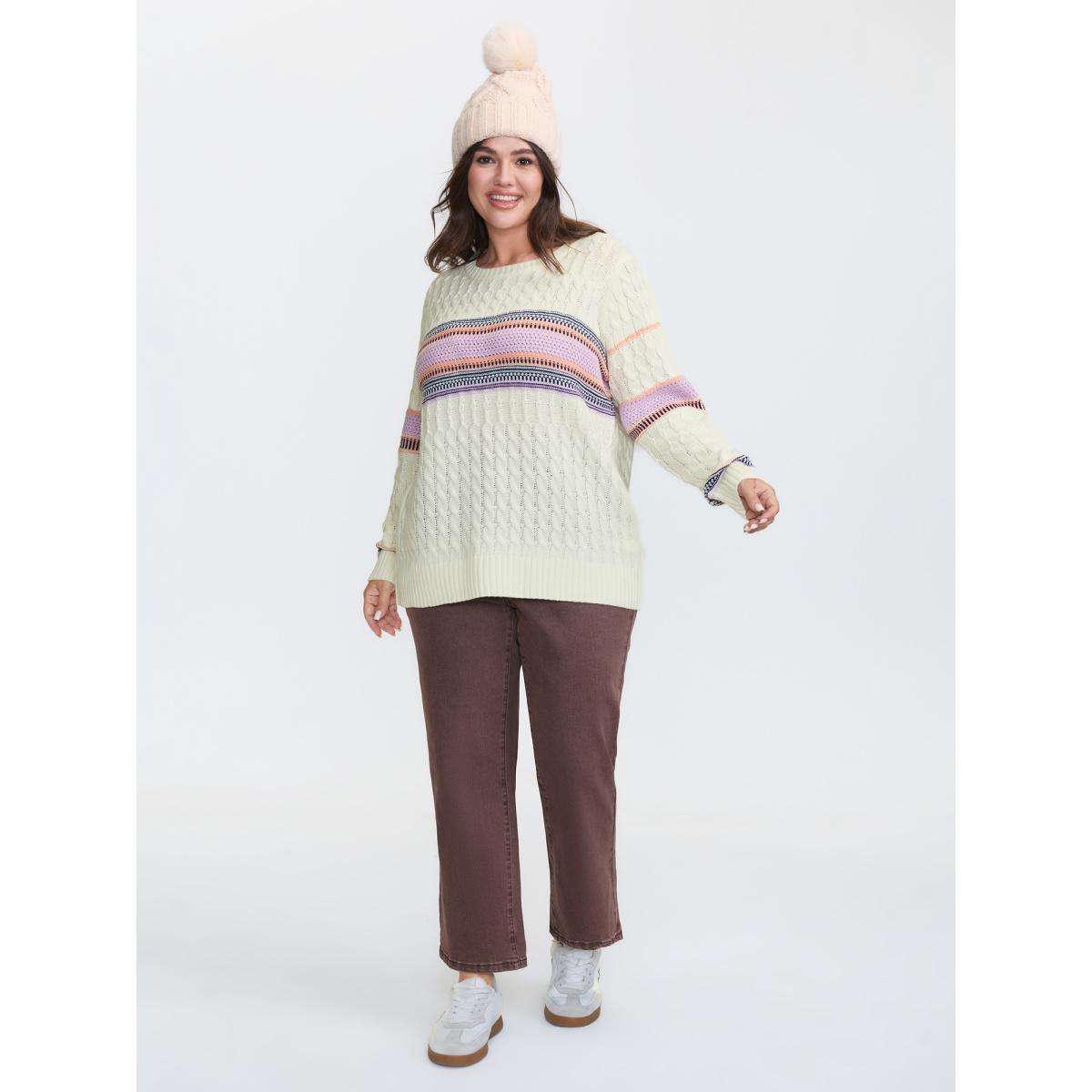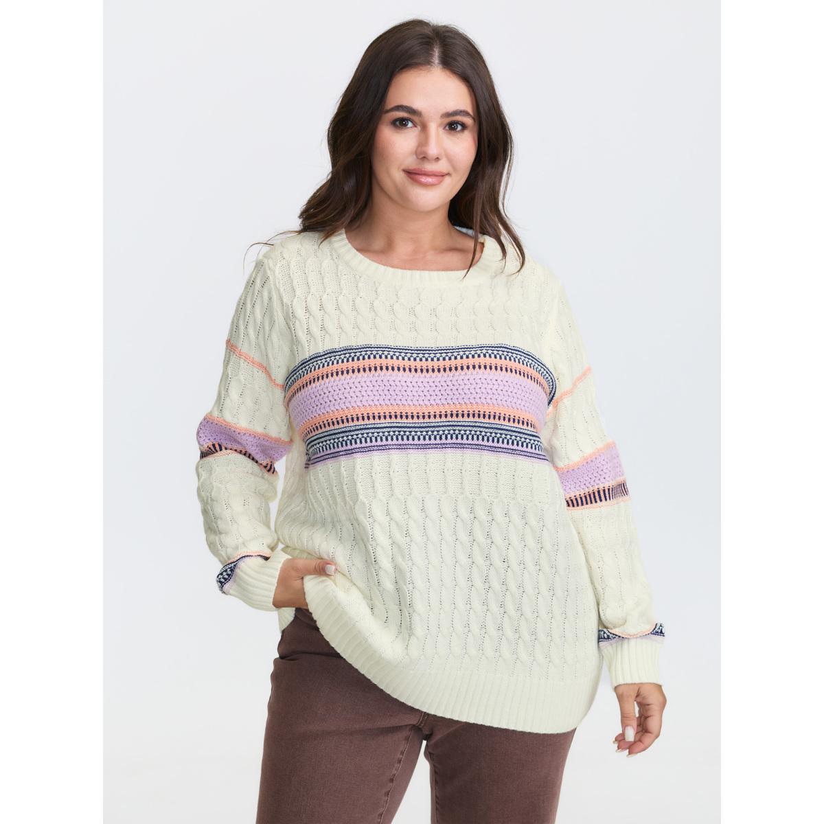 Plus Size Boho Pattern Jacquard Pullover Originalwhite Women Leisure Loose Long Sleeve Round Neck Casual Pullovers BloomChic 12/L