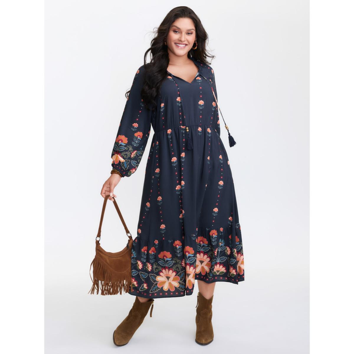 Plus Size Boho Floral Neck Tie Midi Dress DarkBlue Women Boho Notched collar Half Sleeve Curvy BloomChic 30/6X