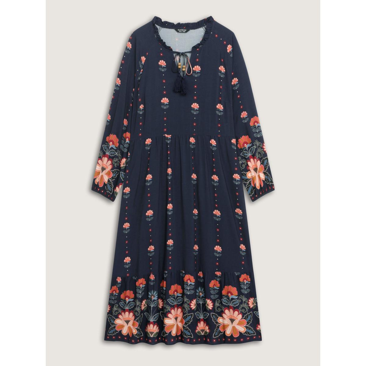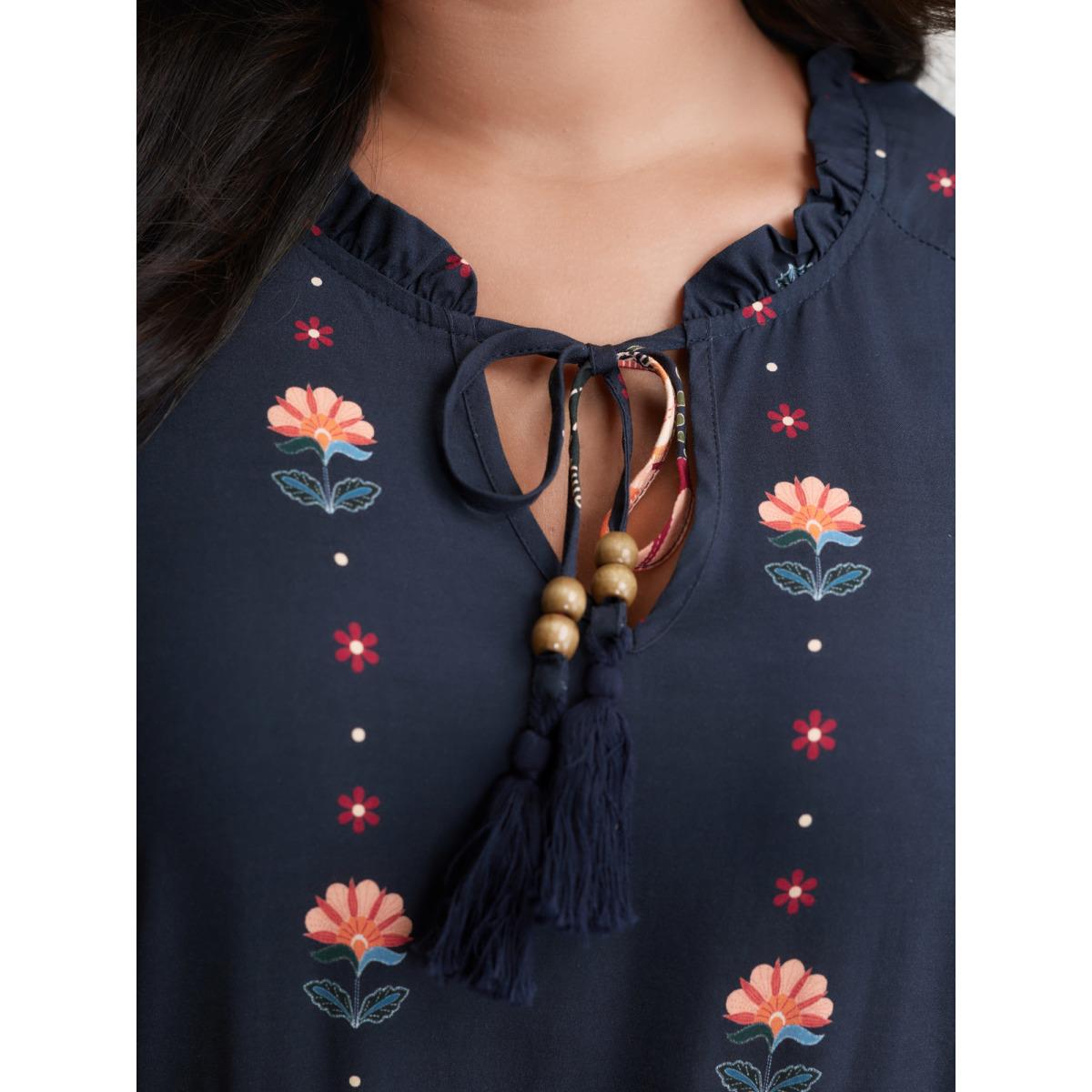 Plus Size Boho Print Notched Ties Tassel Trim Dress Blue Women Boho Non Flat collar with V-notch Short sleeve Curvy BloomChic 26/4X