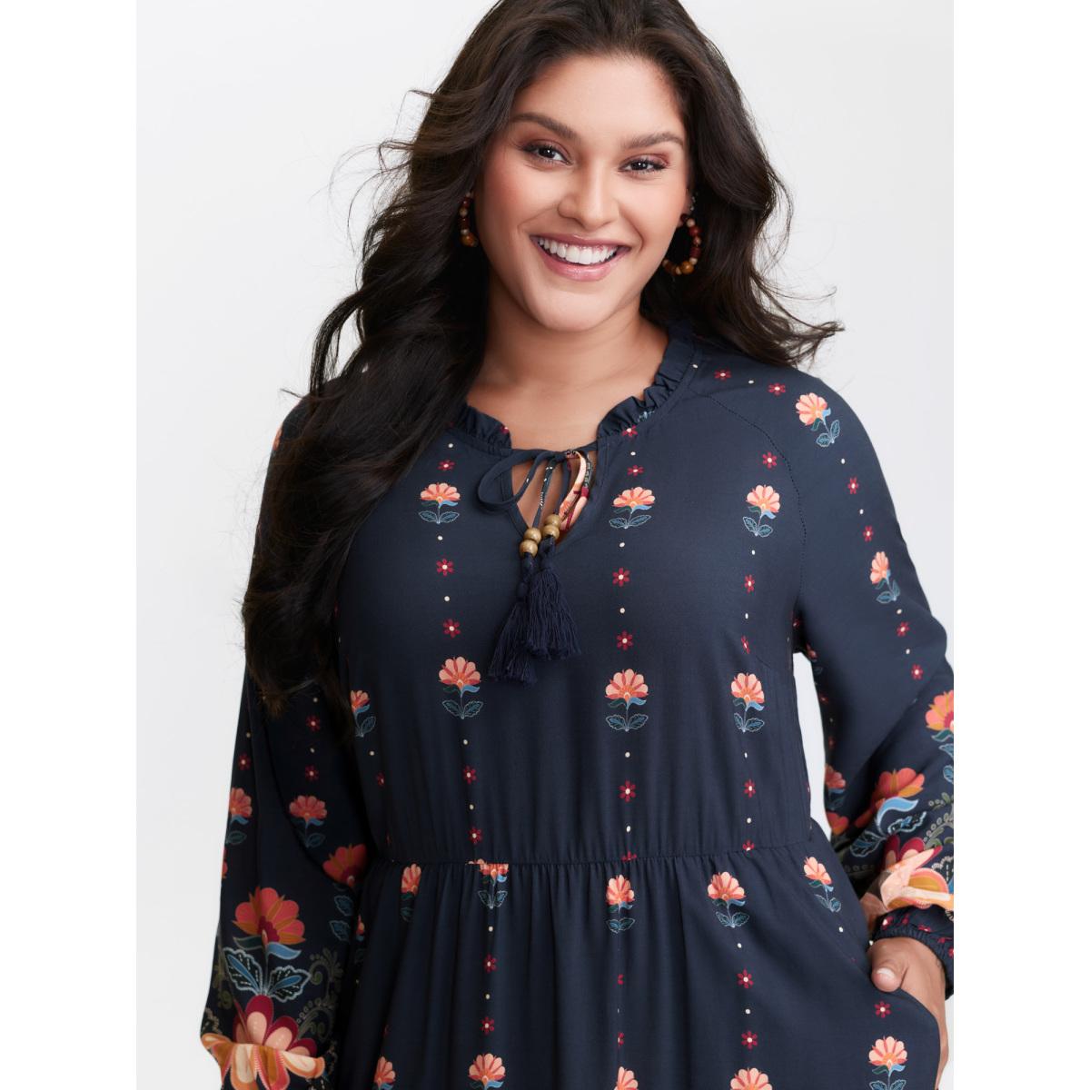 Plus Size Boho Print Tassel-Tie Pockets Midi Dress DarkBlue Women Resort Woven ribbon&lace trim V-neck Short sleeve Curvy BloomChic 18-20/2X
