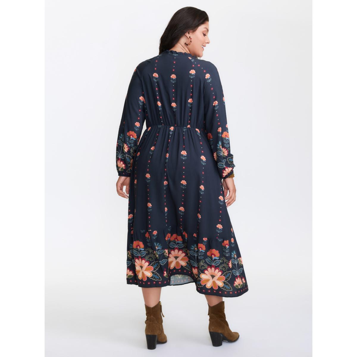 Plus Size Boho Print Overlap Collar Elastic Waist Belted Dress DarkBlue Women Resort Elastic cuffs Overlap Collar Long Sleeve Curvy Midi Dress BloomChic 30/6X