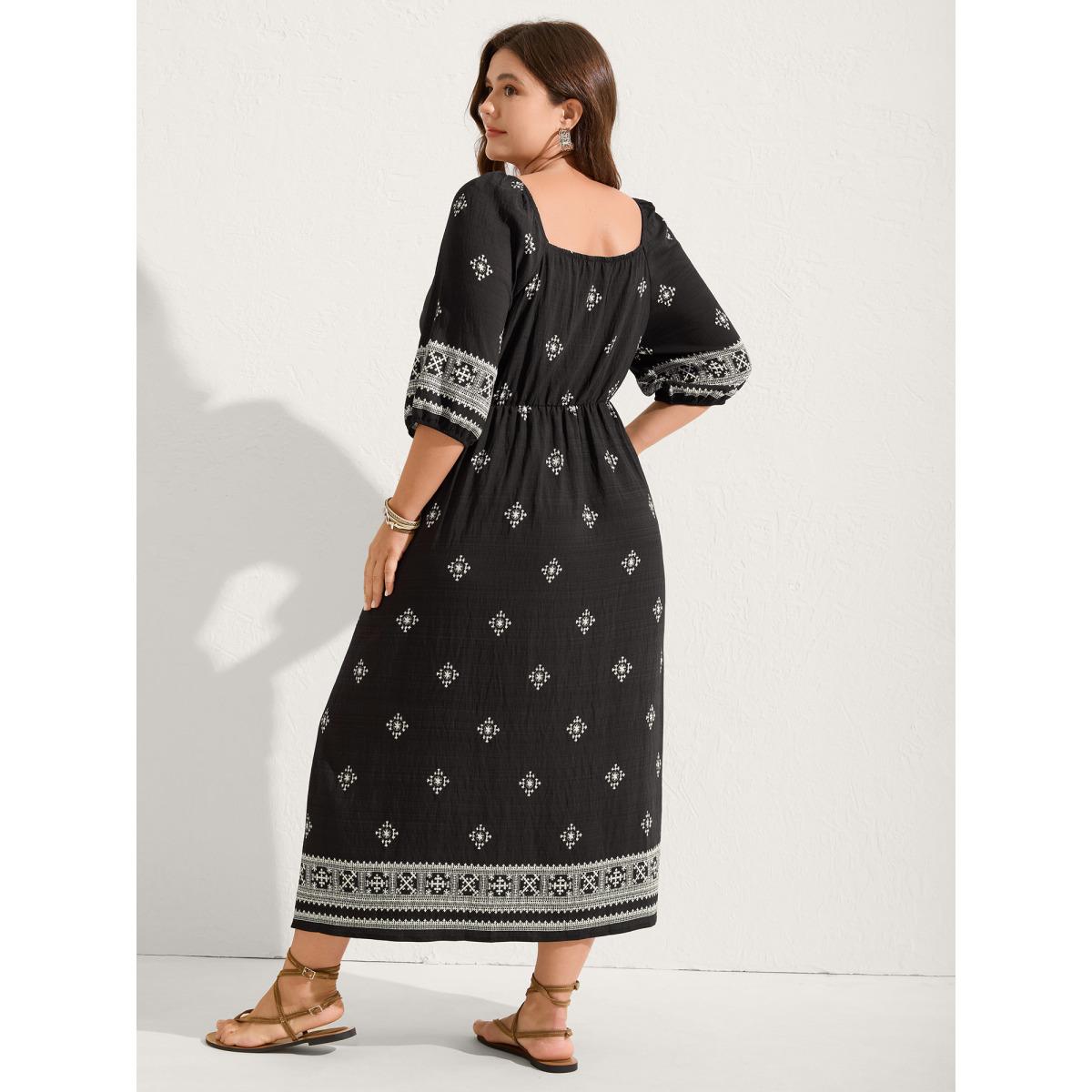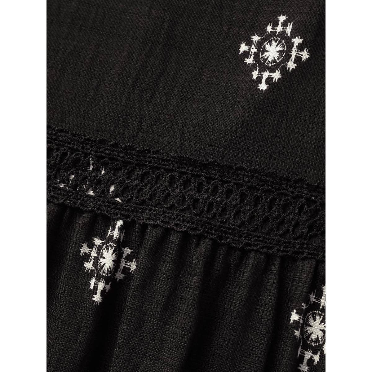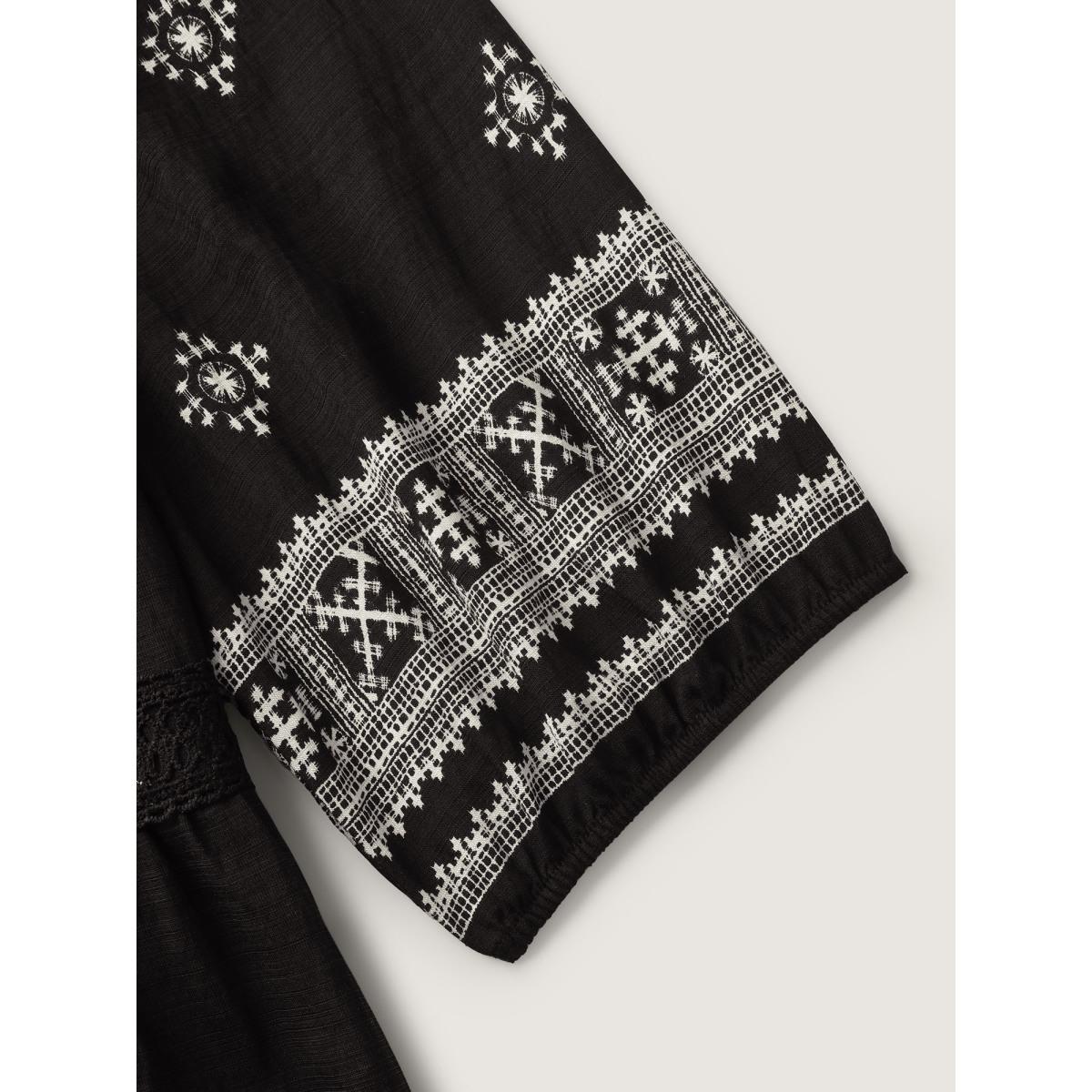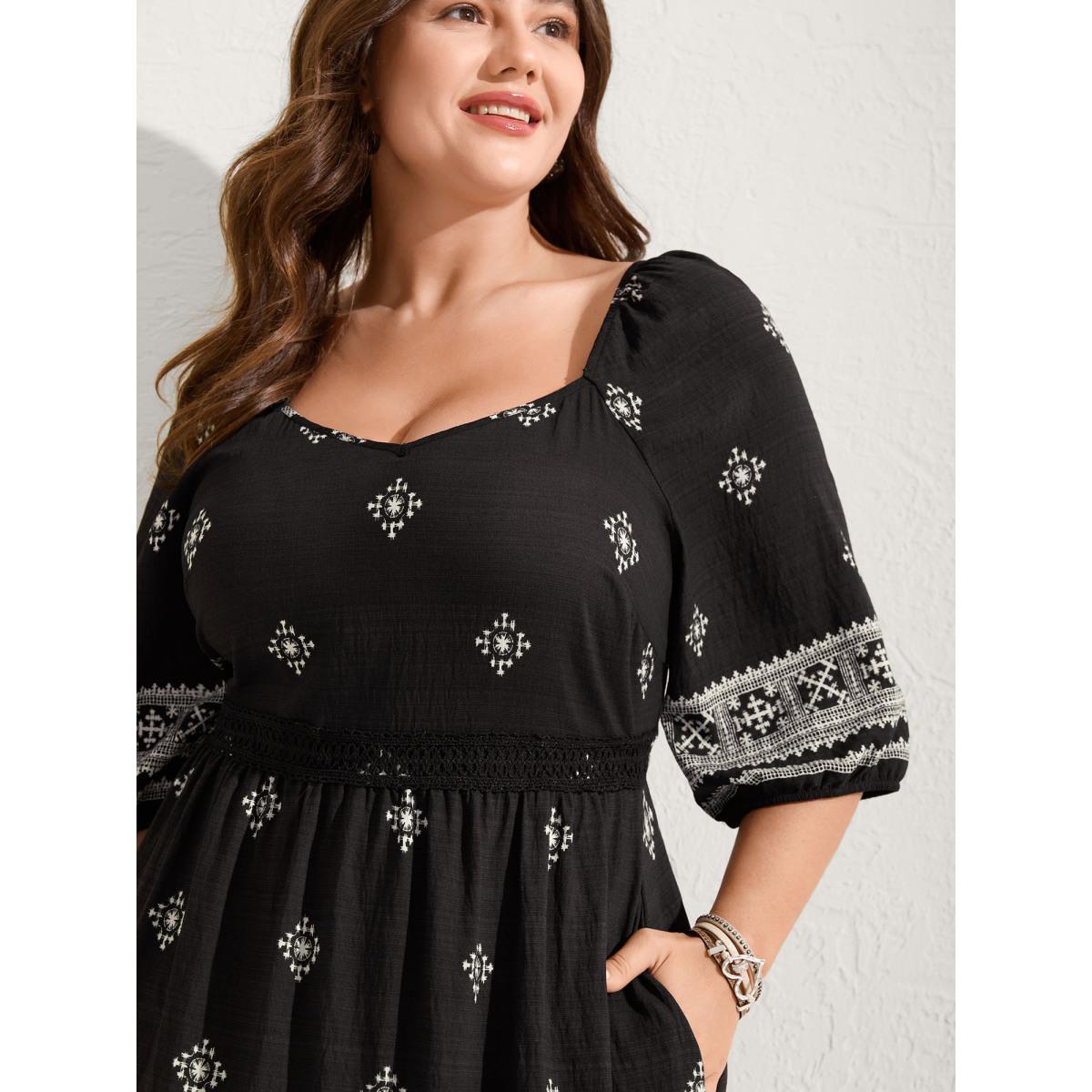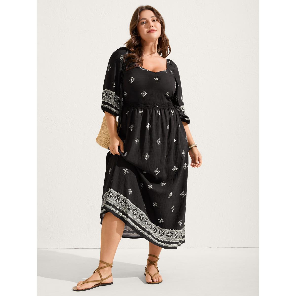 Plus Size Boho Print Waist-Defining Lace Midi Dress Black Women Boho Woven ribbon&lace trim Heart neckline Elbow-length sleeve Curvy BloomChic 28/5X