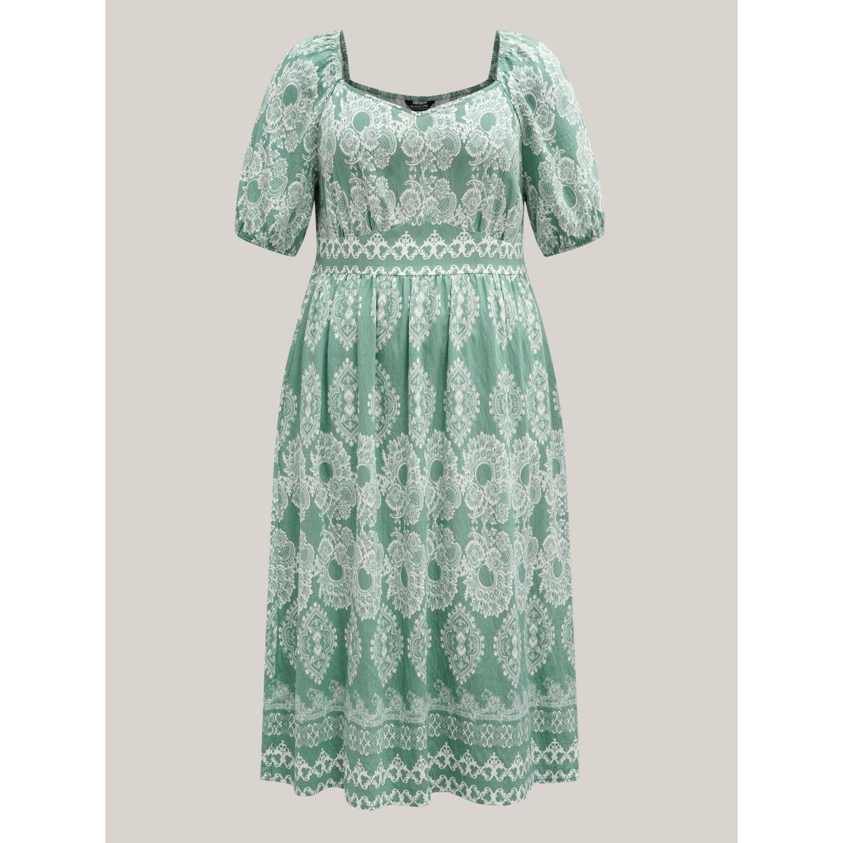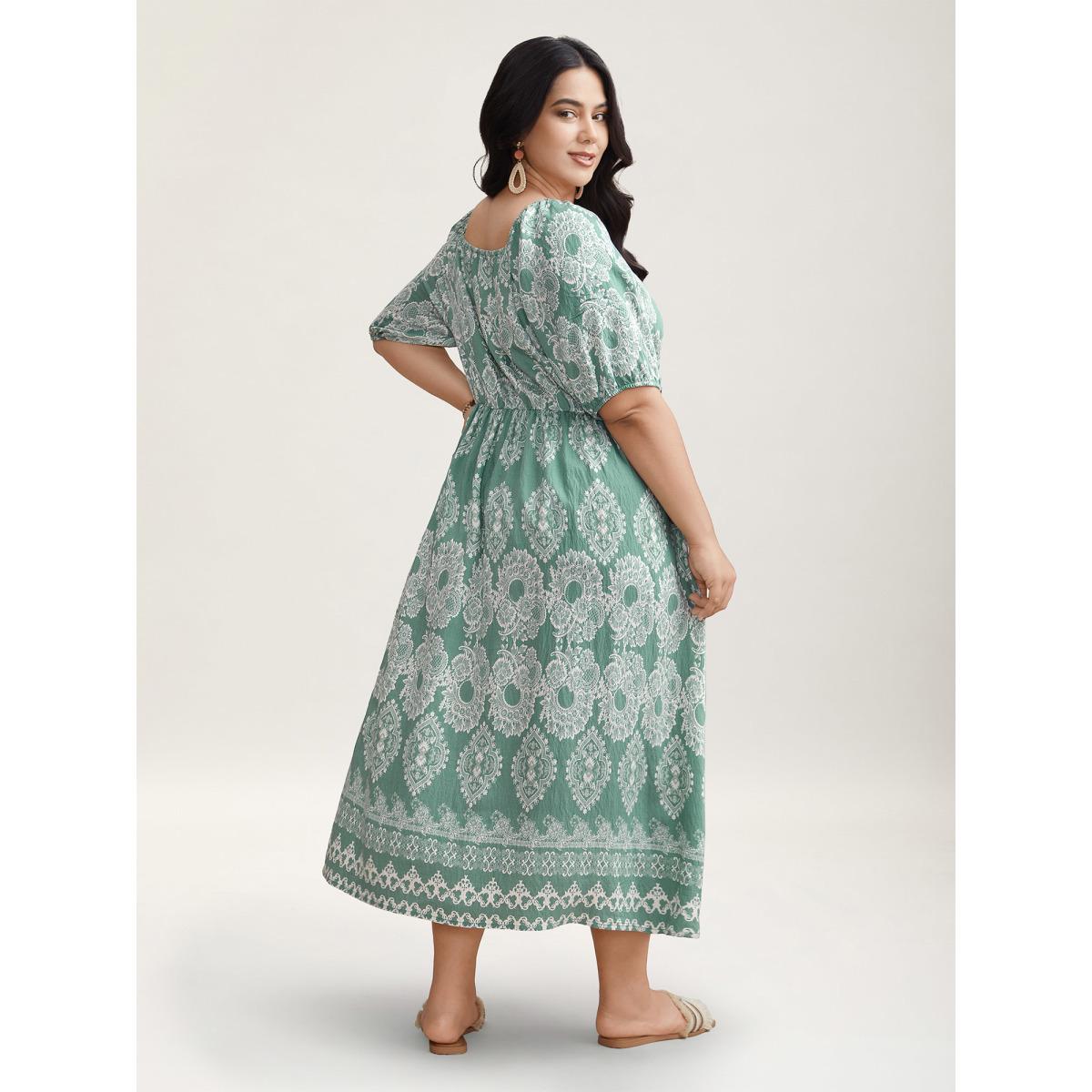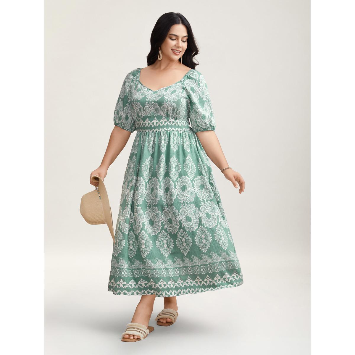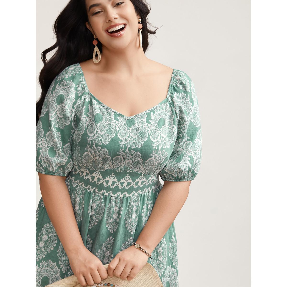 Plus Size Boho Print Waist Defining Midi Dress Sage Women Boho Non Heart neckline Half Sleeve Curvy BloomChic 28/5X