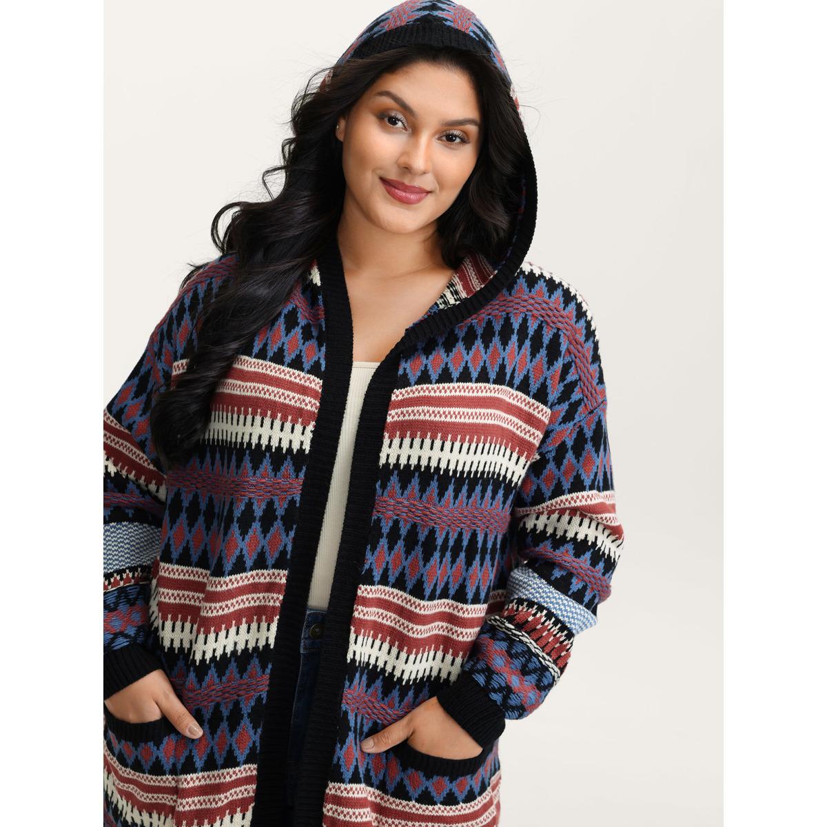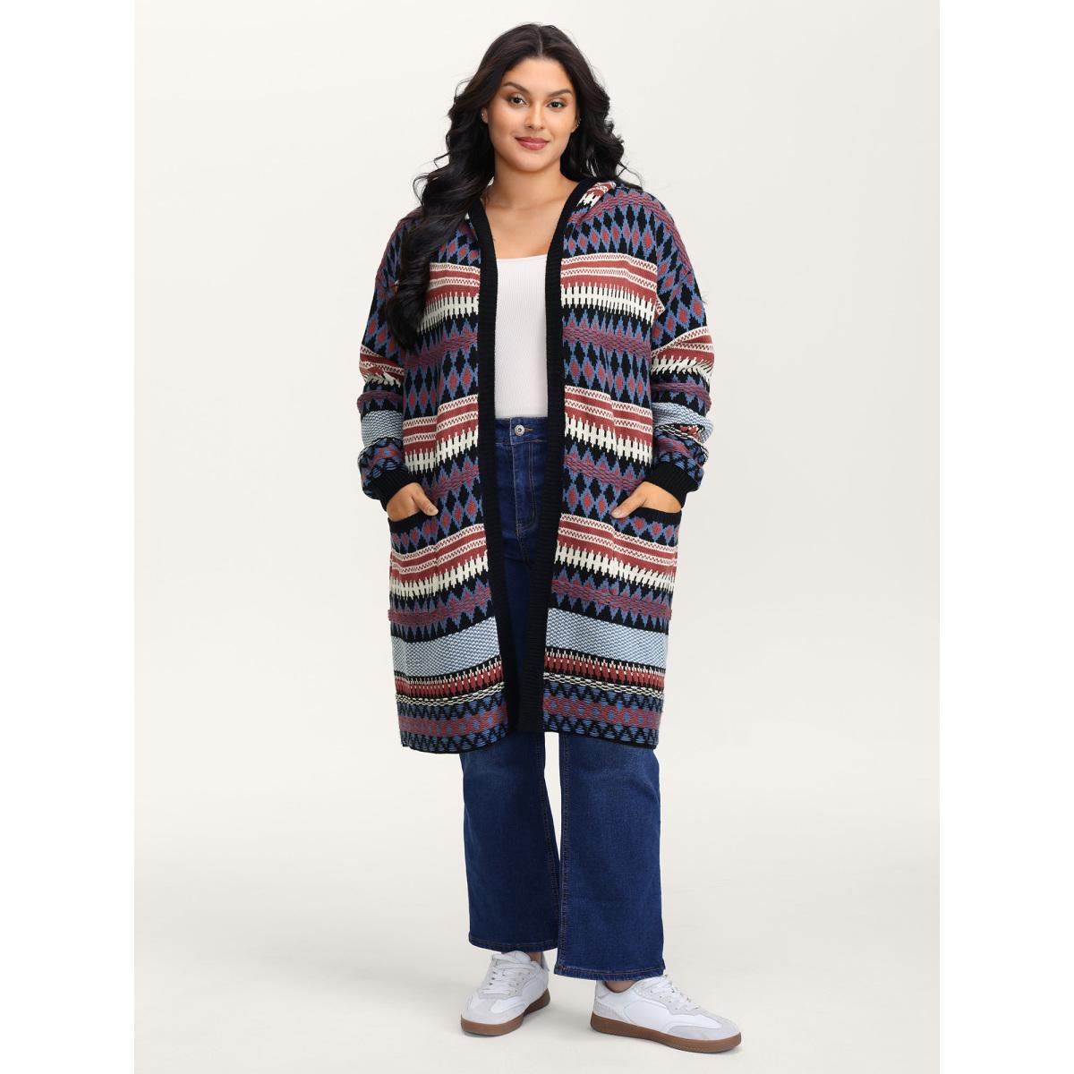 Plus Size Boho Stripe Pockets Hooded Long Knit Cardigan Black Women Leisure Loose Long Sleeve Casual Cardigans BloomChic 10/M