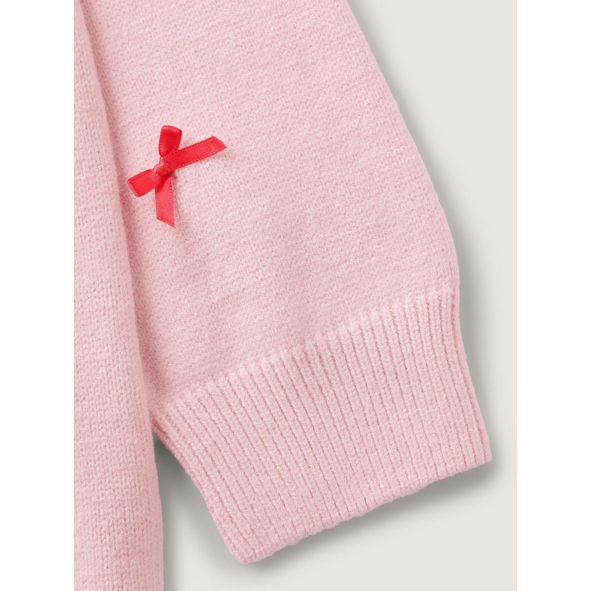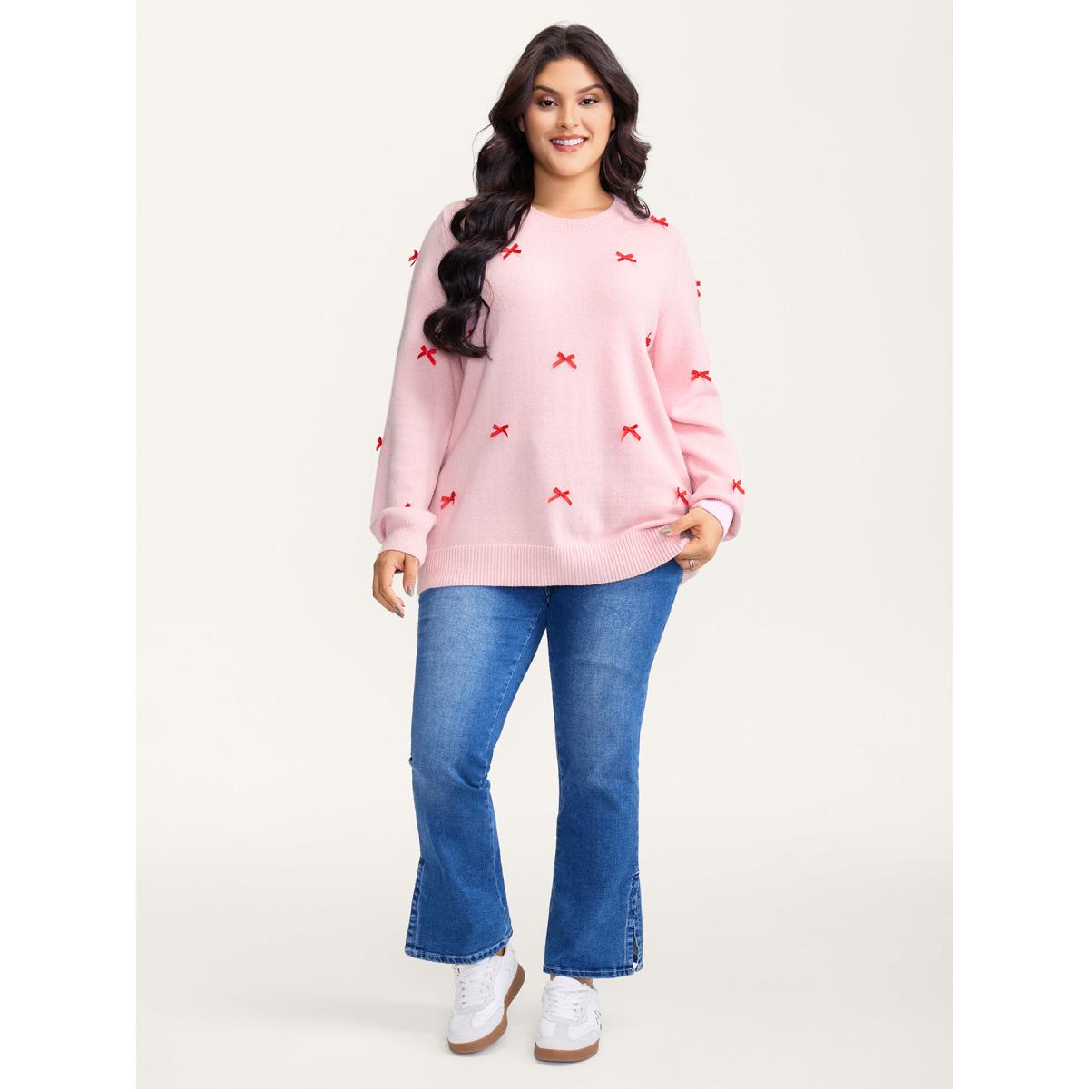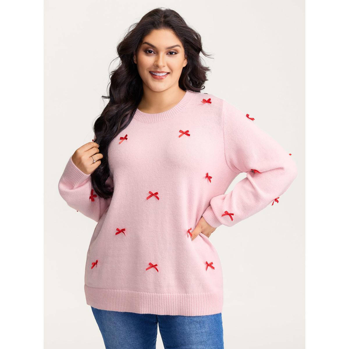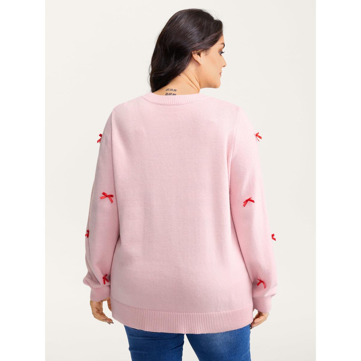 Plus Size Bowknot Detail Ribbed Hem Pullover Lightpink Women Playful Loose Short sleeve Round Neck Casual Pullovers BloomChic 14-16/1X