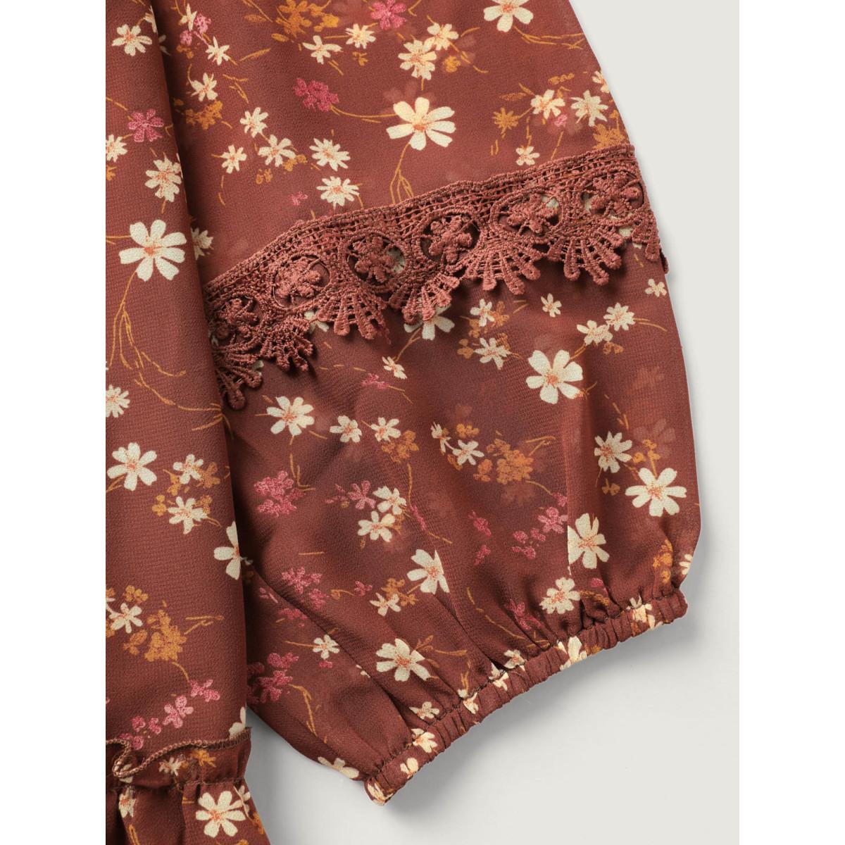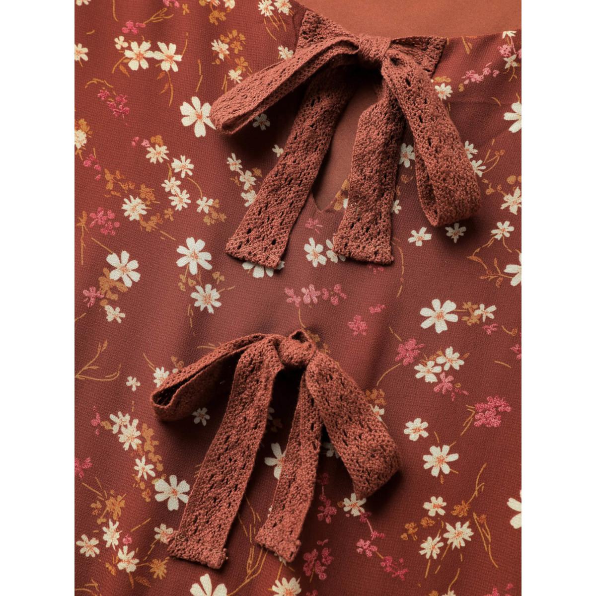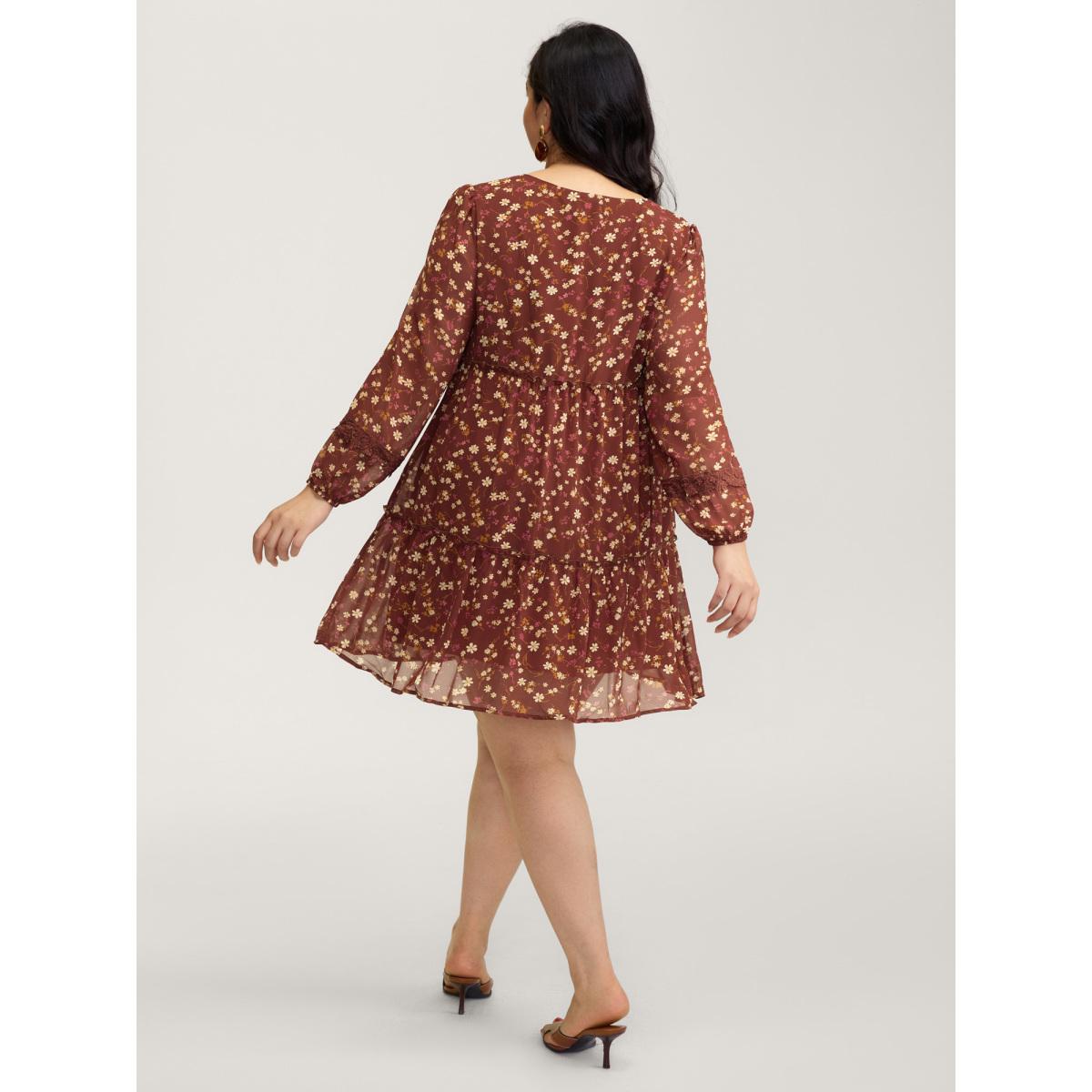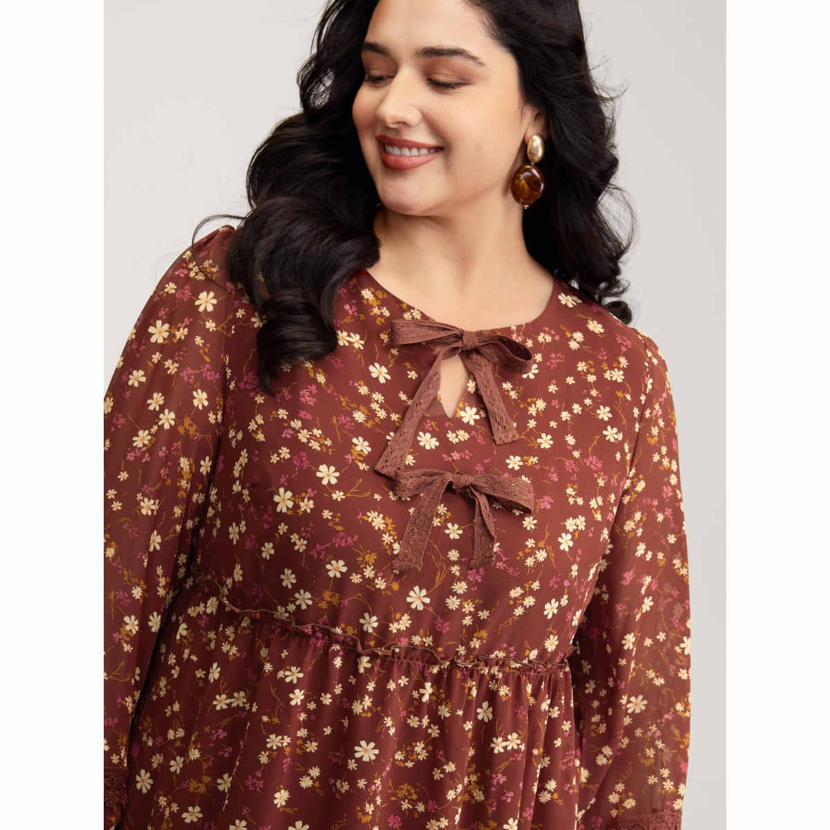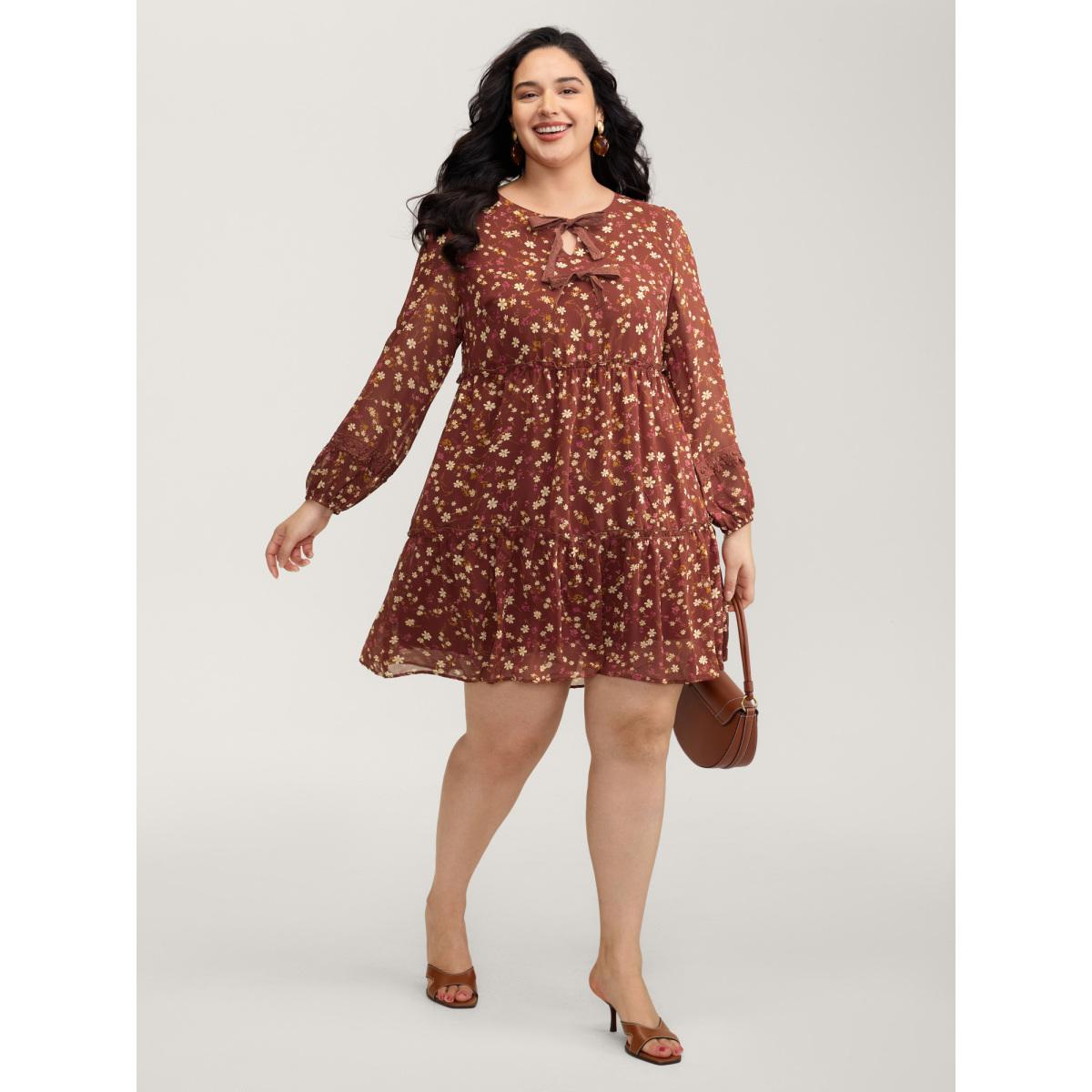 Plus Size Bowknot Neckline Lace Trim Knee-Length Dress Rust Women Timeless Woven ribbon&lace trim Round Neck Extra Long Sleeve Curvy BloomChic 30/6X